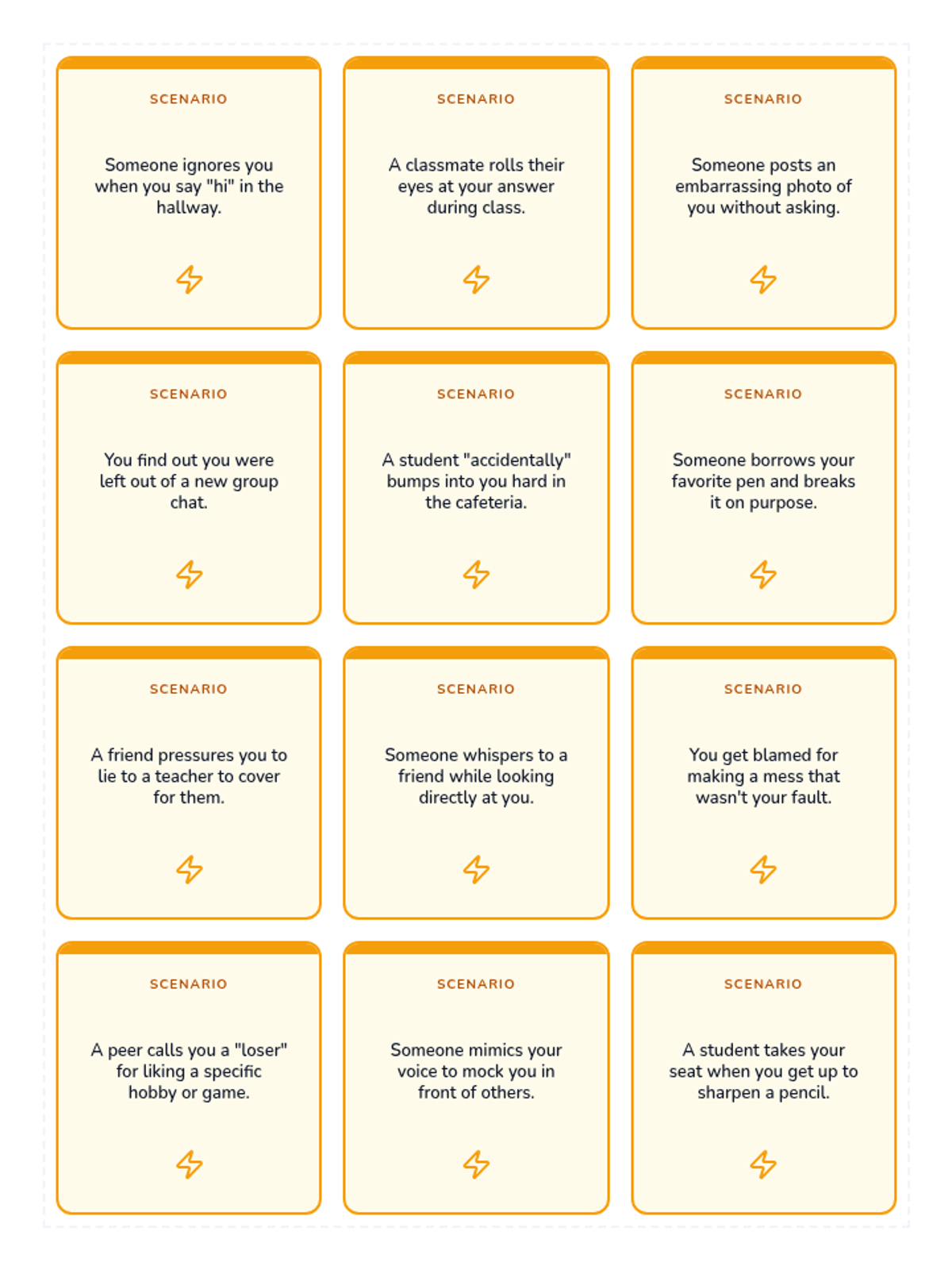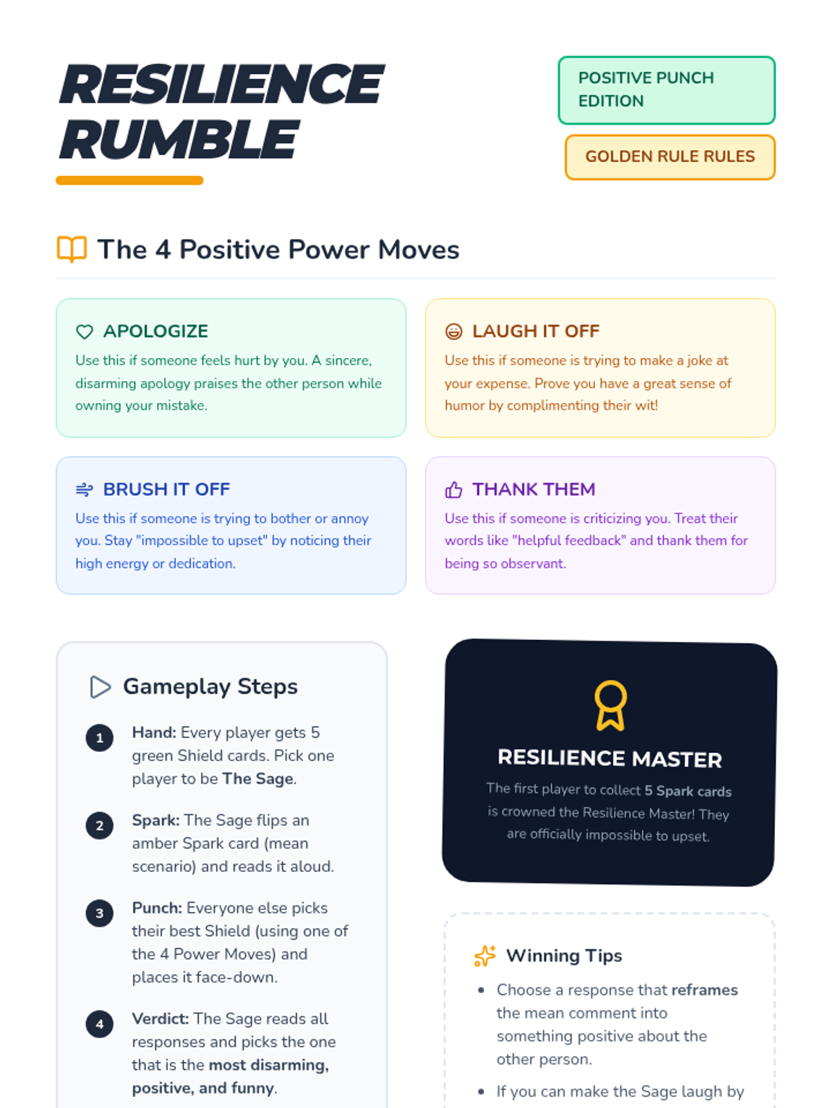 A social-emotional learning card game where students practice resilient responses to difficult social situations, physical bullying, and peer pressure following the Golden Rule.