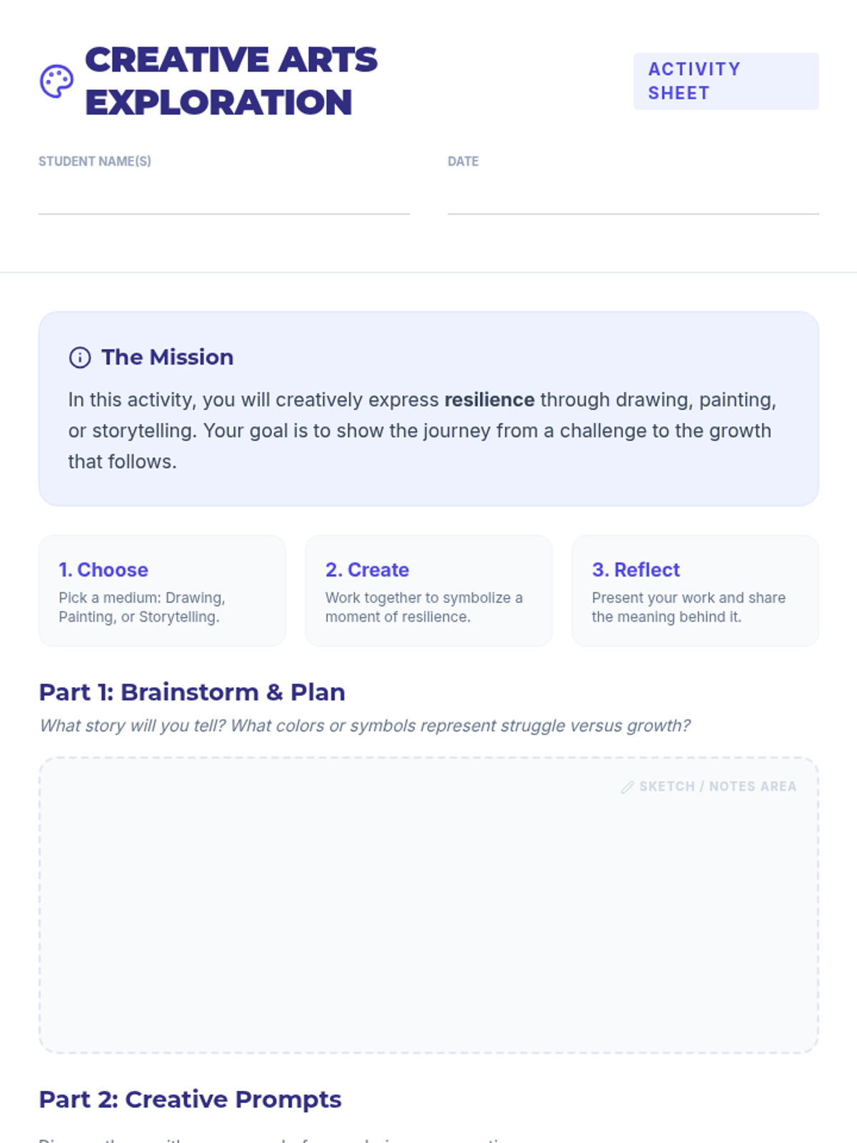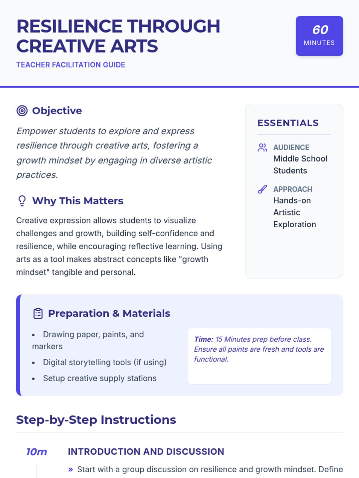 A middle school lesson exploring resilience and growth mindset through creative arts like drawing, painting, and storytelling.