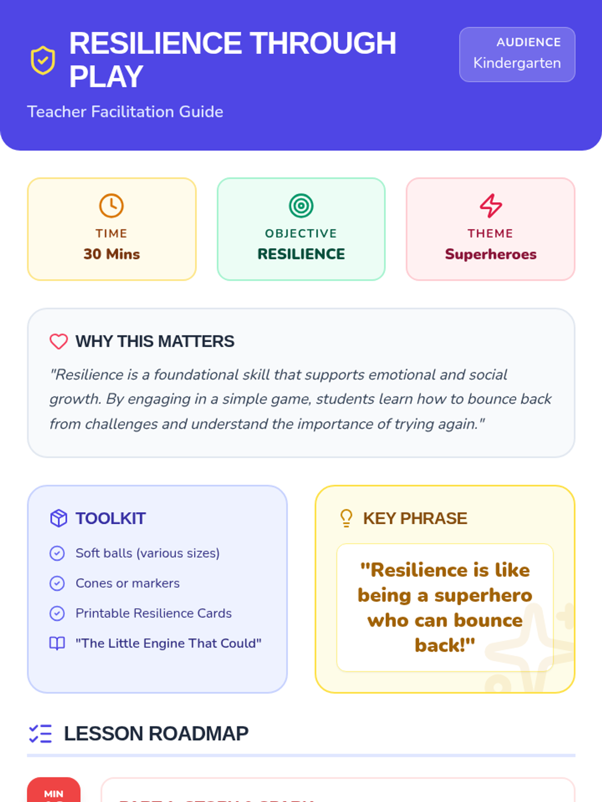 A foundational lesson for kindergarten students exploring resilience through storytelling and a playful obstacle course activity. Students learn to 'bounce back' like superheroes when facing challenges.