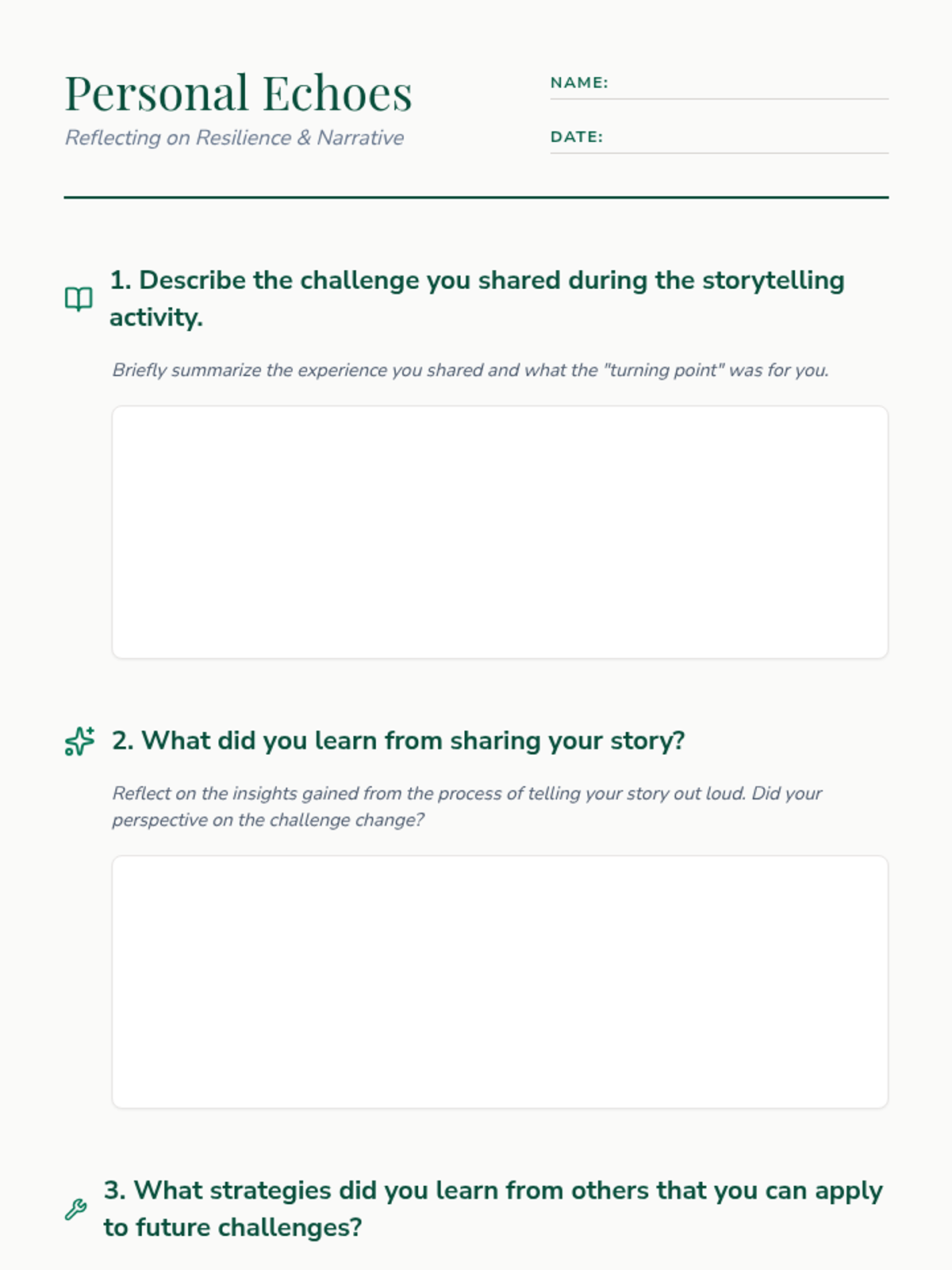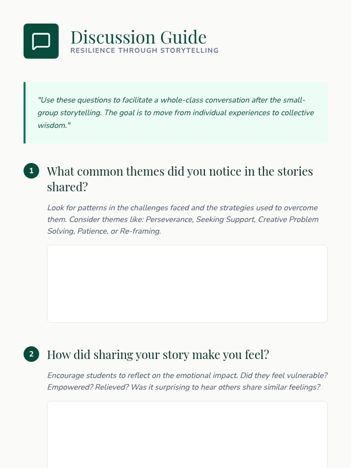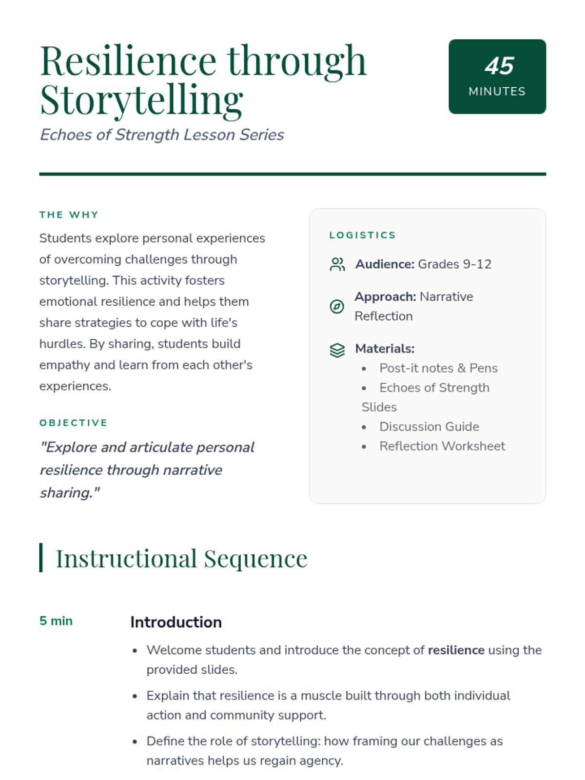 A high school lesson focused on building emotional resilience through the power of personal narrative and shared experiences. Students reflect on past challenges and learn coping strategies from peers.