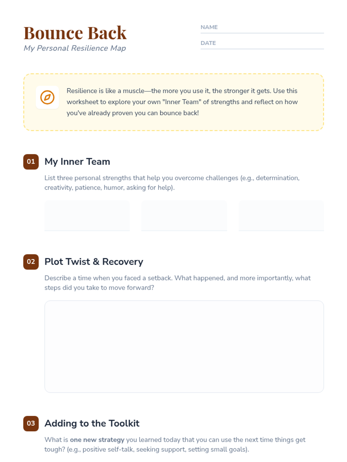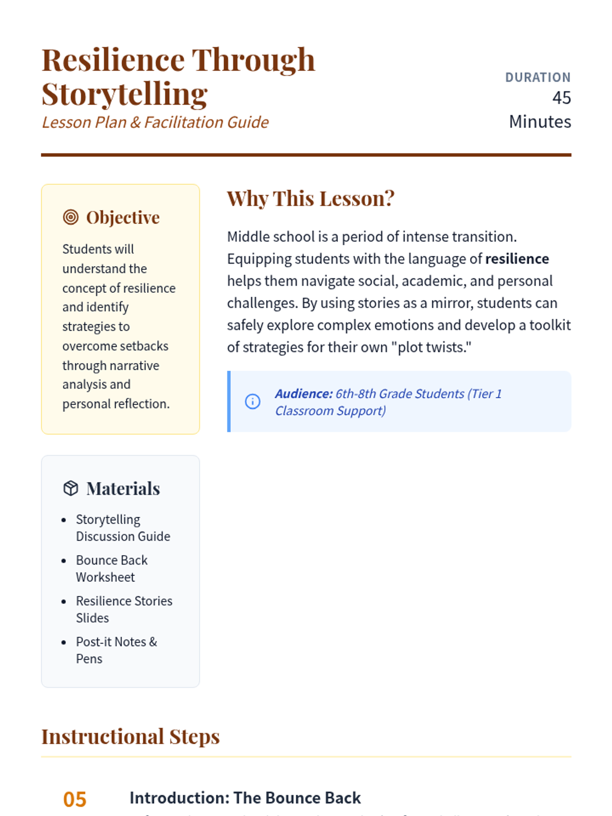 This lesson introduces students to the concept of resilience through storytelling and interactive exercises. Students will learn how to identify resilience in stories and apply resilience-building strategies in their own lives.