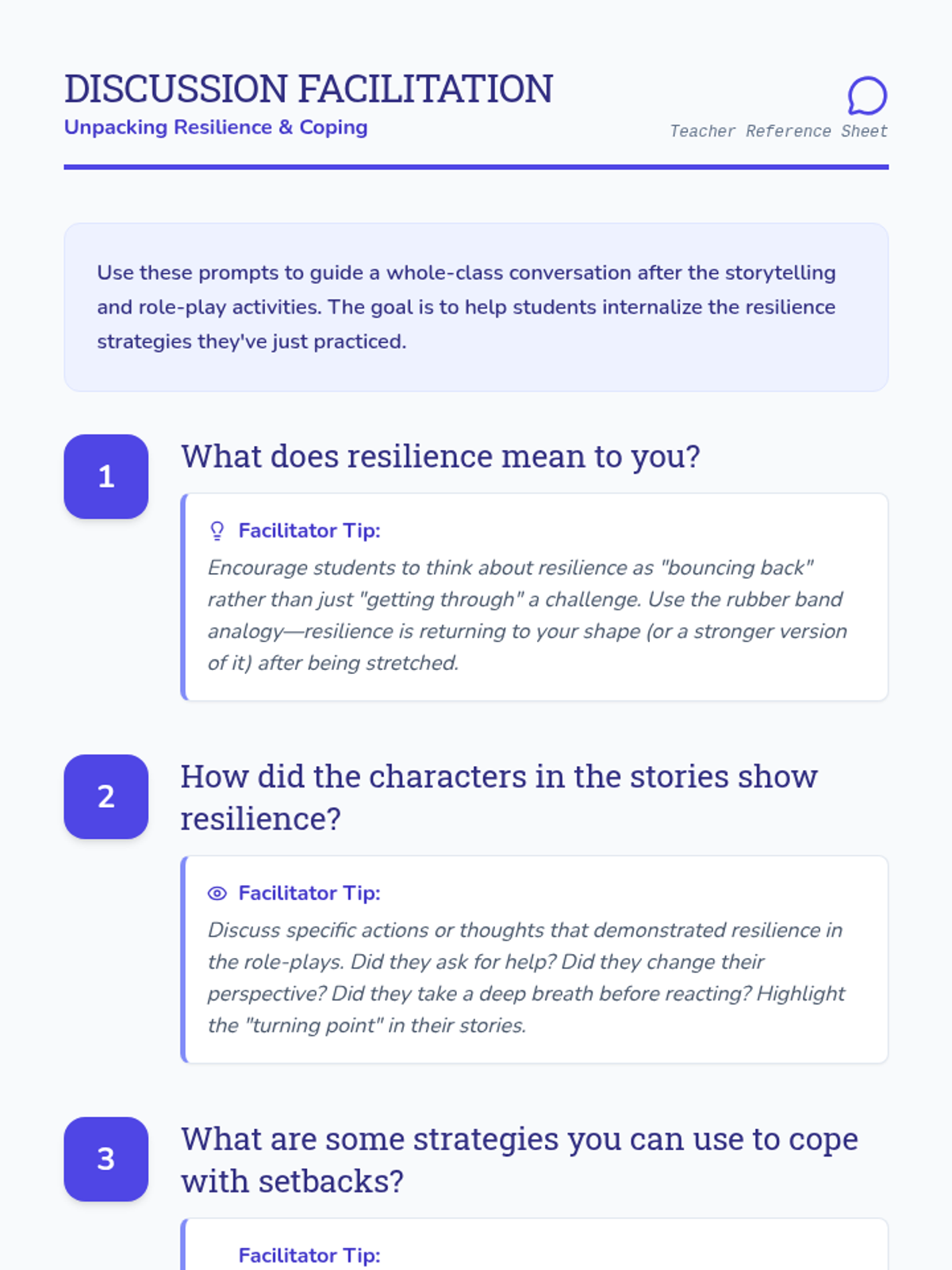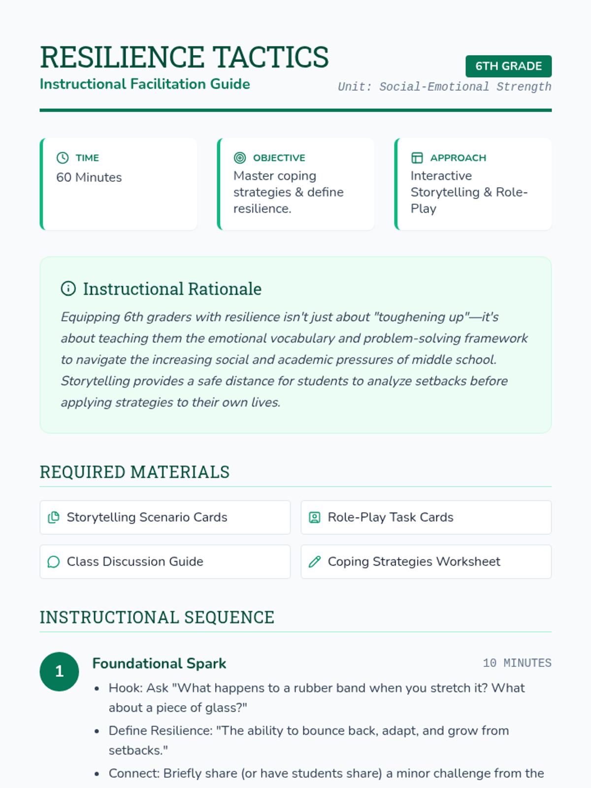 This lesson focuses on building resilience in 6th-grade students through storytelling and role-play. Students will learn how to handle challenges and setbacks in a healthy way by engaging in activities that promote empathy, problem-solving, and emotional regulation.