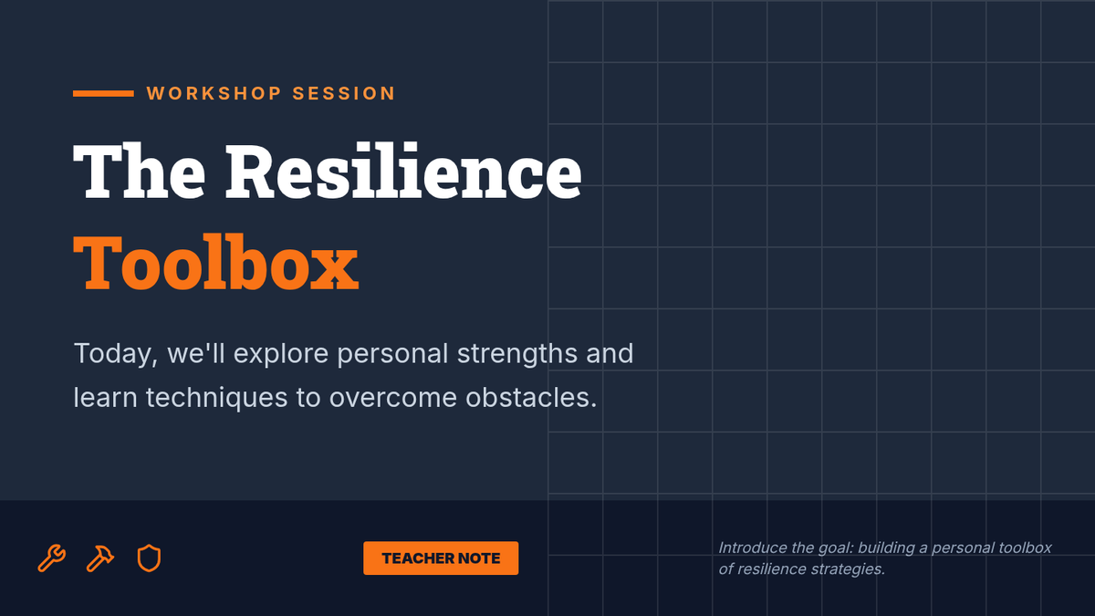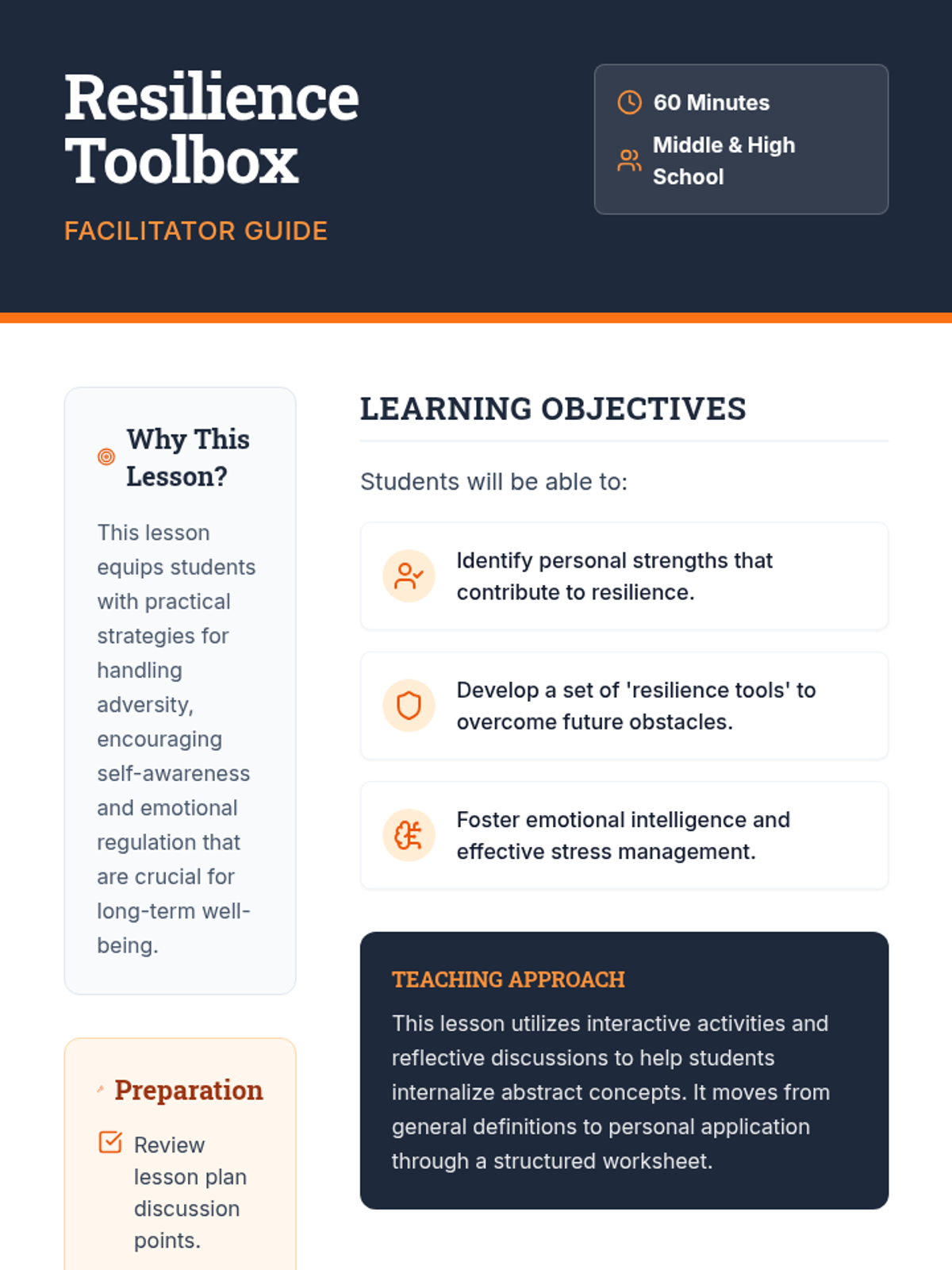A comprehensive lesson focused on building emotional resilience and practical coping strategies through the metaphor of a 'toolbox'. Students identify personal strengths and learn new techniques to handle stress and adversity.
