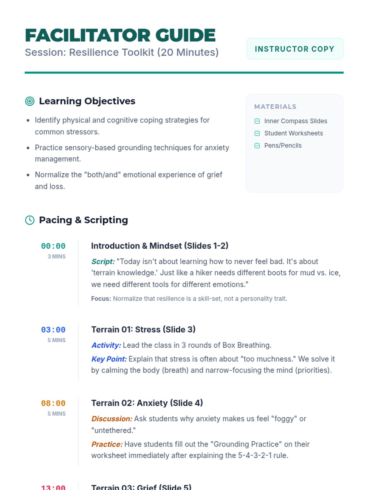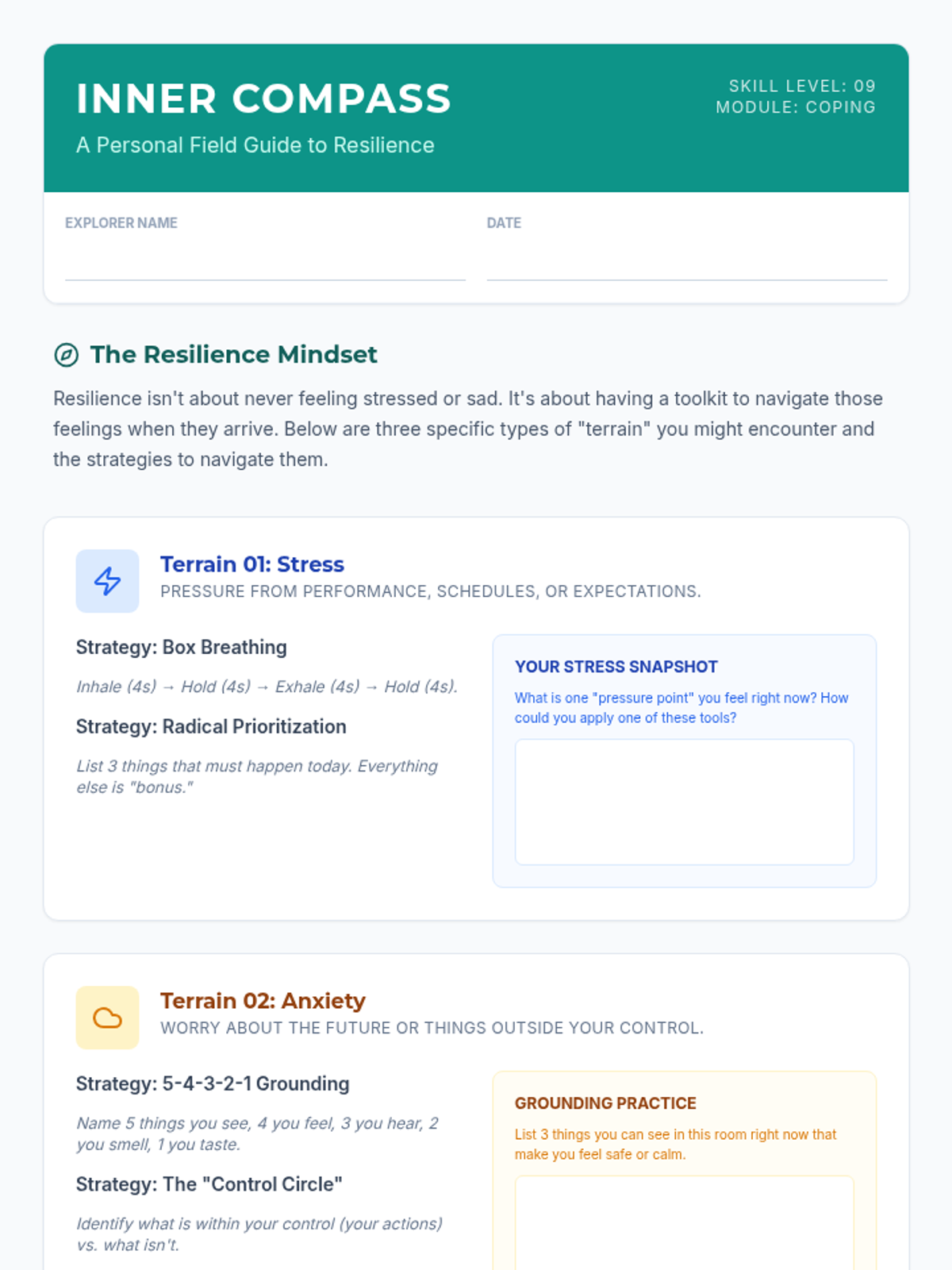 A 20-minute skill-building session for 9th-graders focusing on practical coping strategies for managing stress, anxiety, and grief to build long-term resilience.