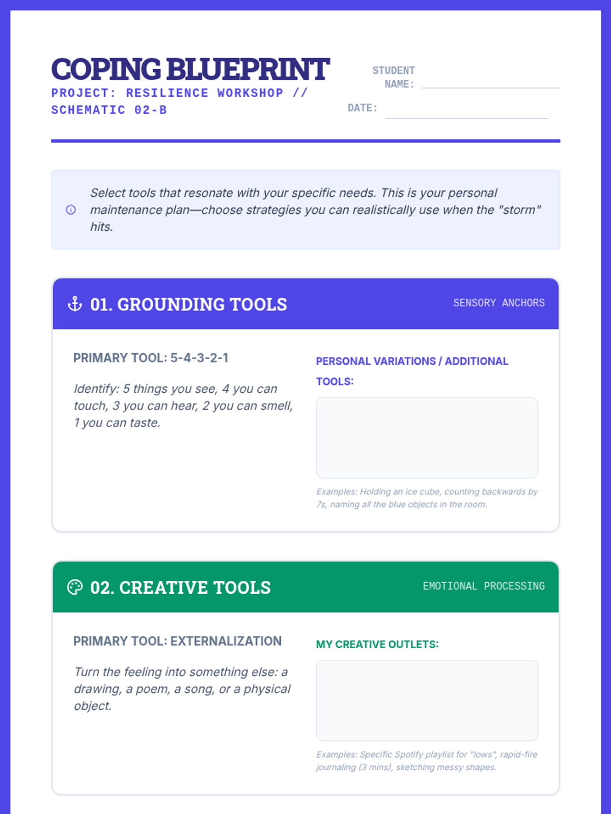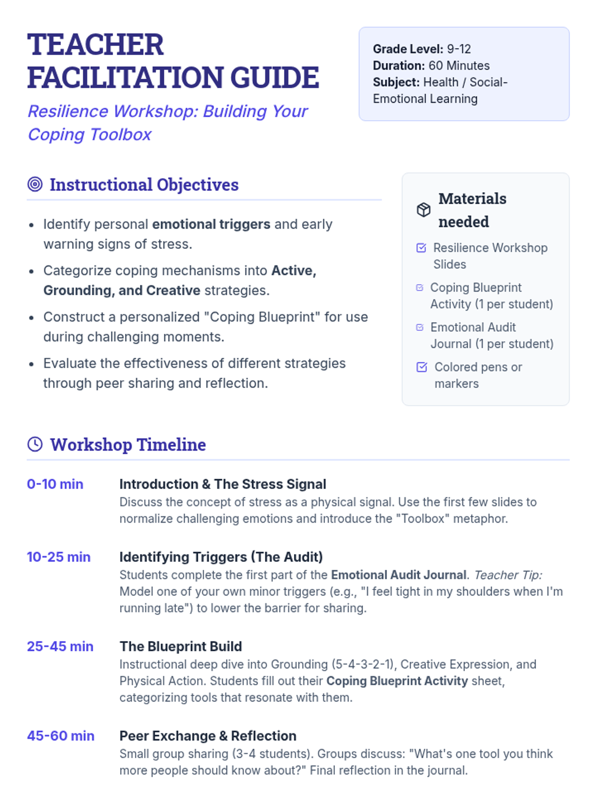High school students explore emotional regulation by identifying personal triggers and constructing a personalized 'coping toolbox.' This lesson uses a blueprint-inspired framework to teach grounding, creative, and physical strategies for mental wellness.