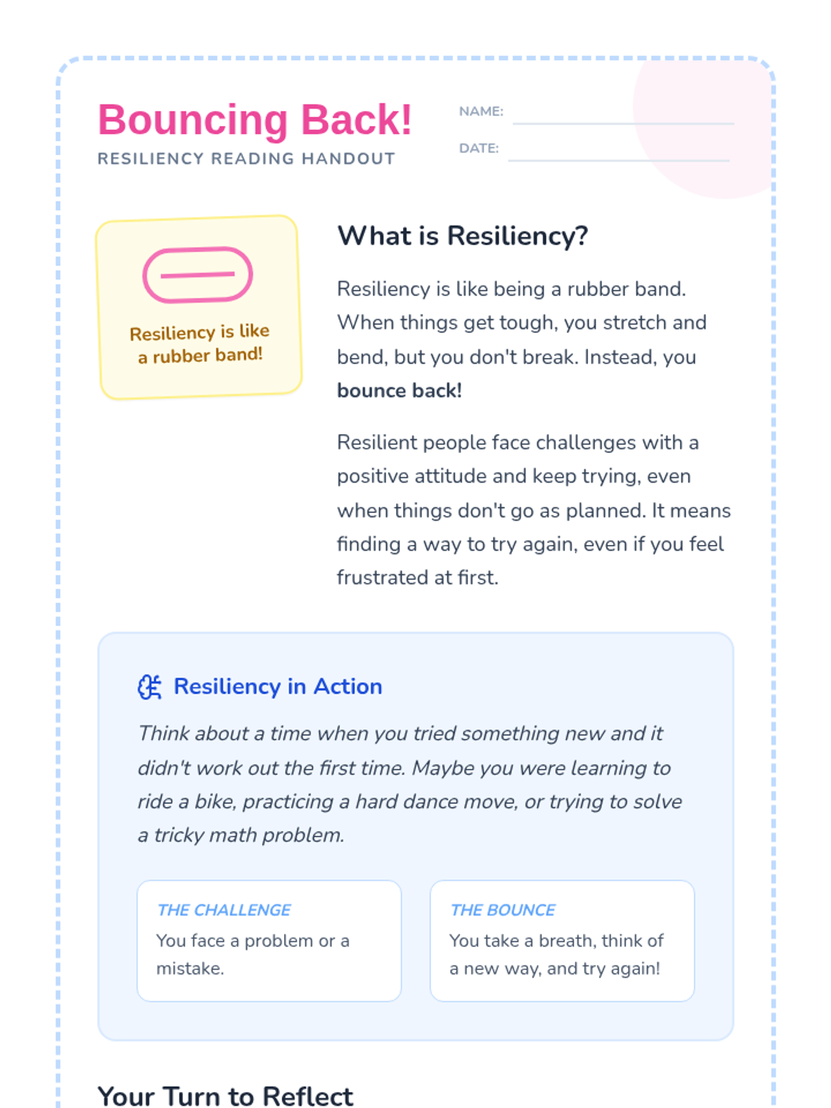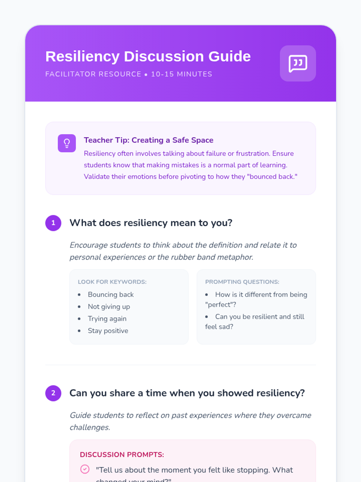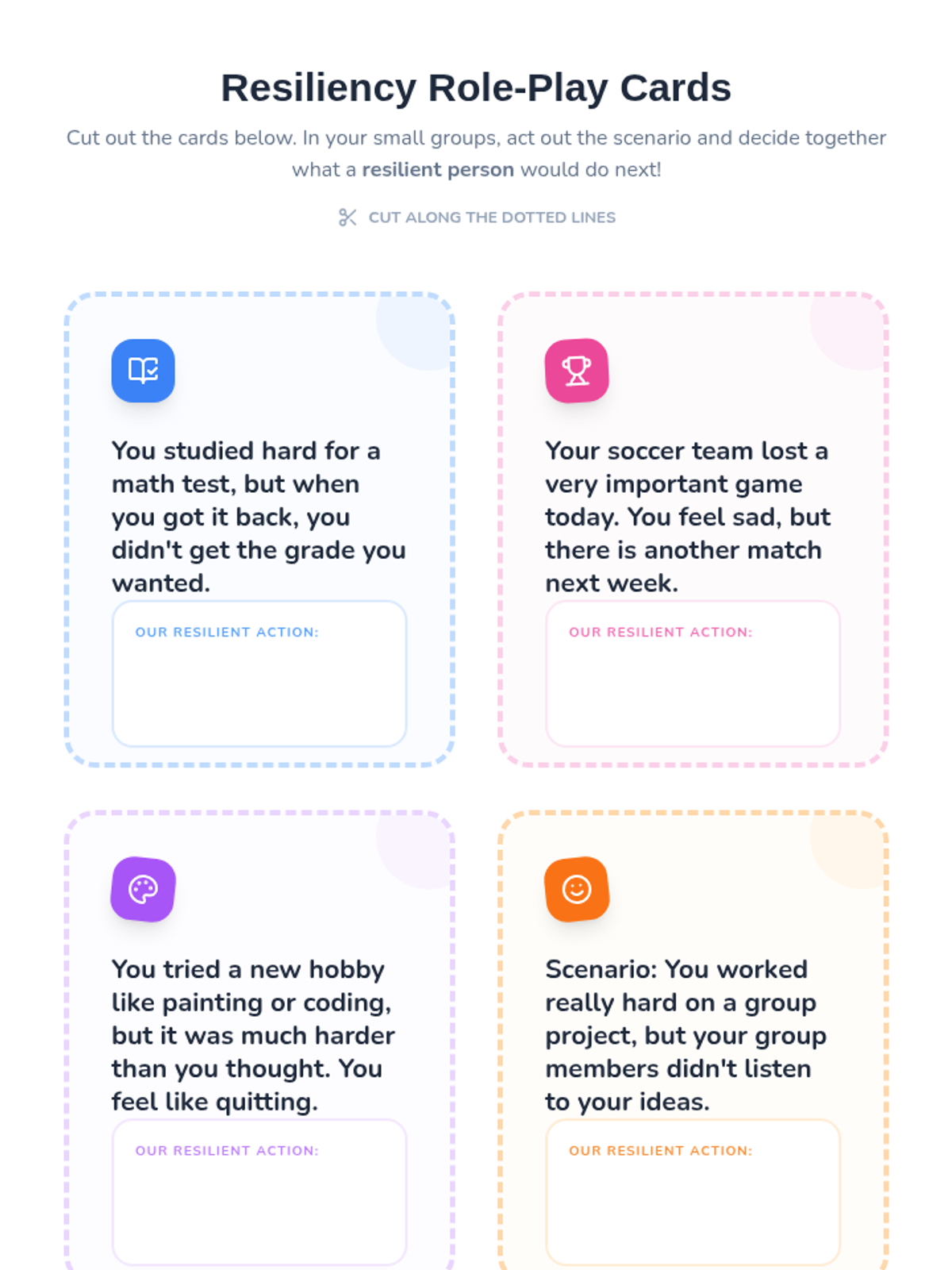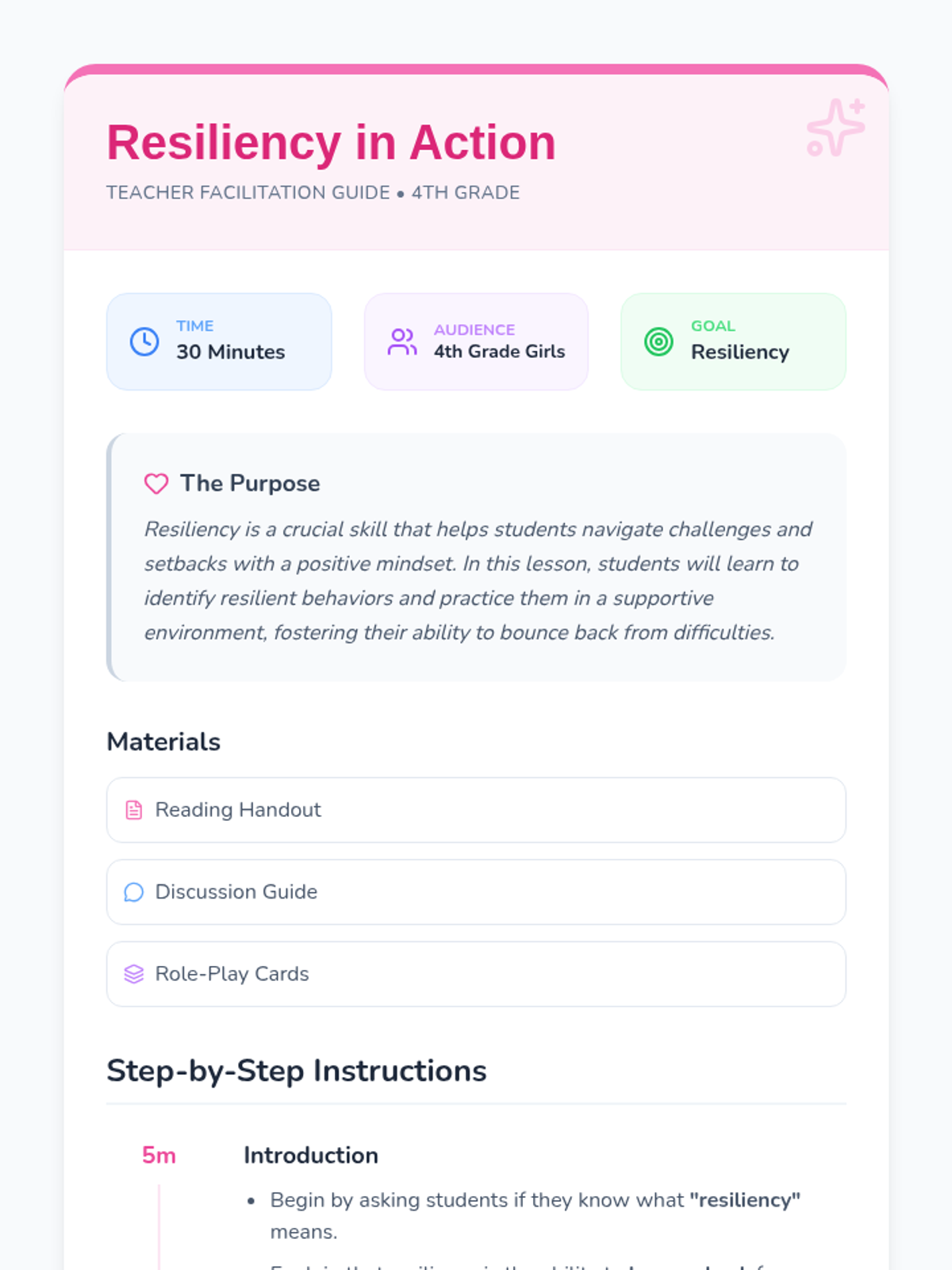 This lesson introduces 4th grade girls to the concept of resiliency through reading, discussion, and a hands-on role-play activity, helping them navigate challenges with a positive mindset.