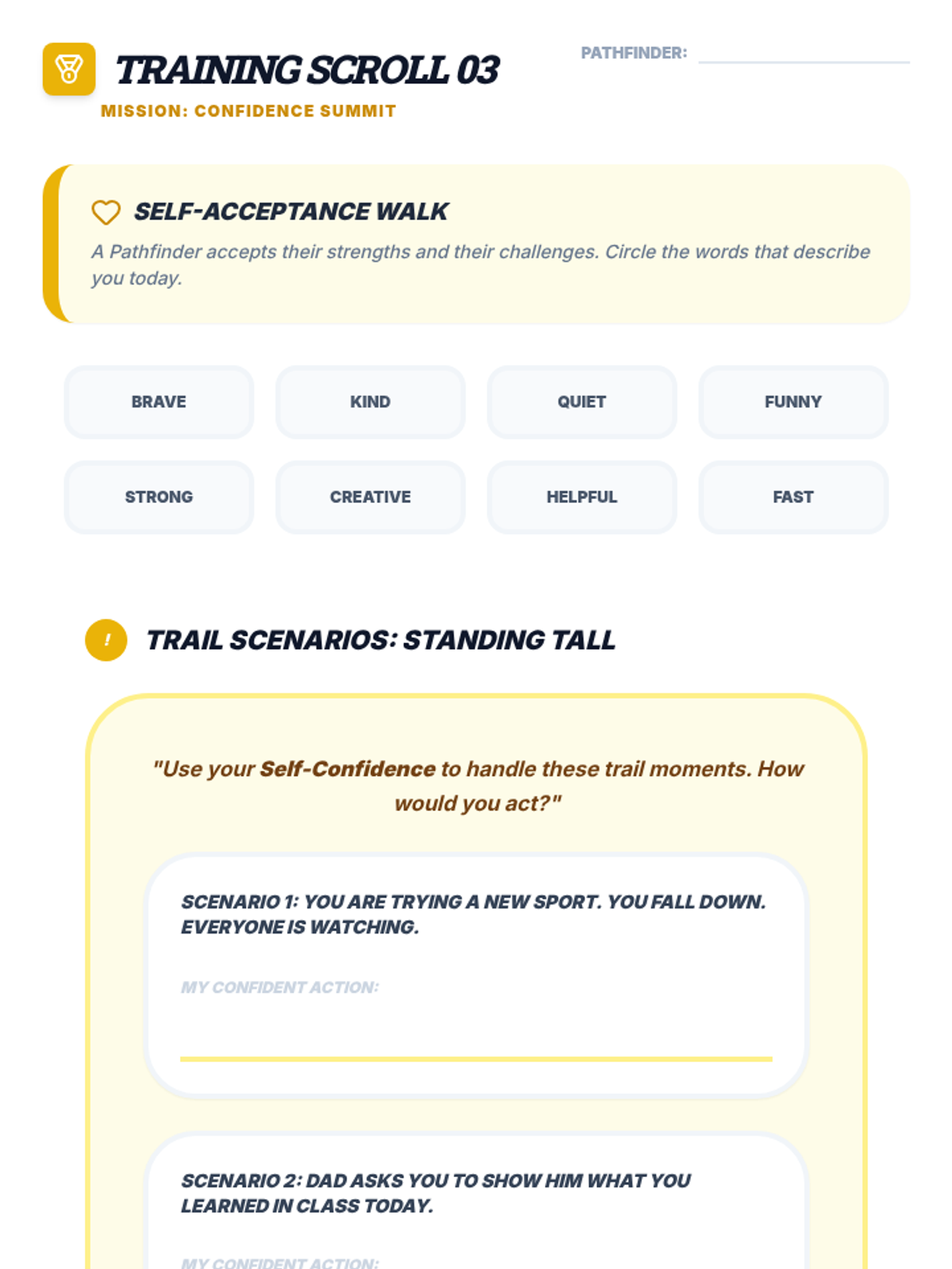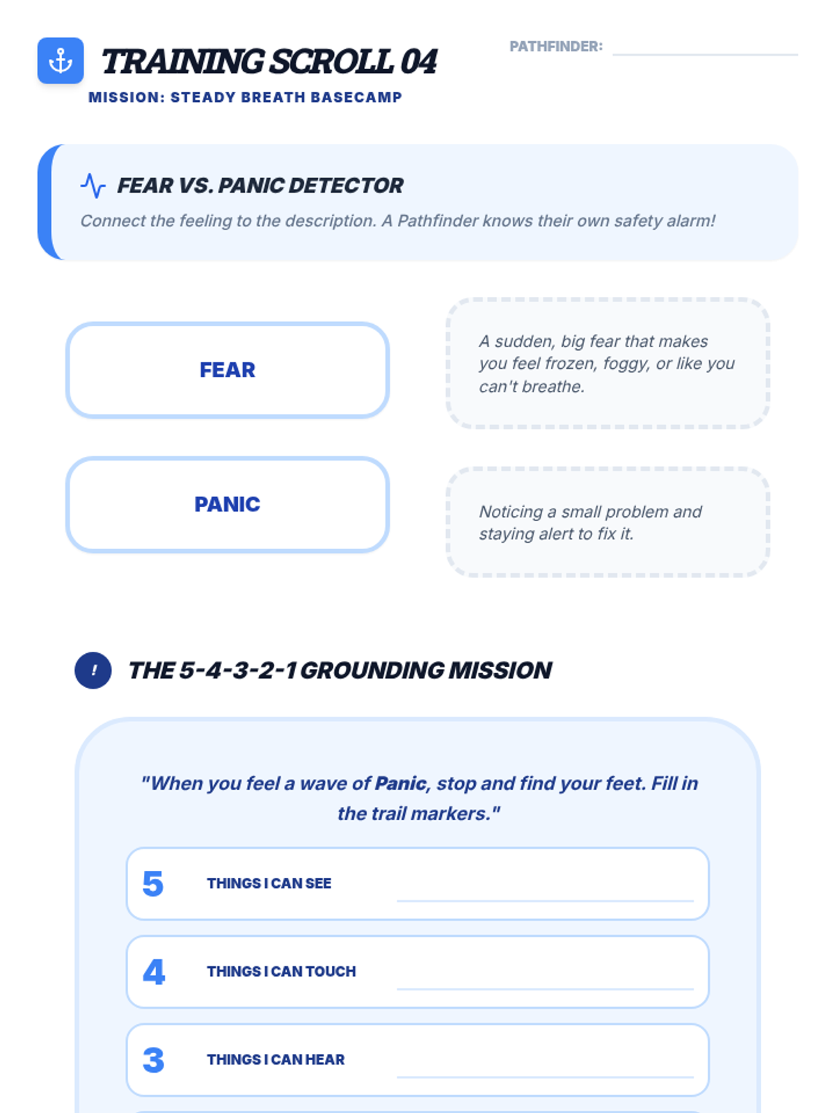 A lesson focused on mindfulness and emotional regulation, teaching Pathfinders how to stay centered using grounding techniques and a positive mindset.