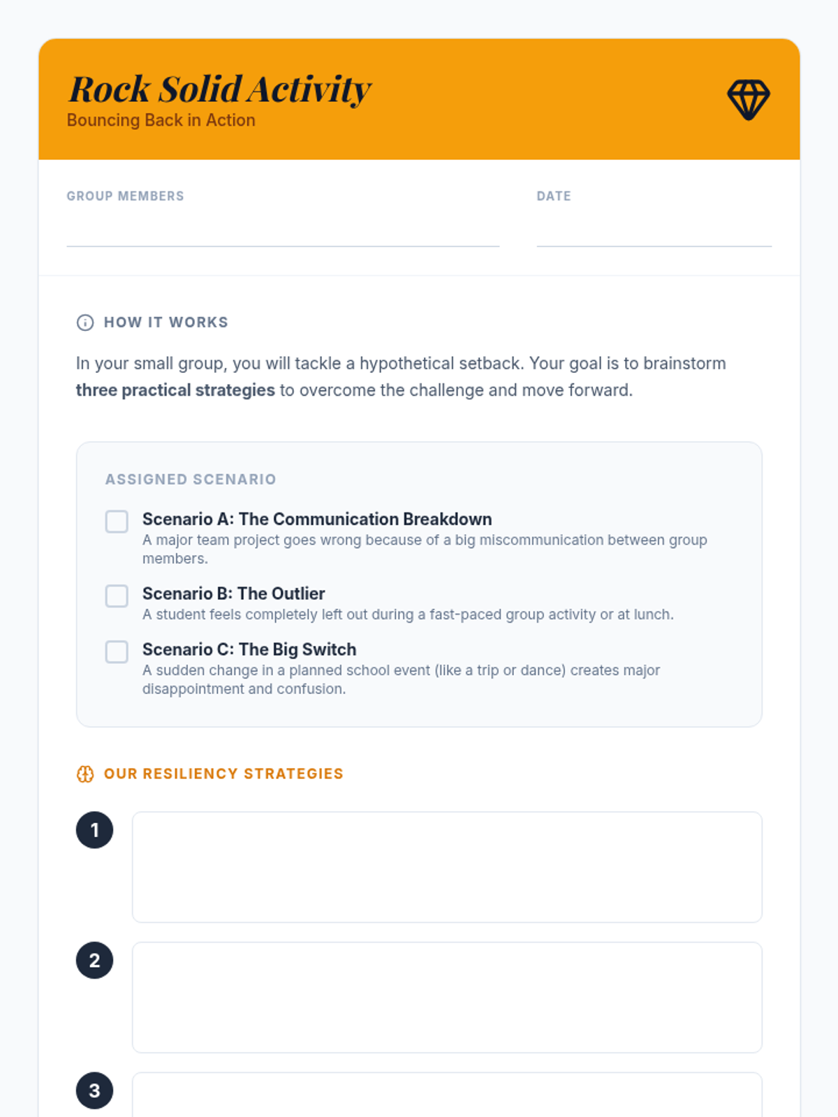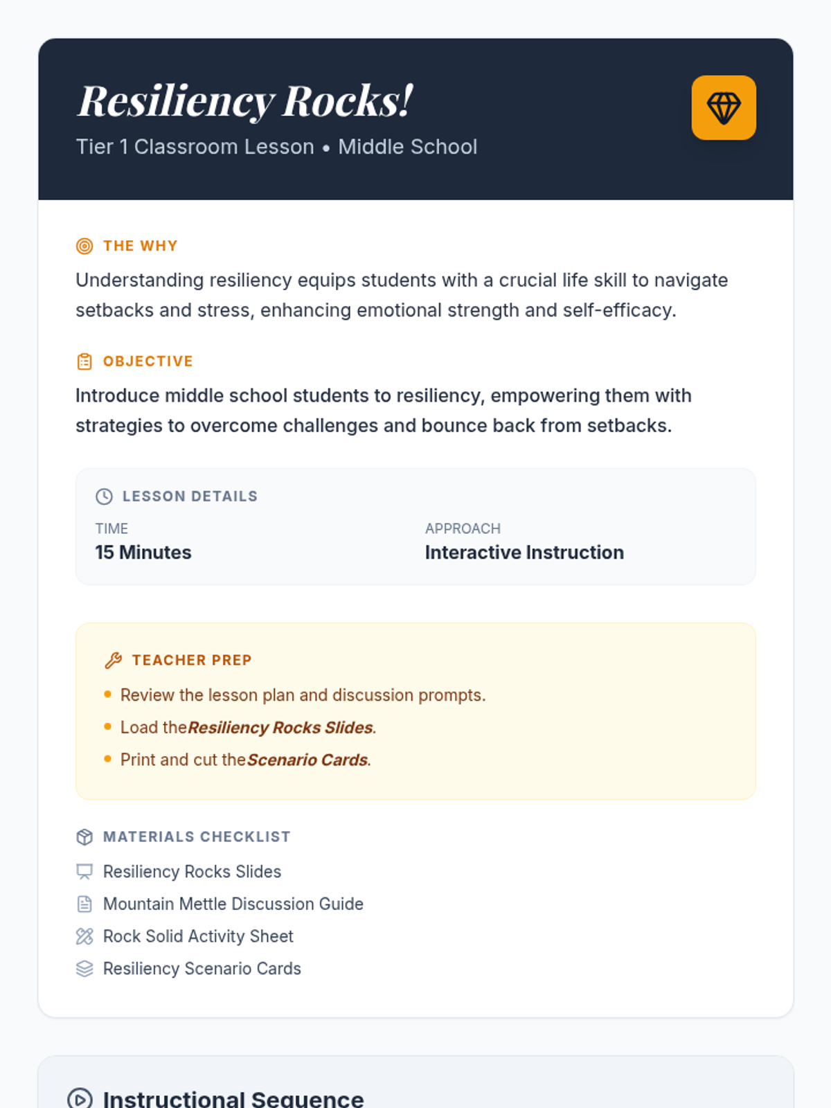 This lesson introduces middle school students to the concept of resiliency, helping them understand its importance in overcoming challenges and bouncing back from setbacks through a 15-minute interactive session.