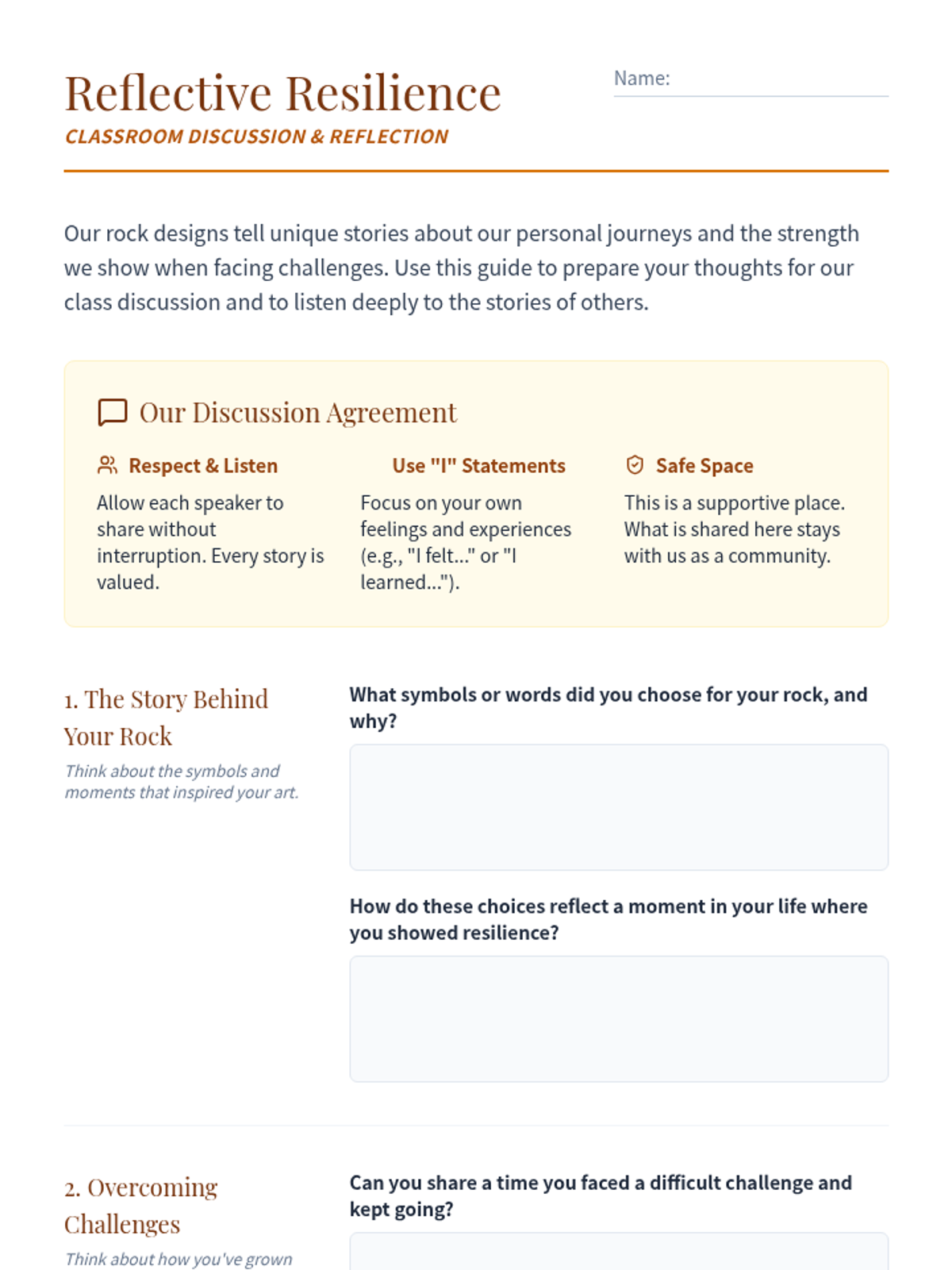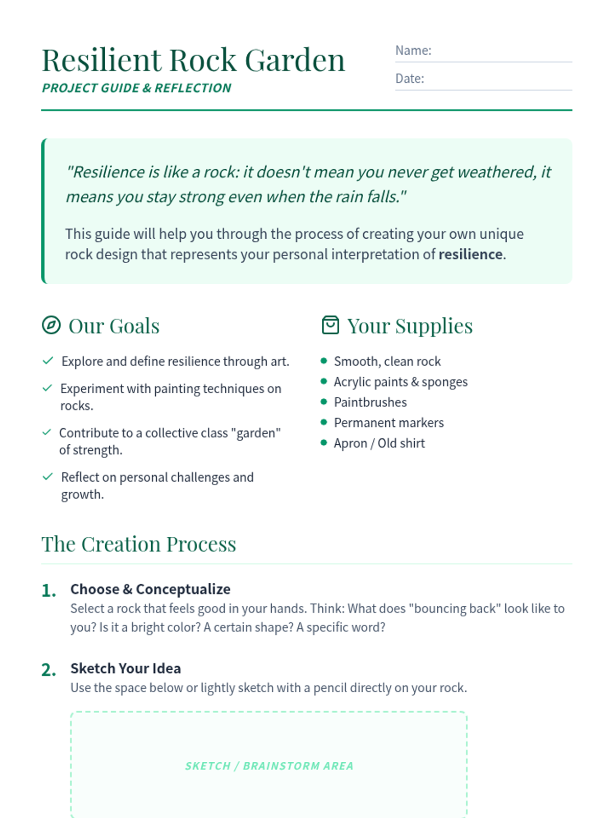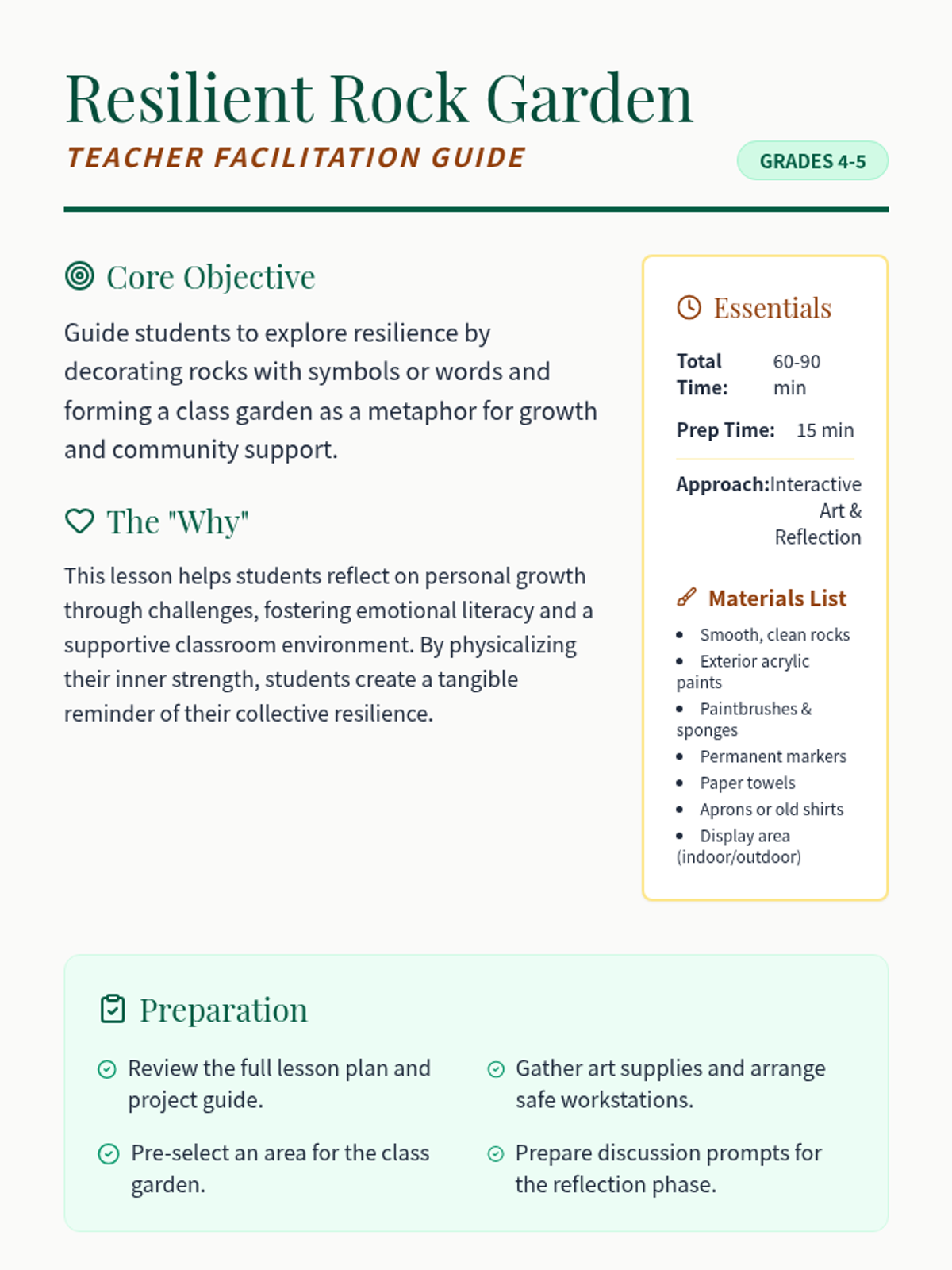 An interactive art and reflection lesson for Grades 4-5 where students decorate rocks to symbolize resilience, creating a collective classroom garden.