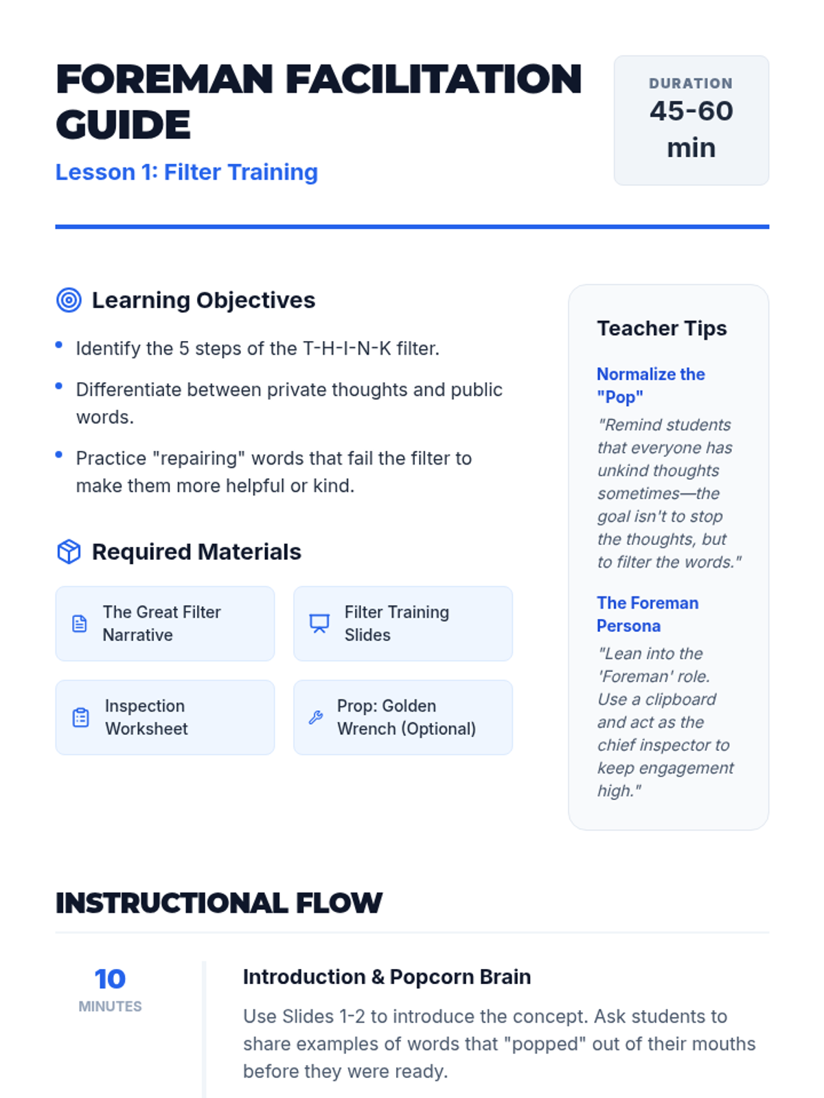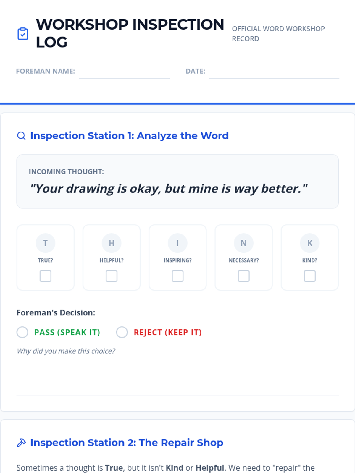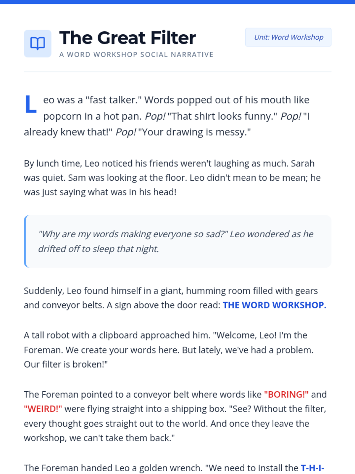 Students learn the THINK filter and explore how words can help or hurt others through a social narrative and interactive activities.