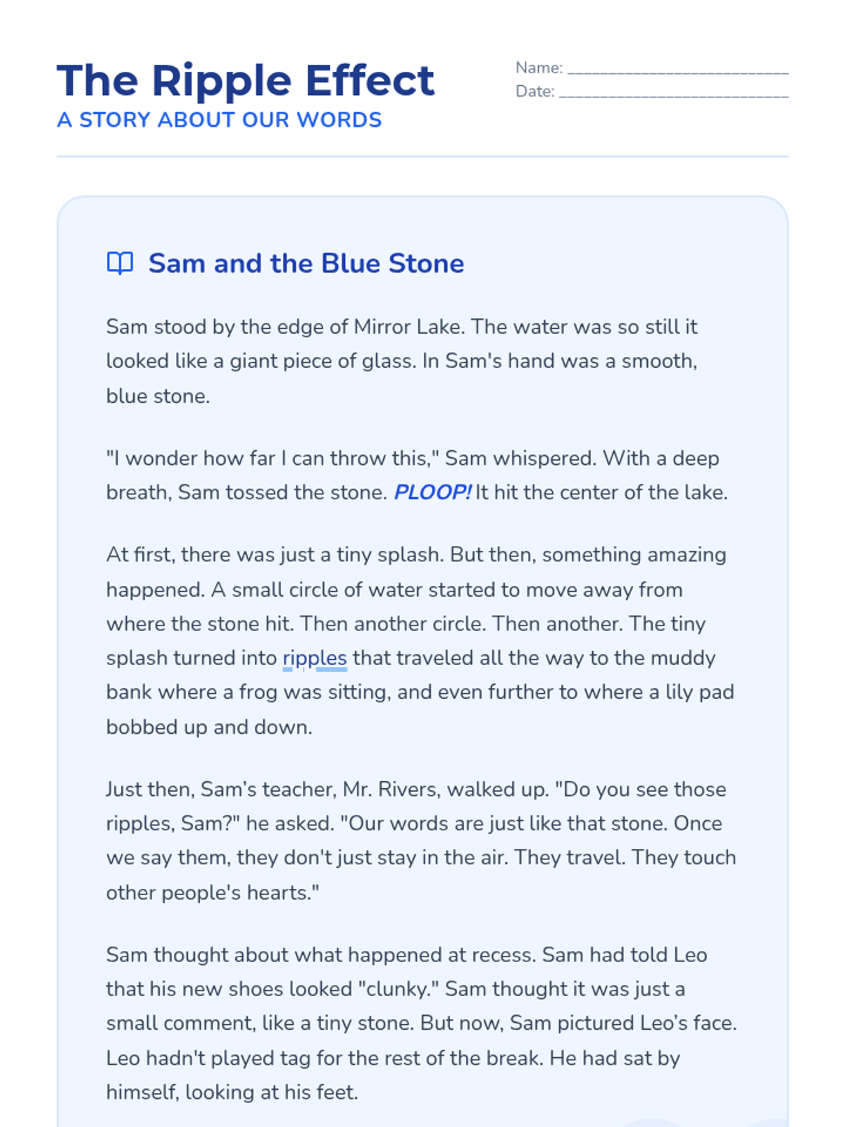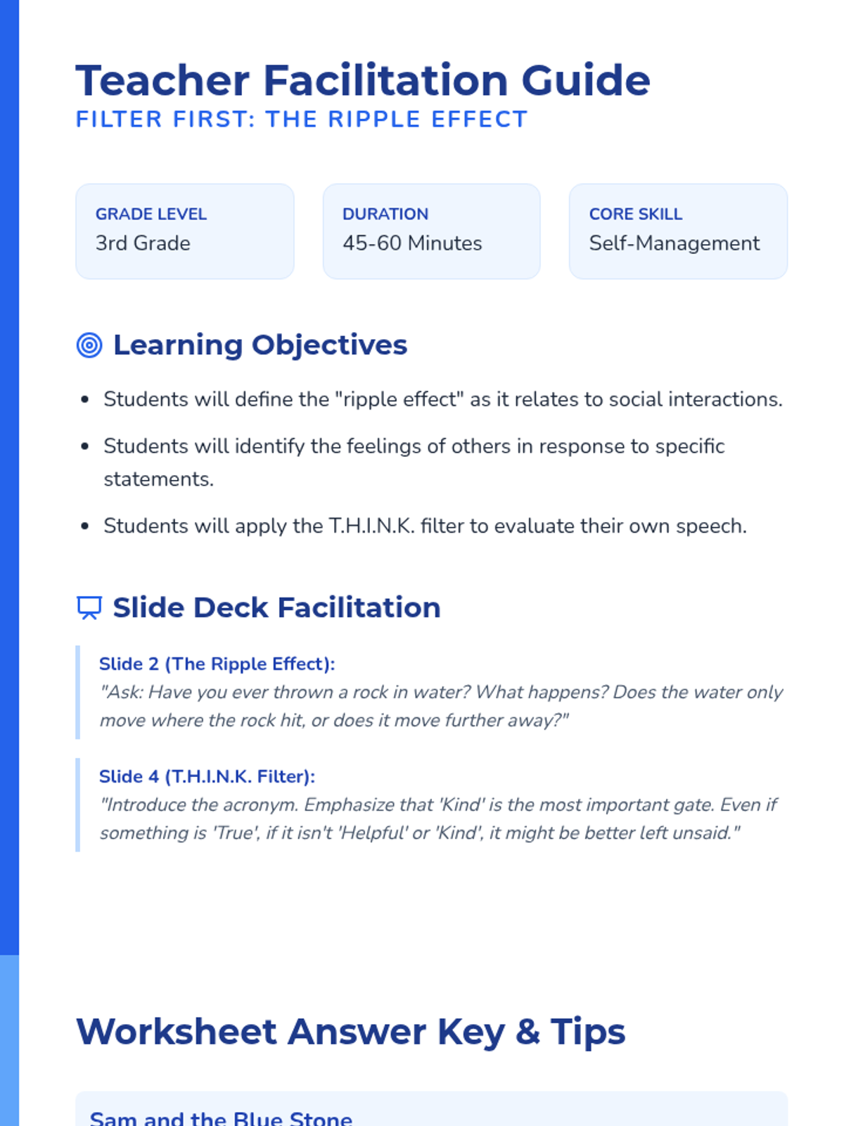 A lesson focused on the social-emotional skill of thinking before speaking, helping 3rd graders understand how their words act like ripples in a pond, affecting the feelings of those around them.