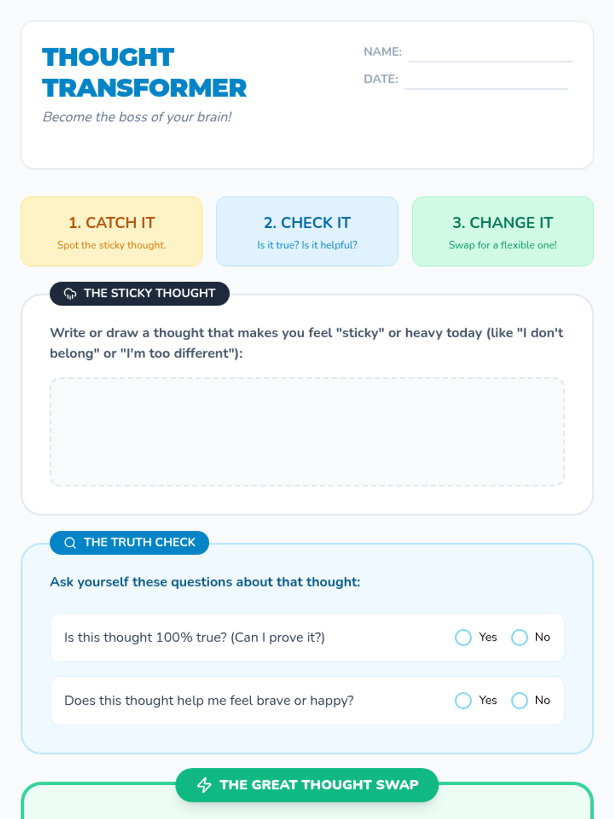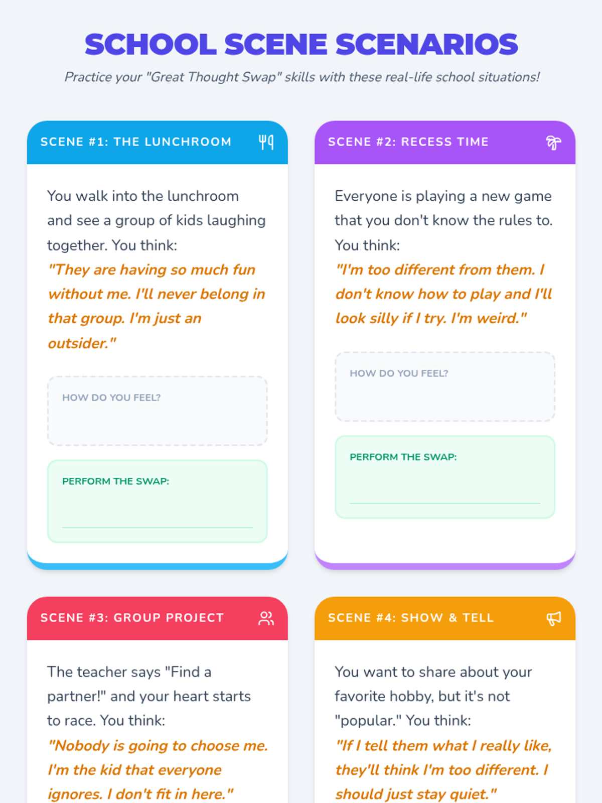 This lesson helps 3rd graders identify and reframe unhelpful thoughts related to school anxiety, specifically feelings of not belonging or being 'different.' Students will learn to 'catch' sticky thoughts and transform them into helpful ones through interactive scenarios and guided practice.