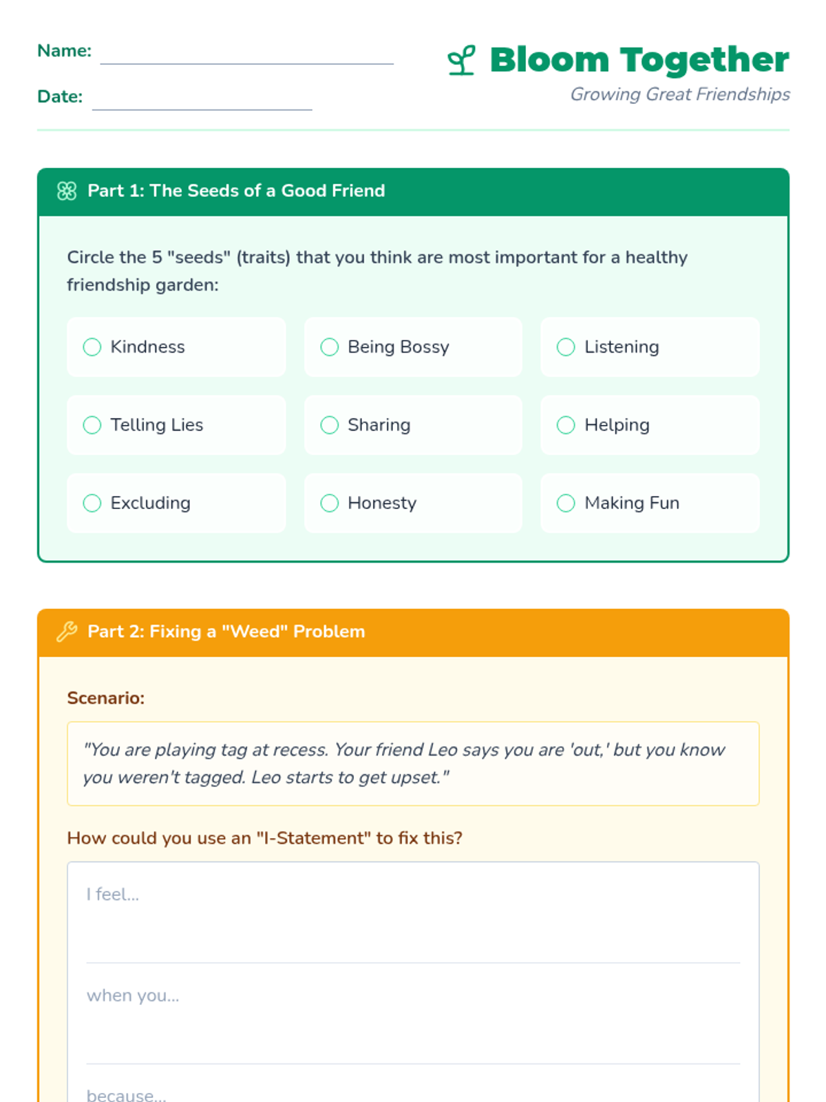 A 30-minute counseling lesson focused on developing positive social skills and nurturing healthy friendships using a 'Friendship Garden' spring theme.