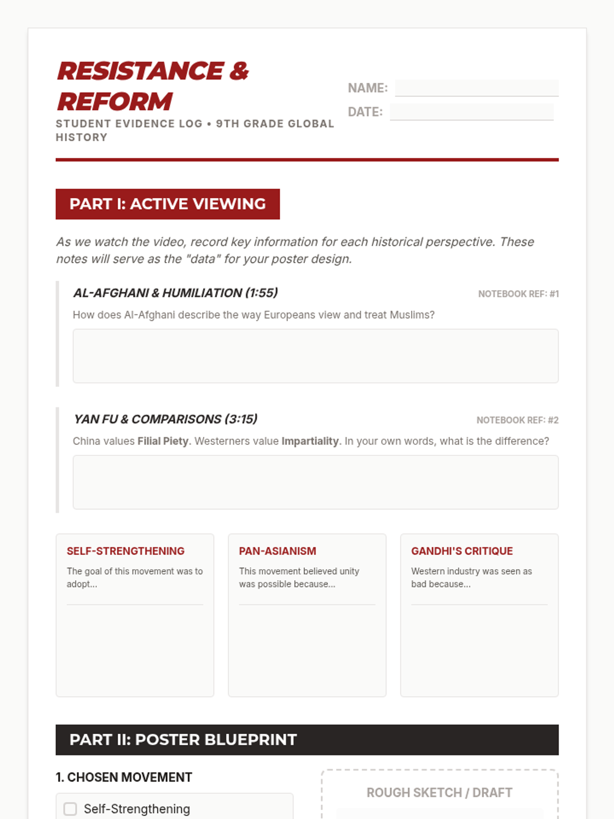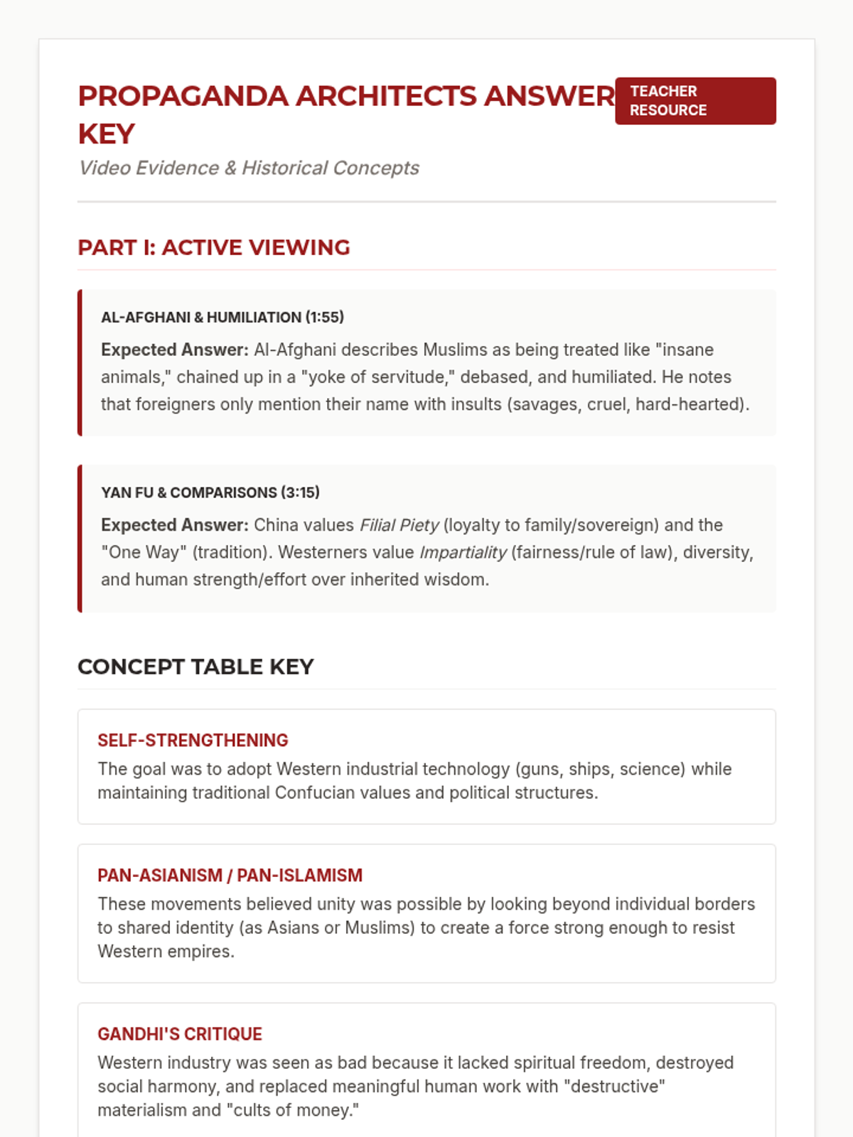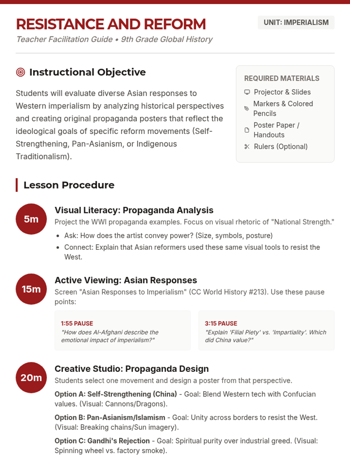 This lesson explores 19th and 20th-century Asian responses to Western imperialism, focusing on the tension between modernization and traditional values. Students analyze propaganda techniques and design their own posters representing movements like Self-Strengthening, Pan-Asianism, and Gandhi's rejection of industrialization.