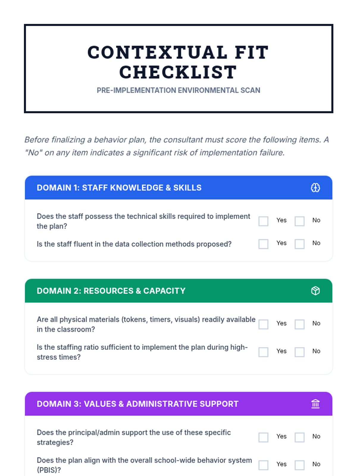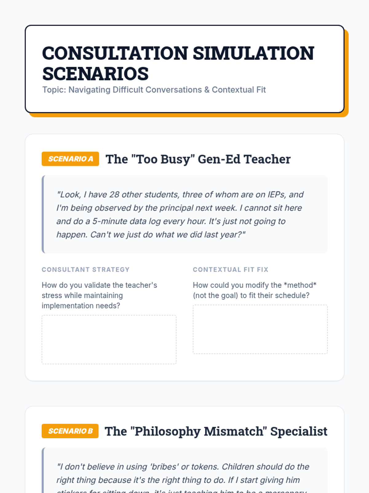 Explores strategies for building rapport, assessing contextual fit, and navigating staff resistance using OBM principles.
