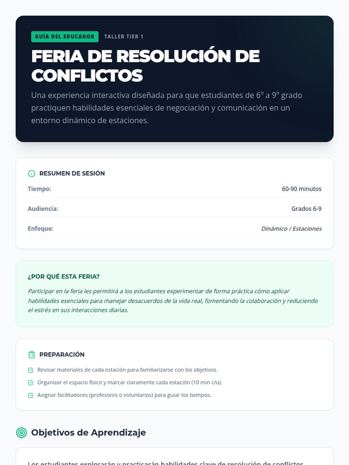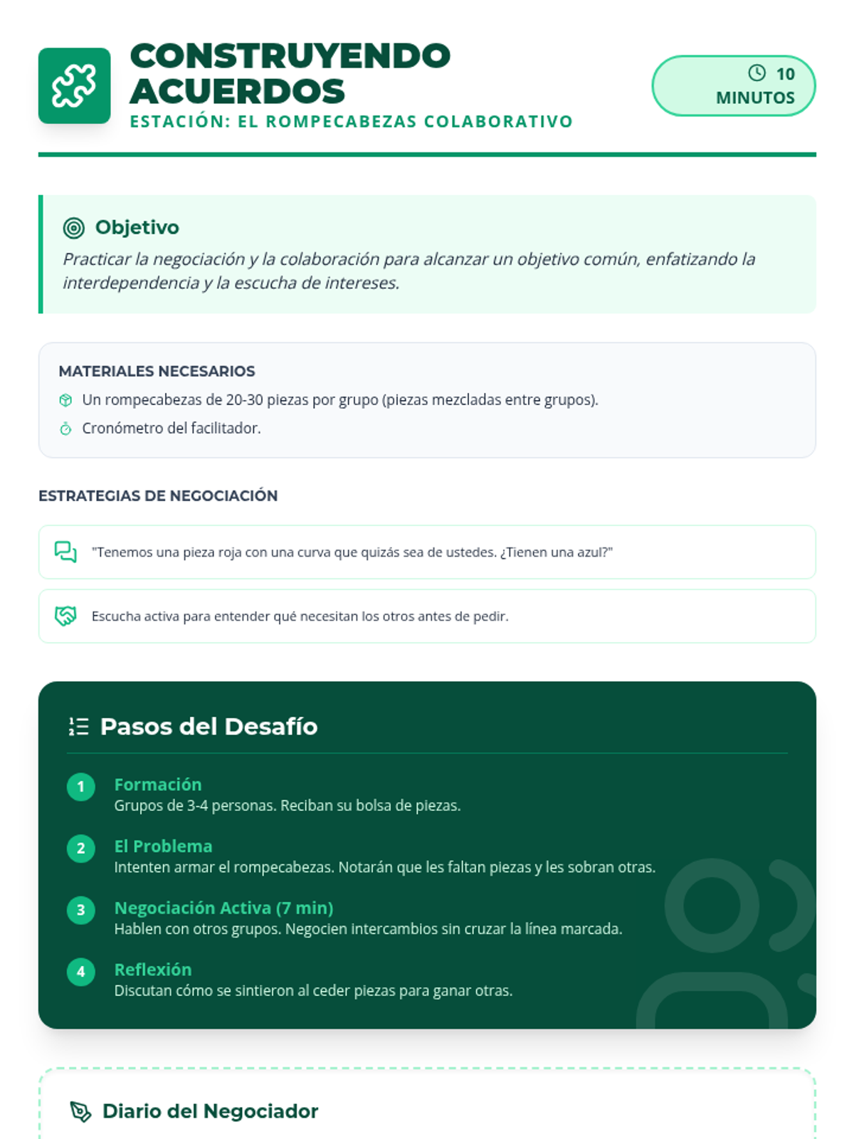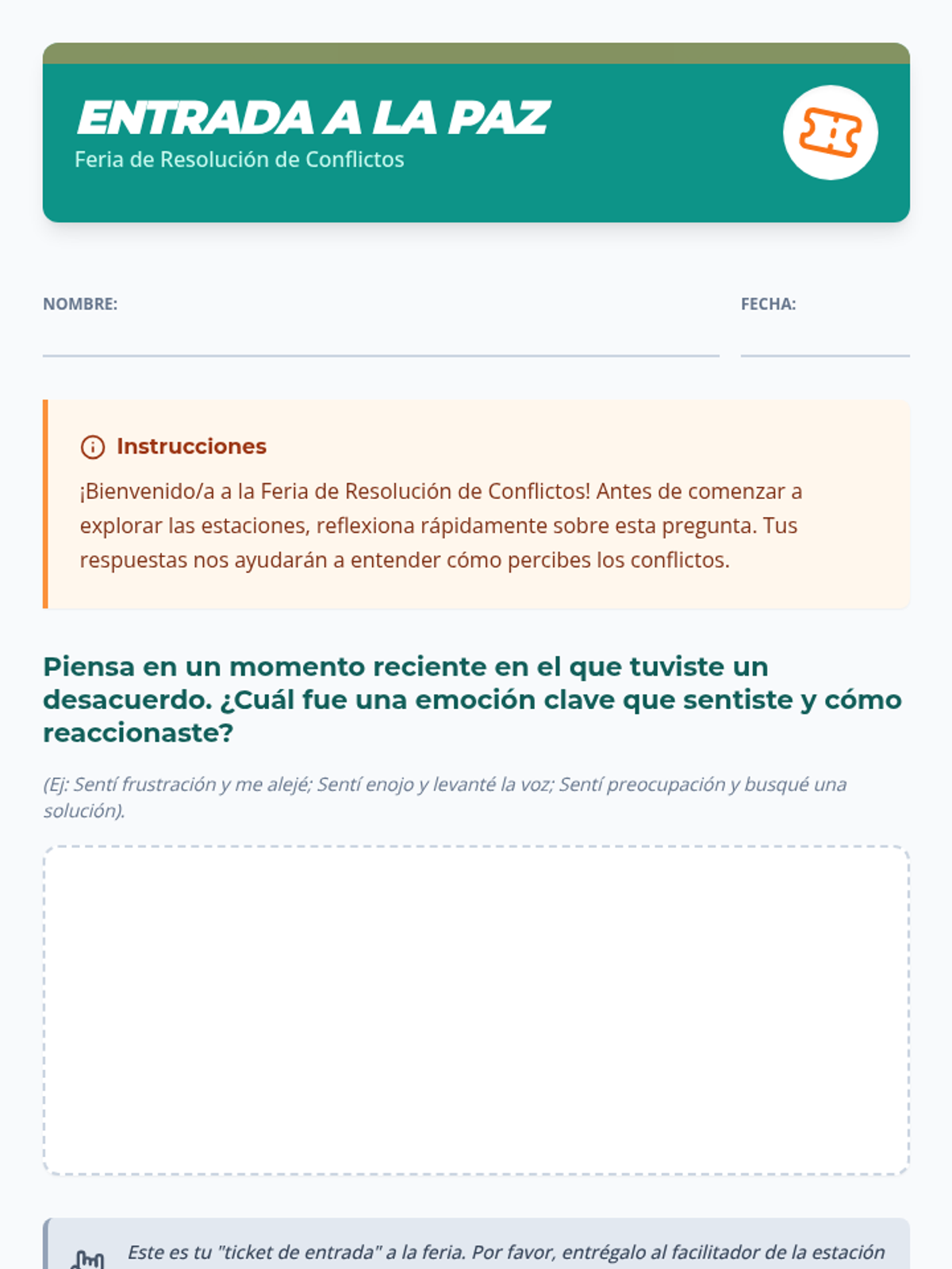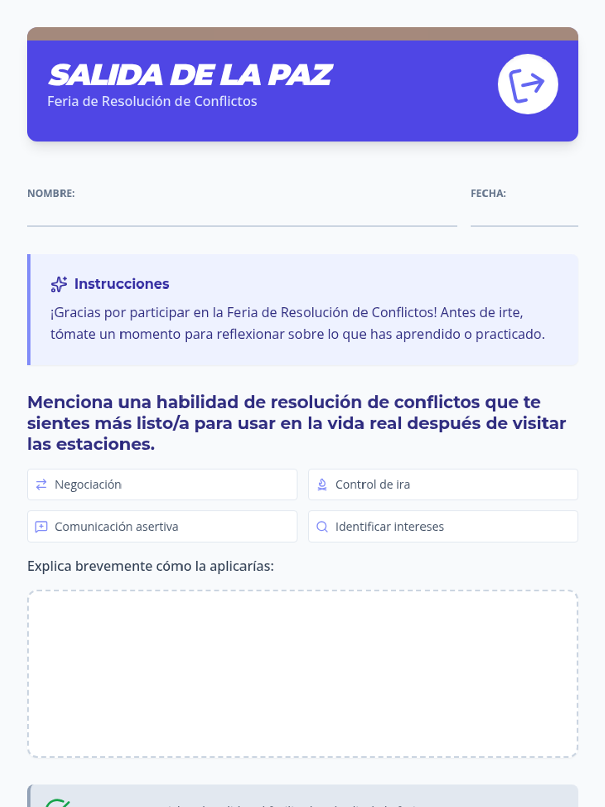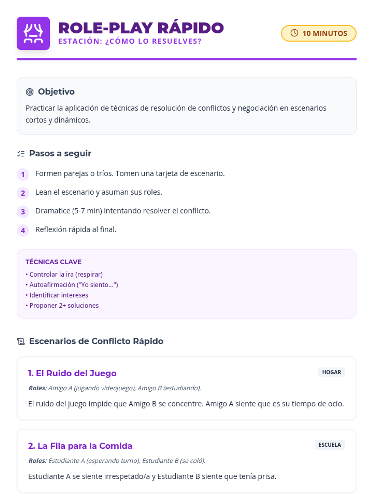 Una feria interactiva donde estudiantes de 6º y 7º grado exploran técnicas de negociación, comunicación asertiva y resolución de conflictos a través de estaciones dinámicas. / An interactive fair where 6th and 7th-grade students explore negotiation, assertive communication, and conflict resolution techniques through dynamic stations.