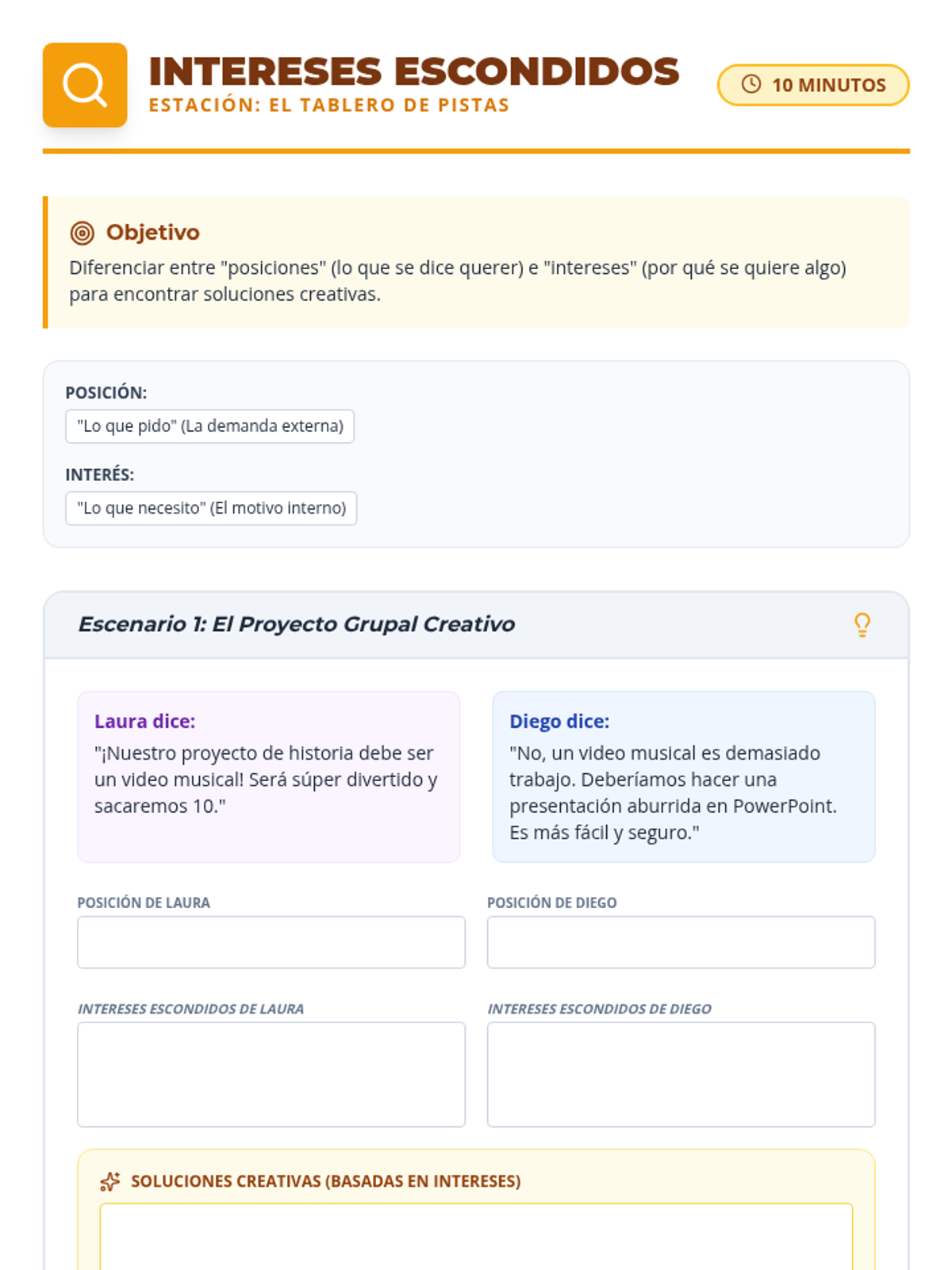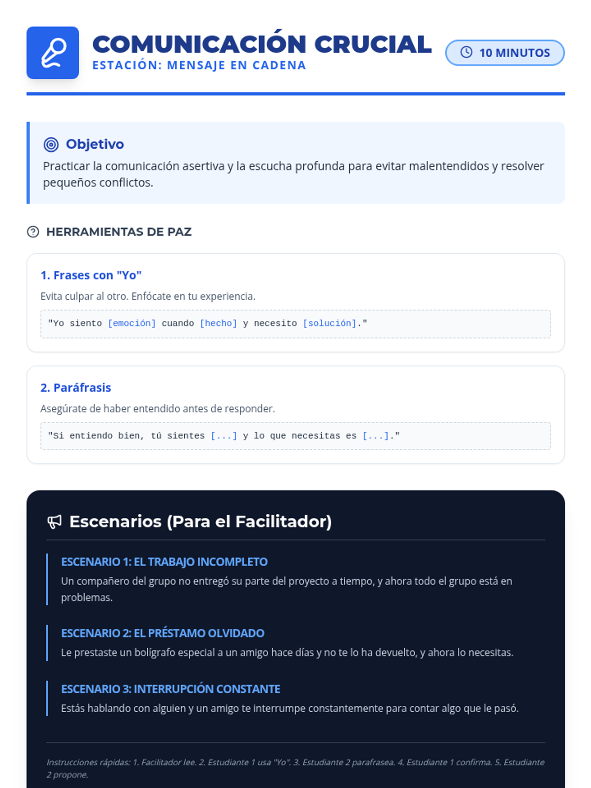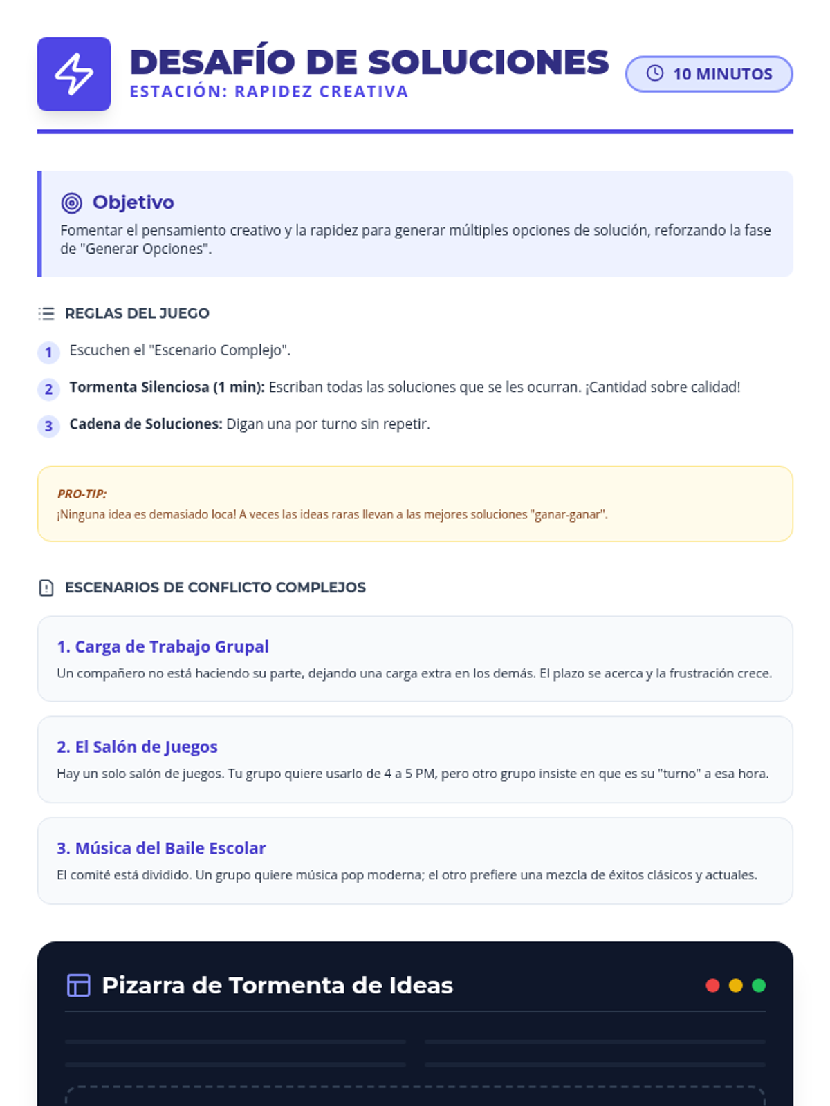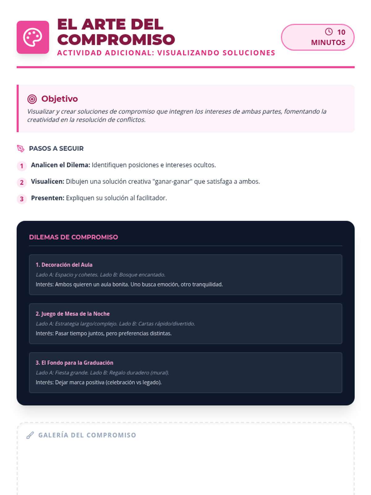 Una feria interactiva donde estudiantes de 6º y 7º grado exploran técnicas de negociación, comunicación asertiva y resolución de conflictos a través de estaciones dinámicas. / An interactive fair where 6th and 7th-grade students explore negotiation, assertive communication, and conflict resolution techniques through dynamic stations.