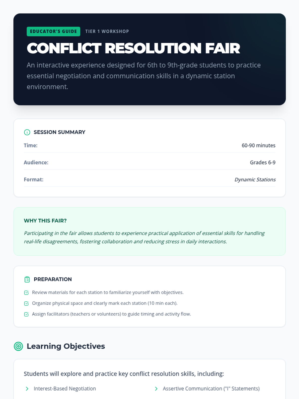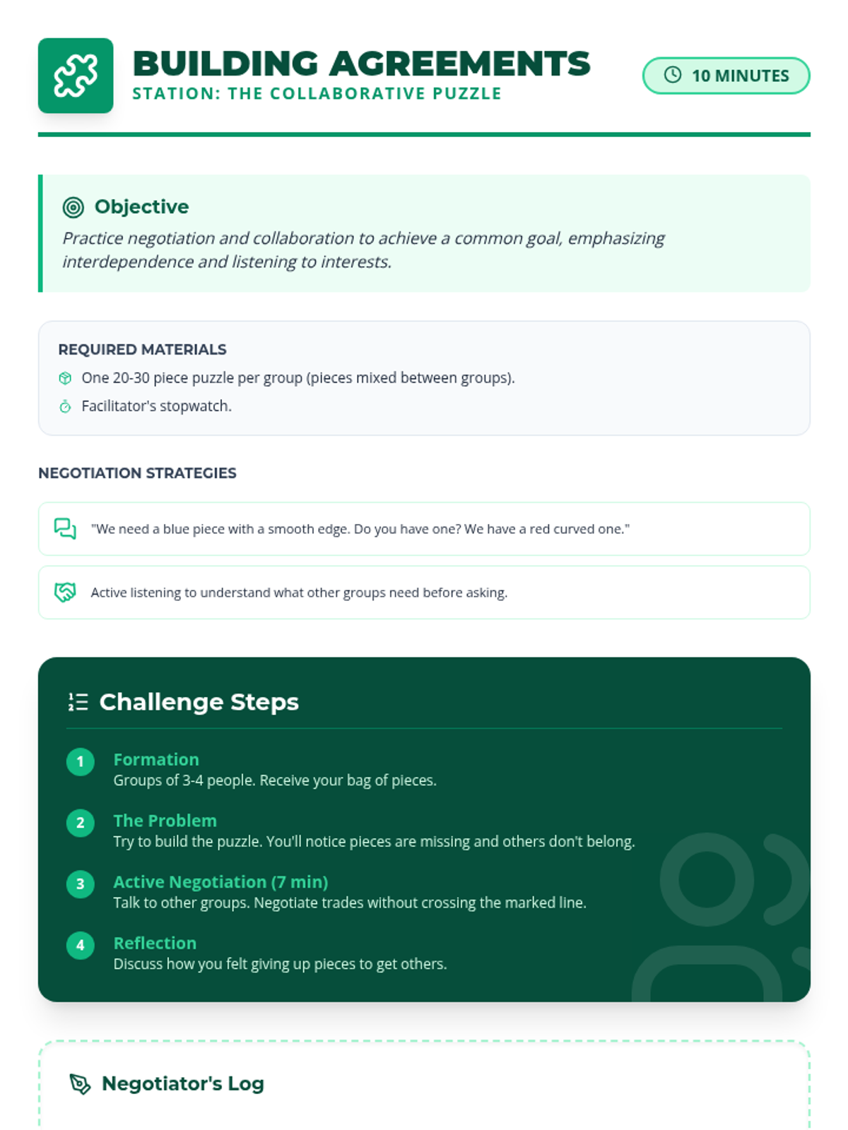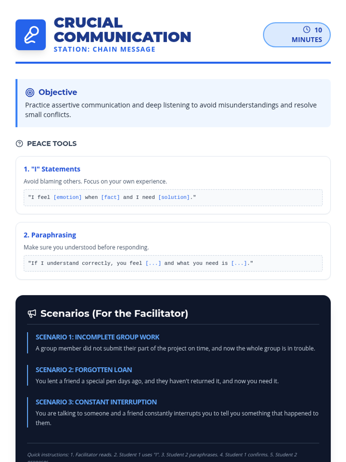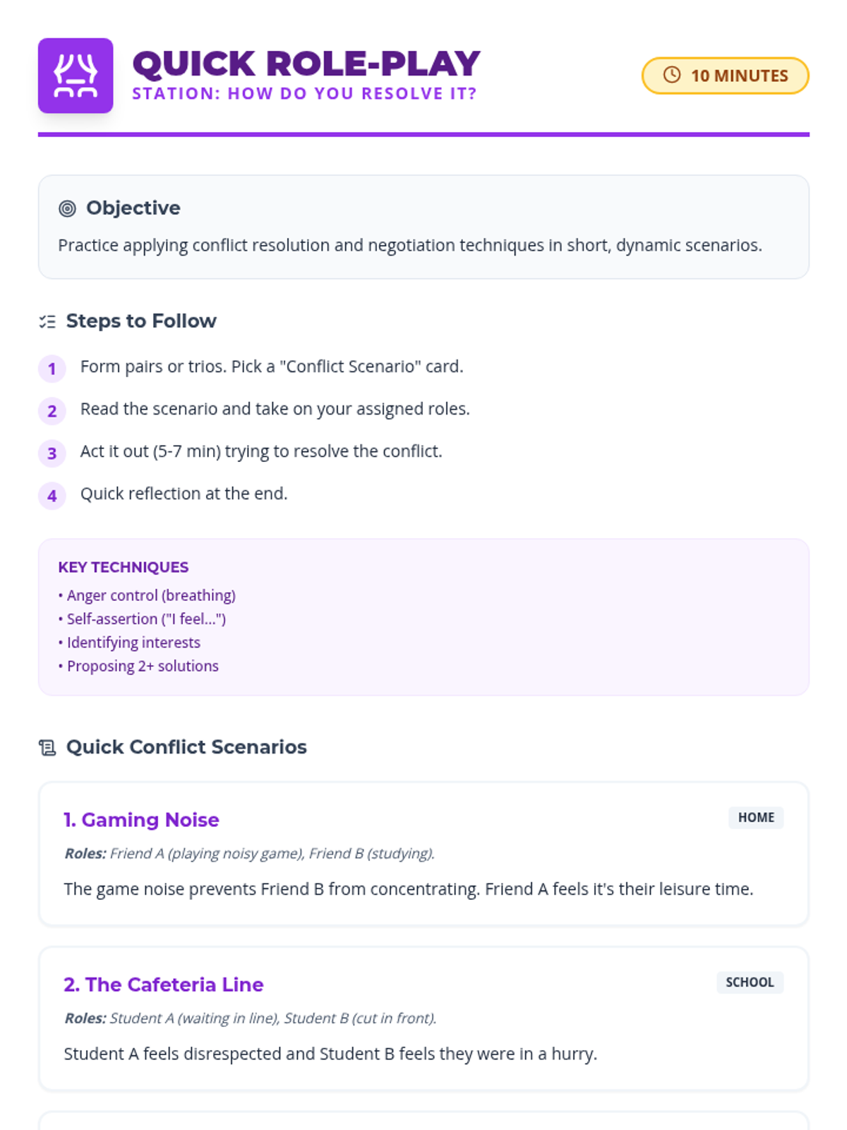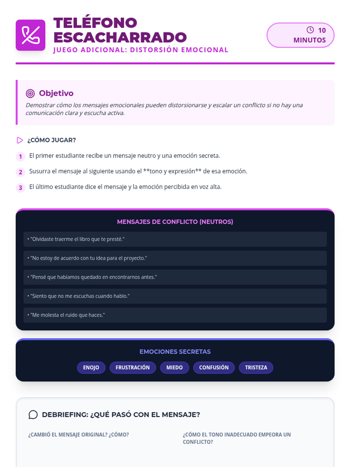Una feria interactiva donde estudiantes de 6º y 7º grado exploran técnicas de negociación, comunicación asertiva y resolución de conflictos a través de estaciones dinámicas. / An interactive fair where 6th and 7th-grade students explore negotiation, assertive communication, and conflict resolution techniques through dynamic stations.
