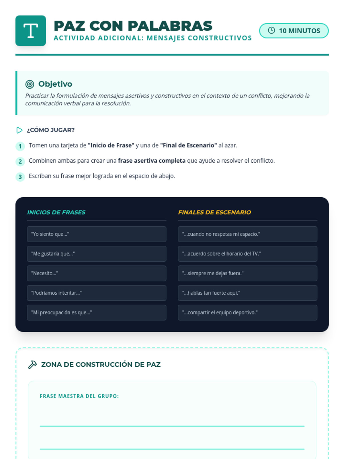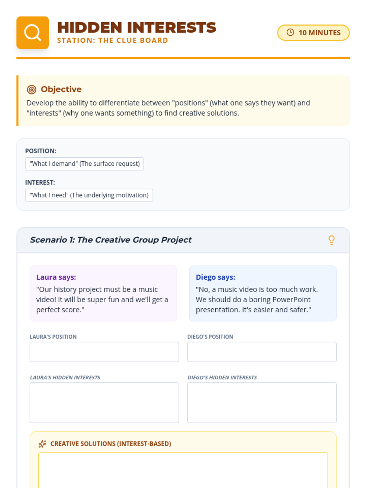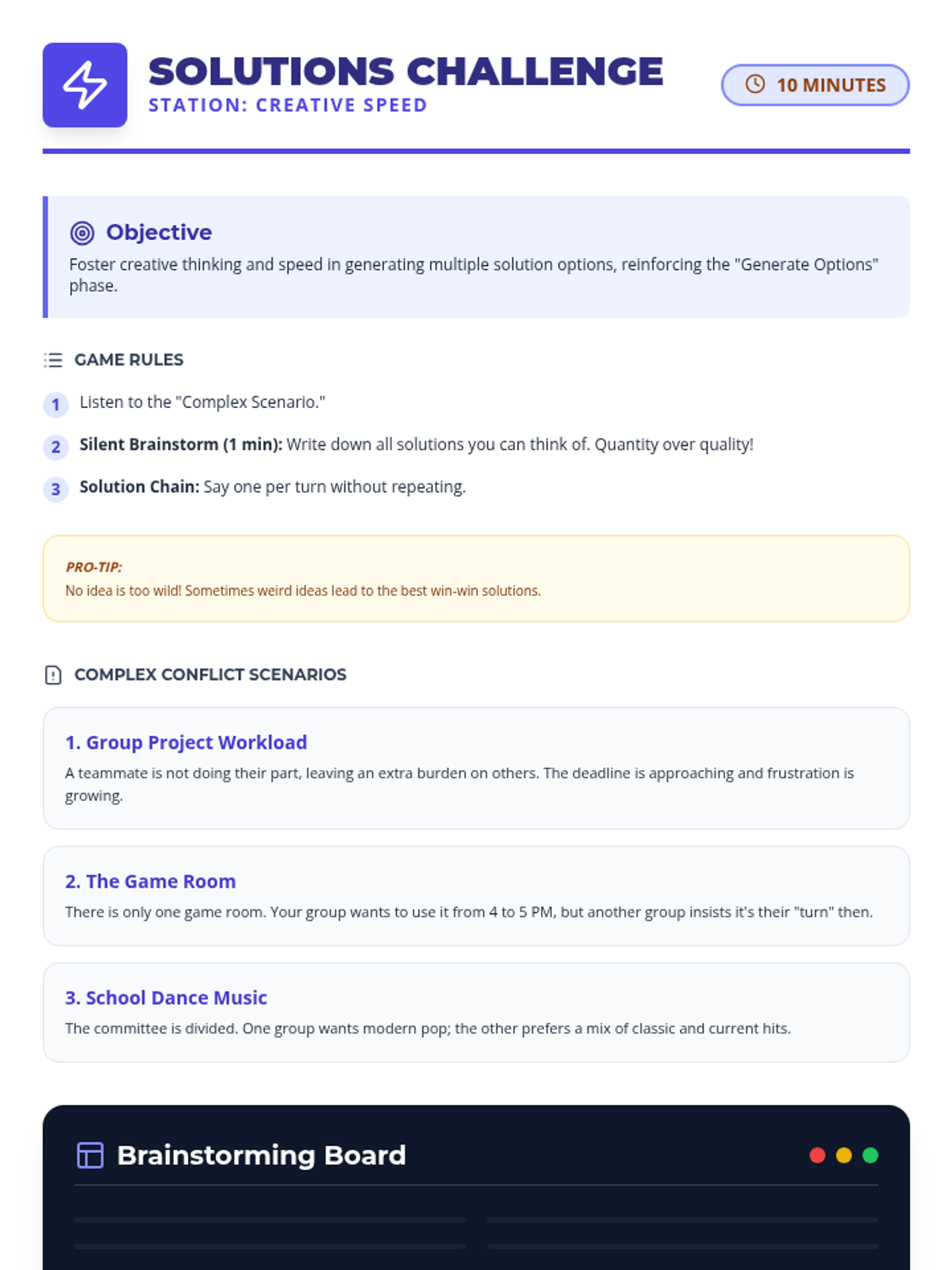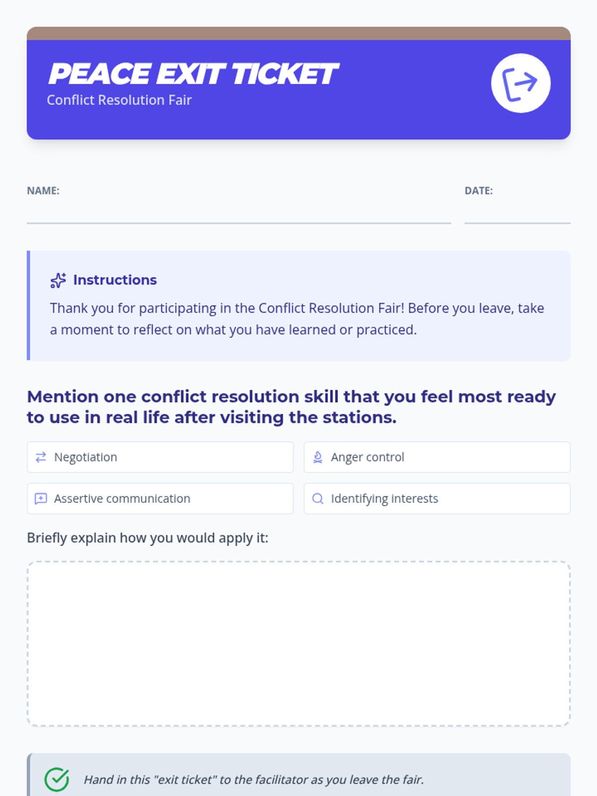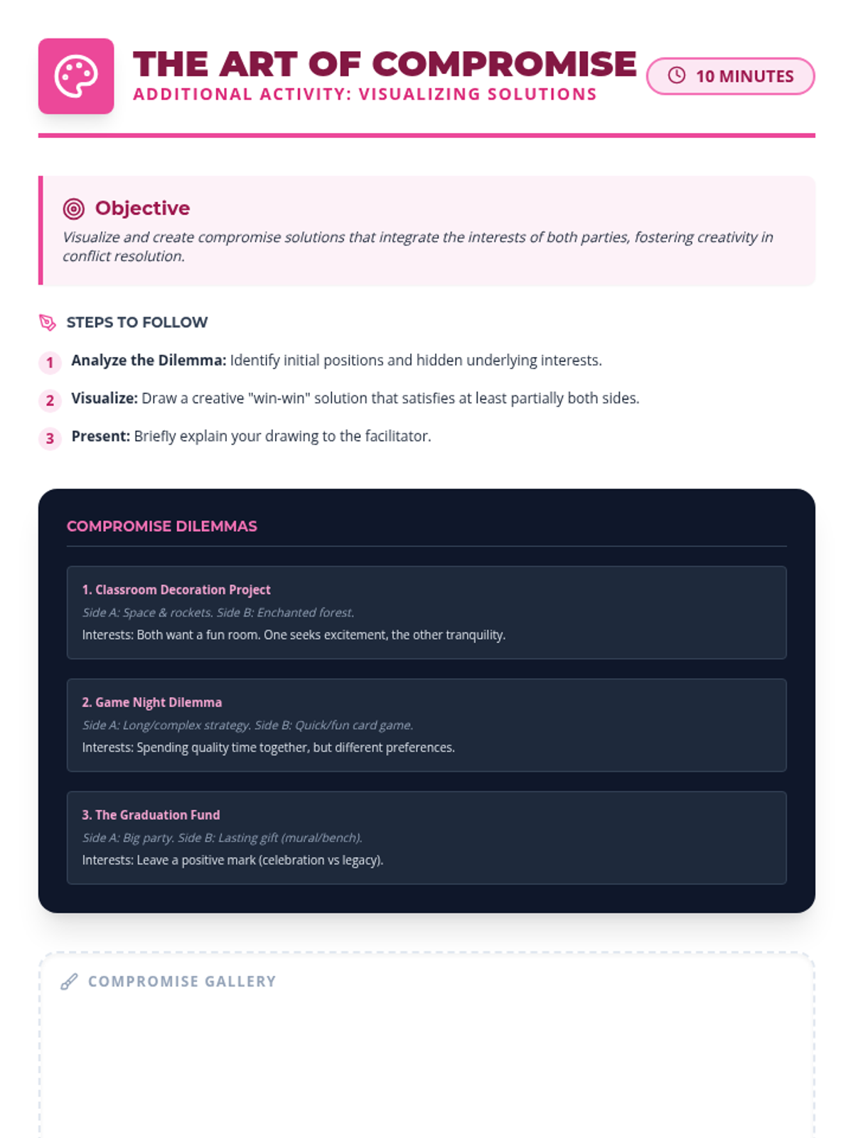 Una feria interactiva donde estudiantes de 6º y 7º grado exploran técnicas de negociación, comunicación asertiva y resolución de conflictos a través de estaciones dinámicas. / An interactive fair where 6th and 7th-grade students explore negotiation, assertive communication, and conflict resolution techniques through dynamic stations.