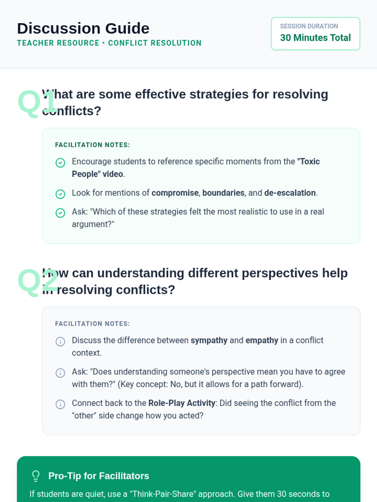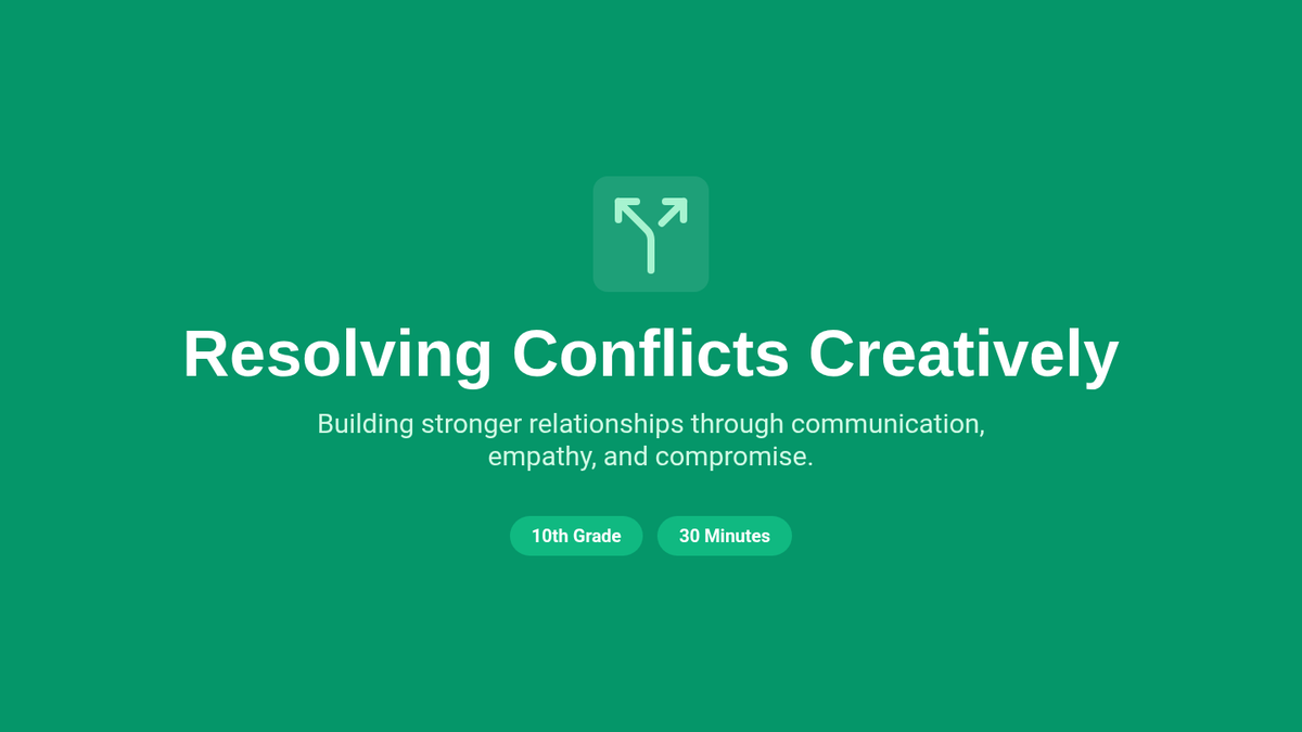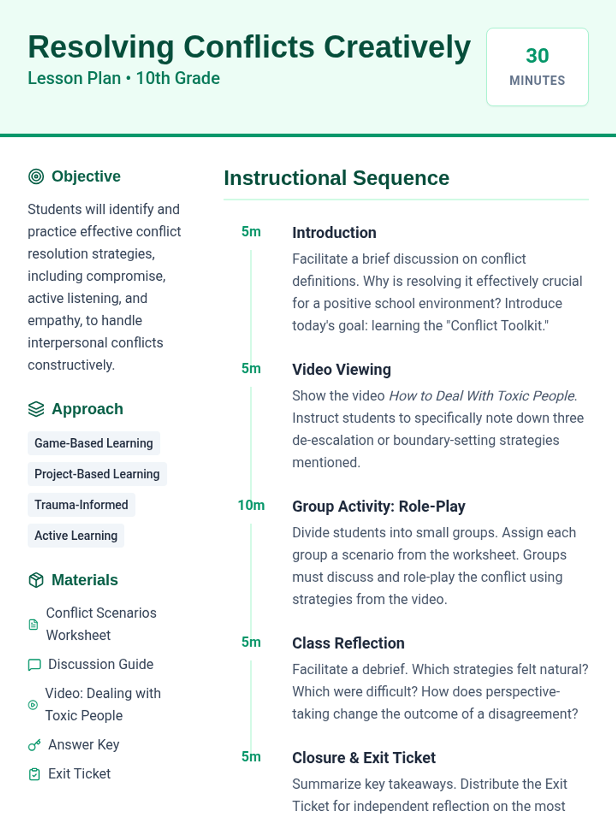 A 30-minute lesson for 10th-grade students focused on practical conflict resolution strategies, de-escalation techniques, and the importance of perspective-taking. Students engage with a video, role-play scenarios, and reflect on their learning through a guided discussion and exit ticket.