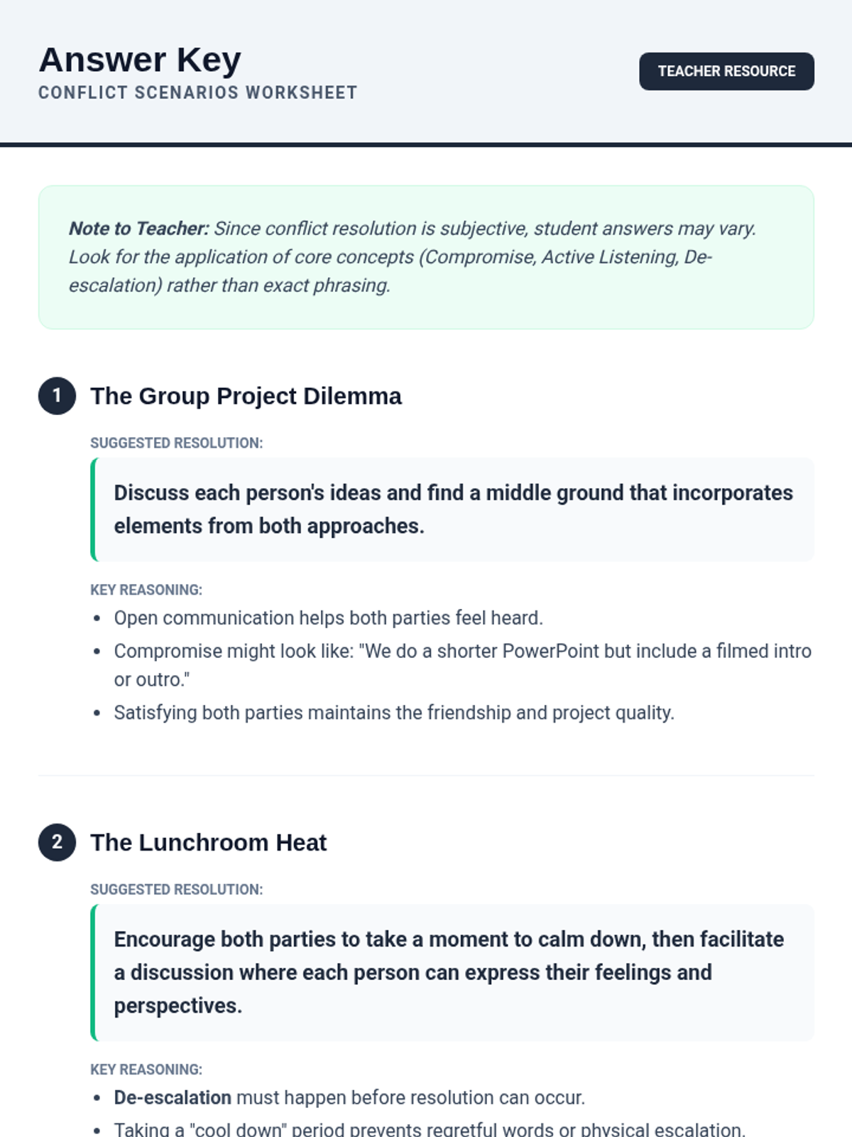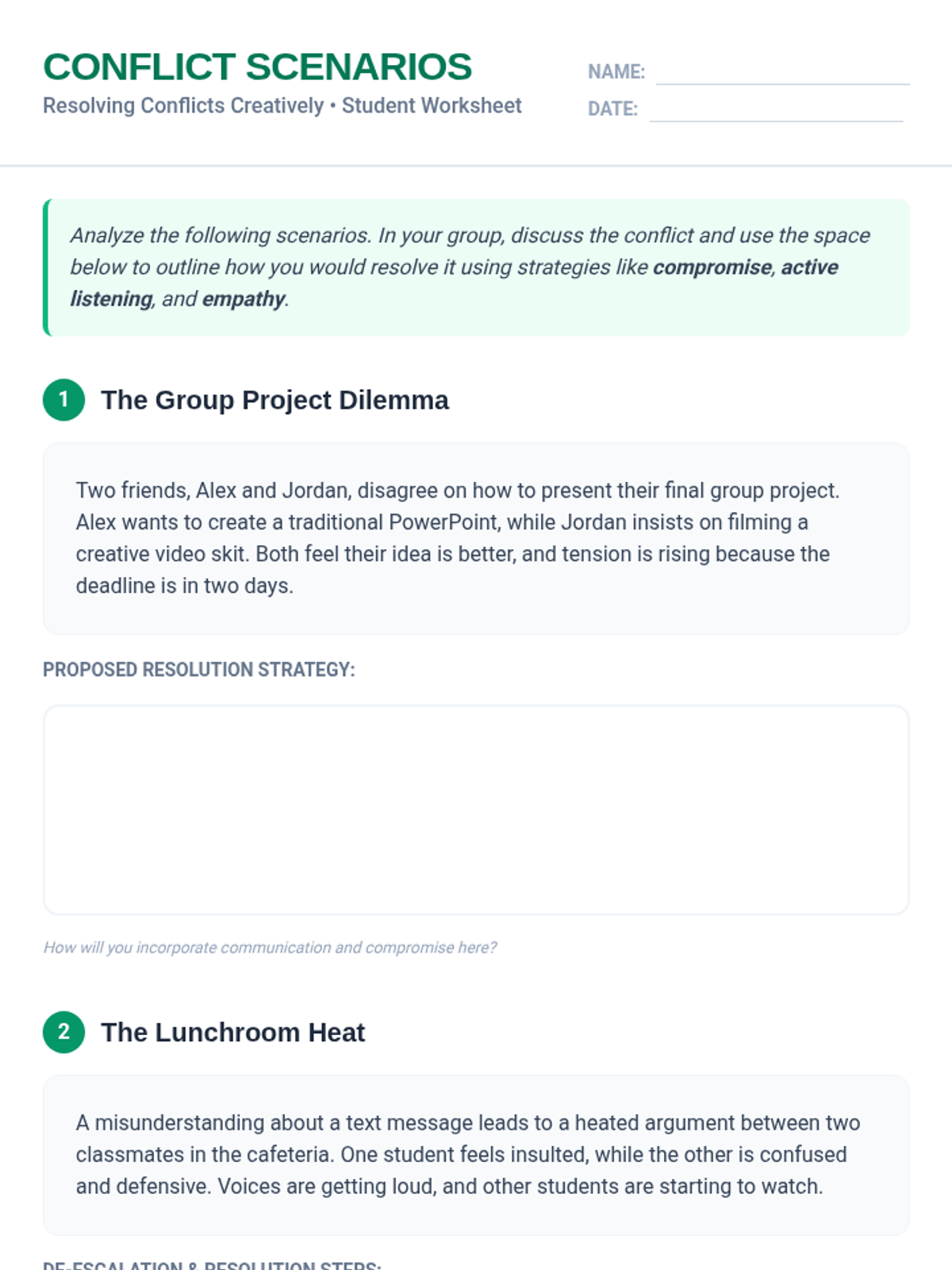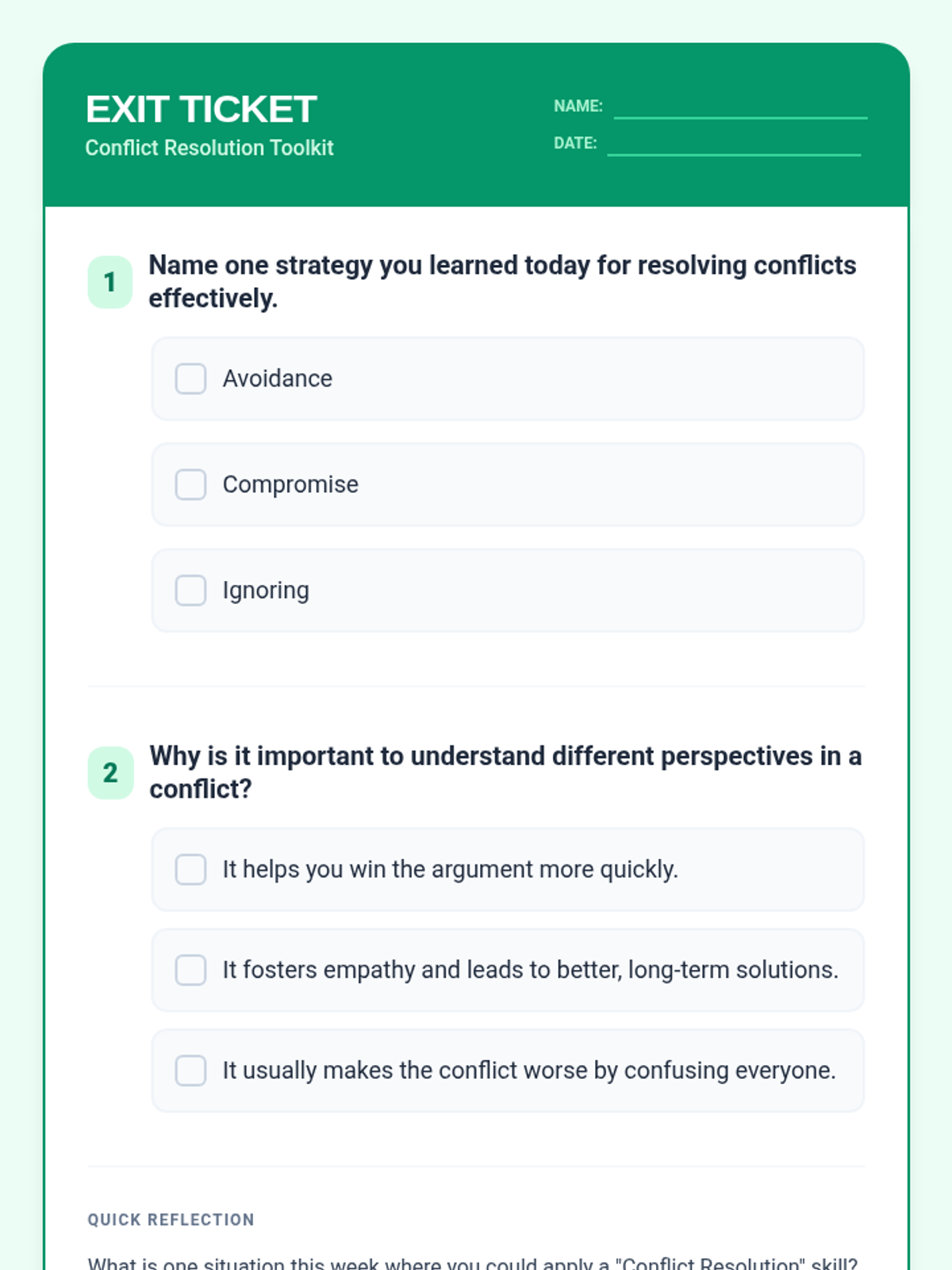 A 30-minute lesson for 10th-grade students focused on practical conflict resolution strategies, de-escalation techniques, and the importance of perspective-taking. Students engage with a video, role-play scenarios, and reflect on their learning through a guided discussion and exit ticket.
