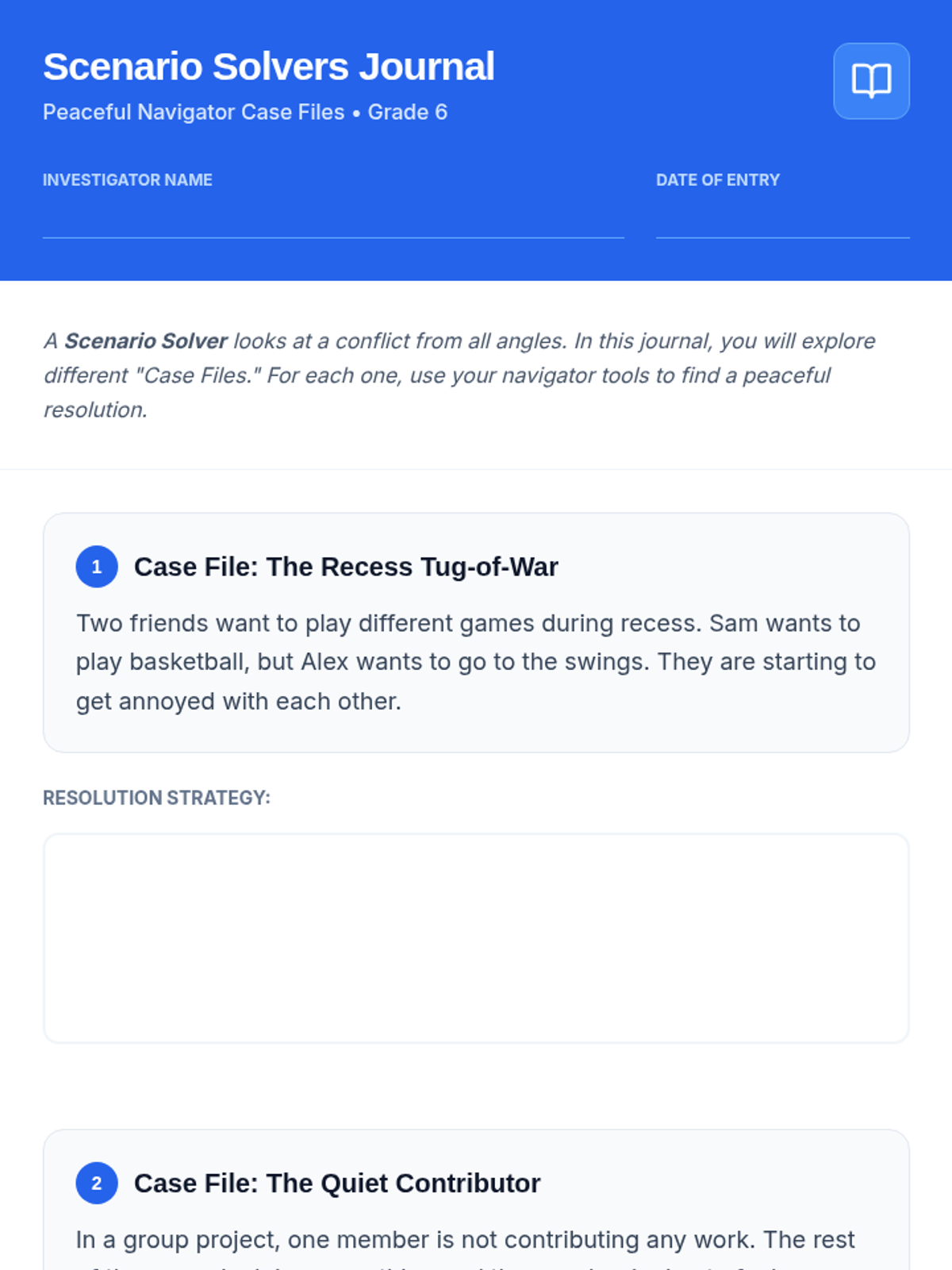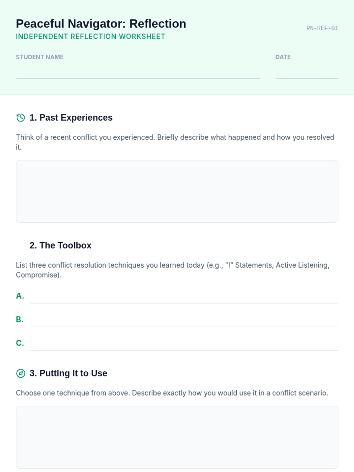 A Tier 3 individual lesson for 6th graders focused on developing independent conflict resolution skills, communication techniques, and perspective-taking. Students engage in self-reflection and scenario-based journaling to build emotional intelligence and social-emotional resilience.