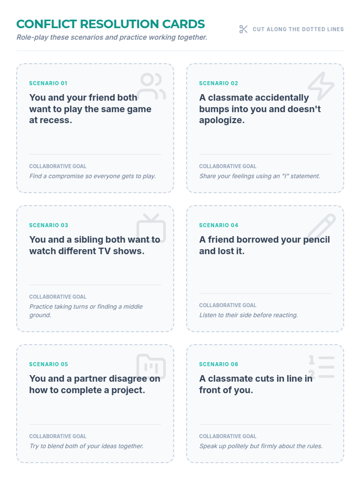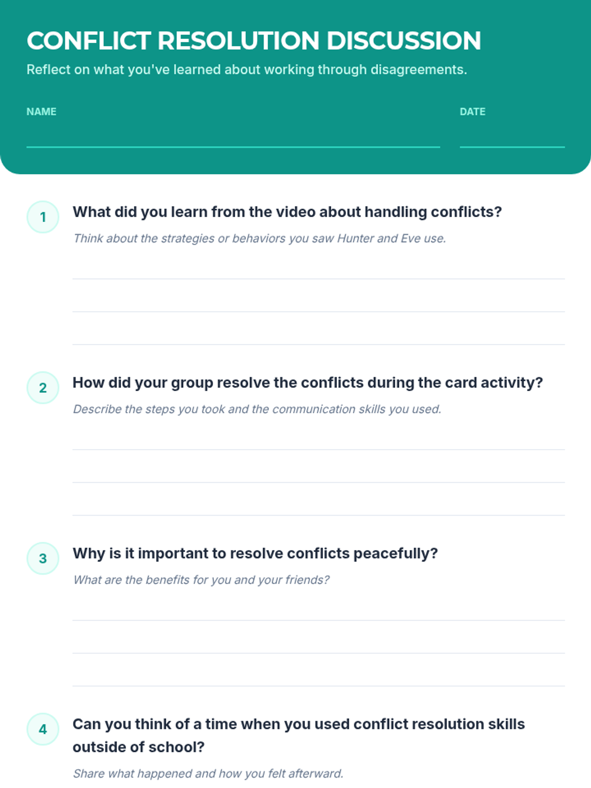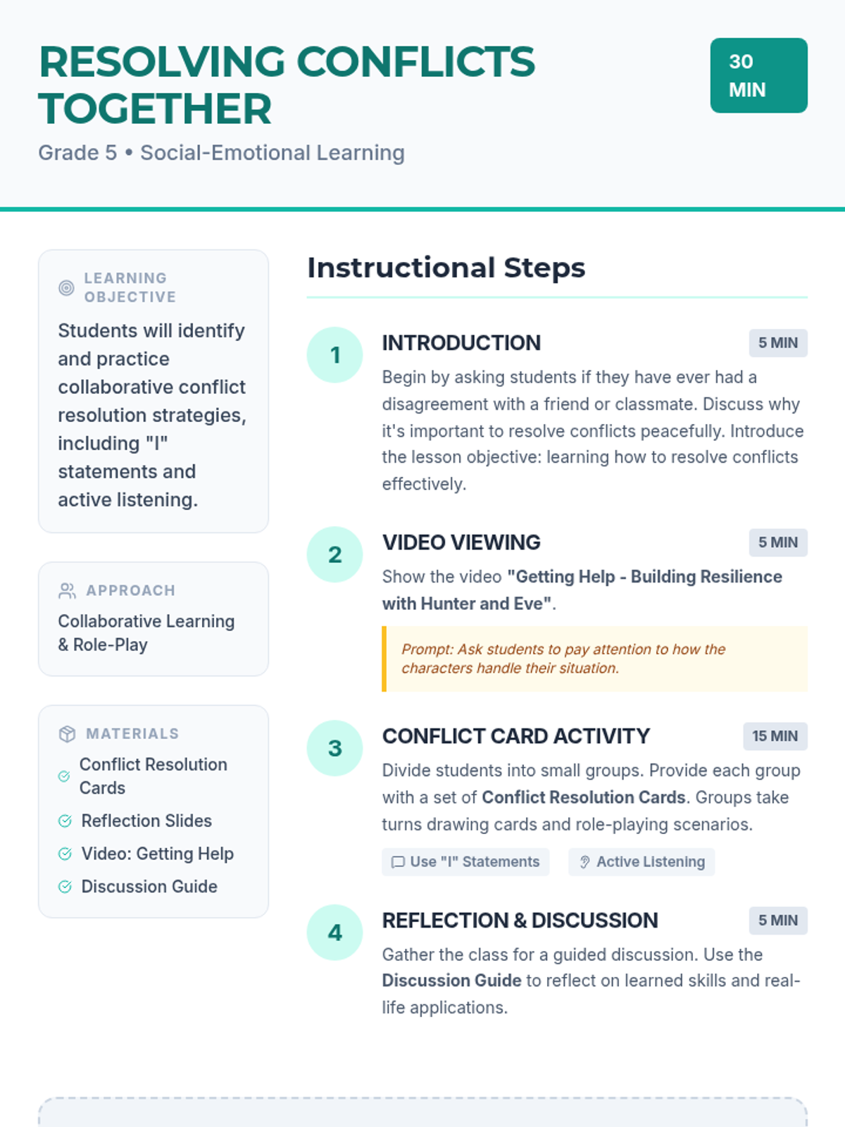 A collaborative Grade 5 lesson teaching effective conflict resolution strategies through role-playing and reflective discussion. Students learn to use 'I' statements and active listening to handle disagreements constructively.