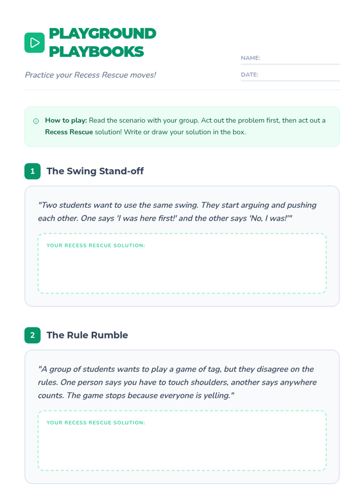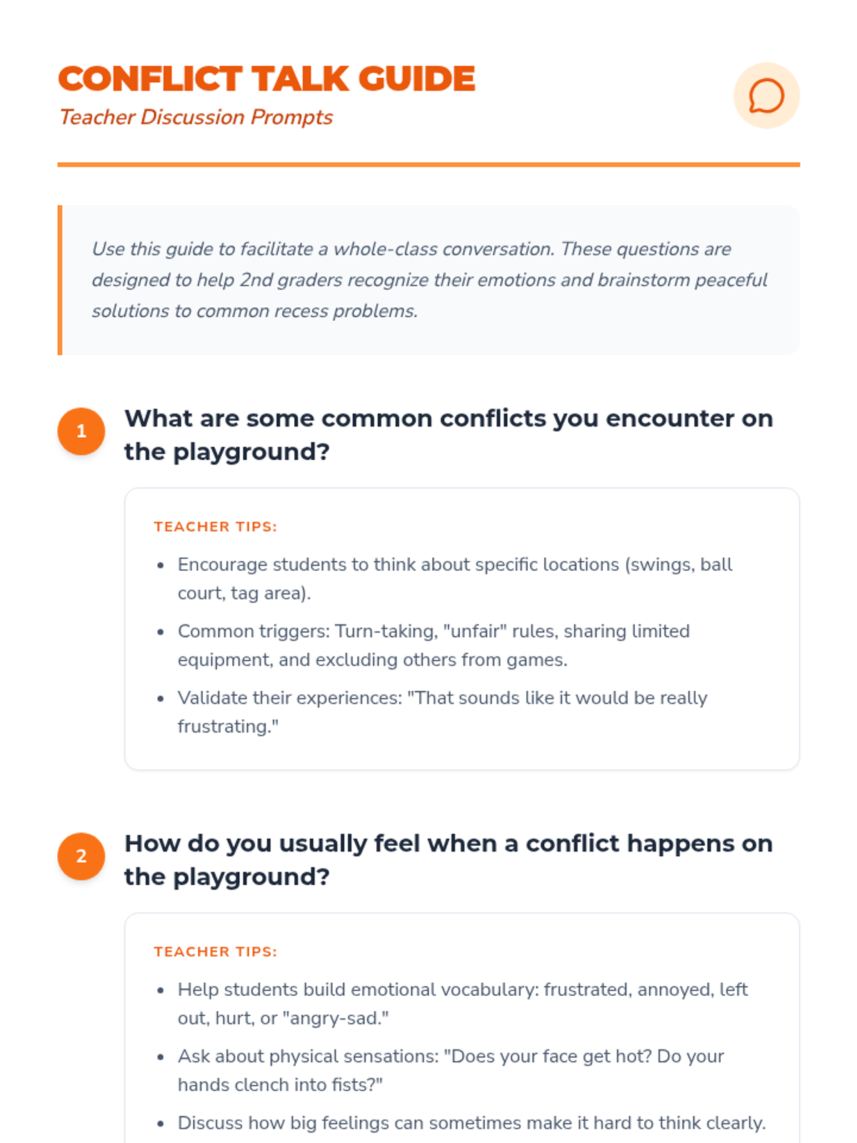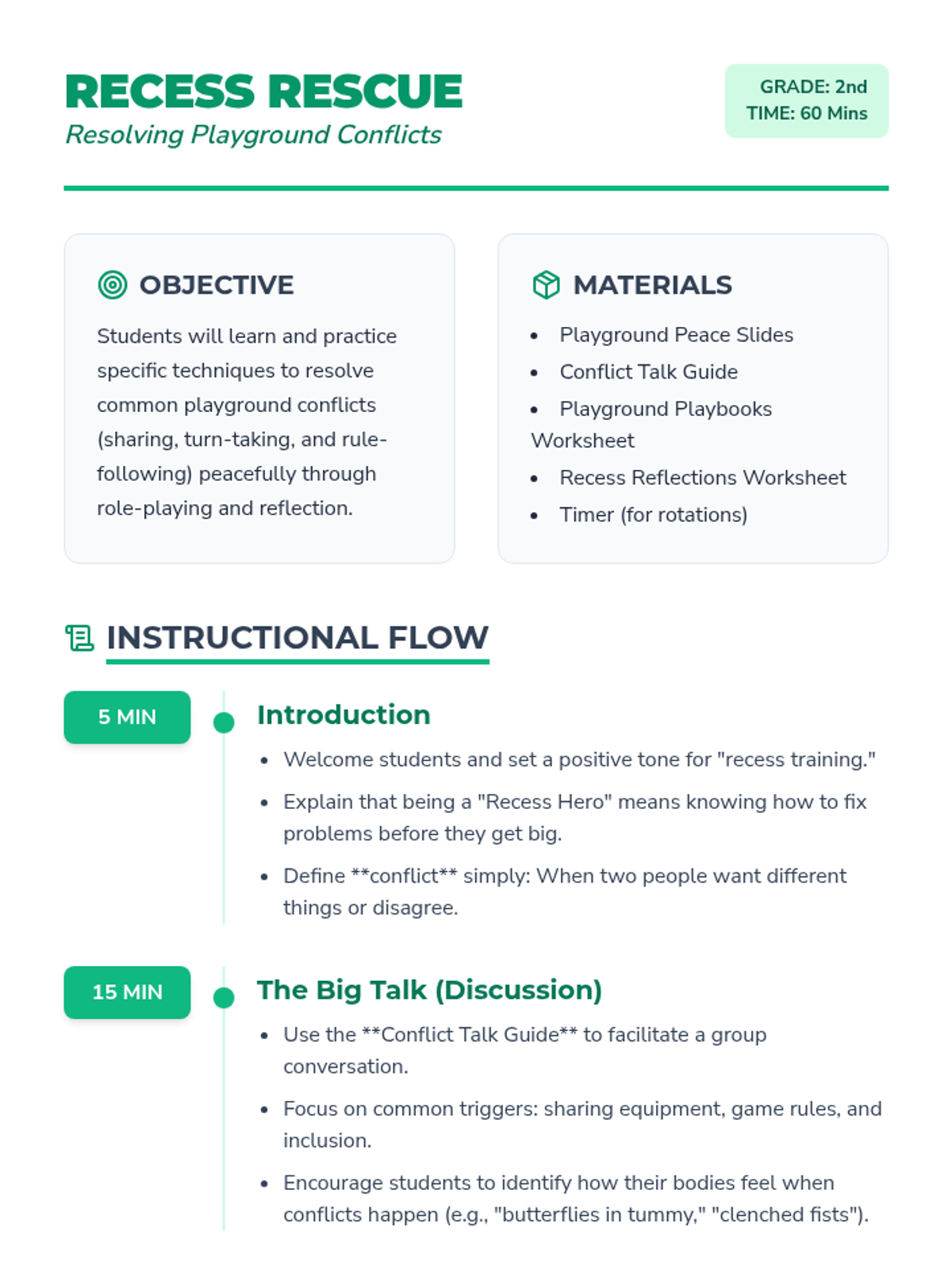 A comprehensive 2nd-grade lesson focused on teaching students how to identify and resolve common playground conflicts peacefully through role-playing and reflection.