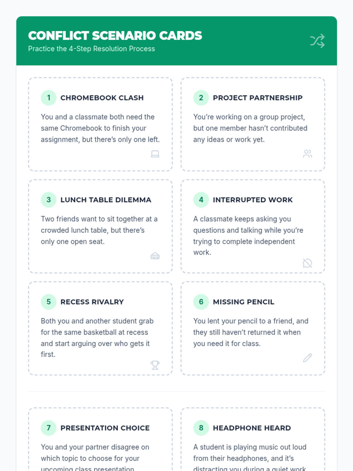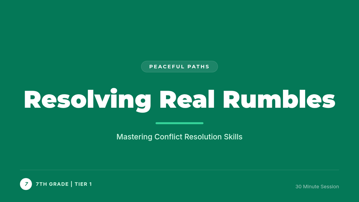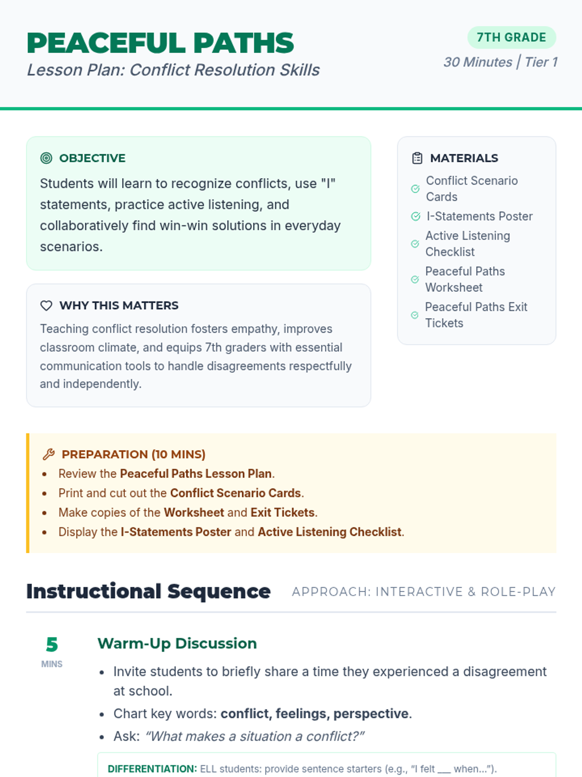 A 30-minute Tier 1 lesson for 7th graders focused on a 4-step conflict resolution process (Identify, I-Statements, Active Listening, Win-Win) to handle disagreements peacefully.