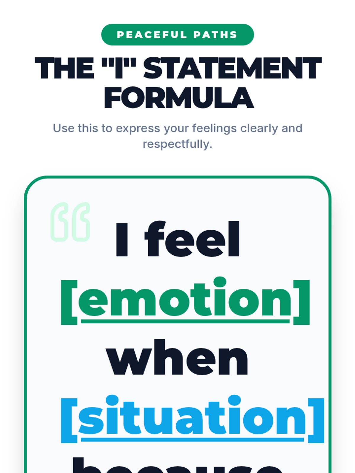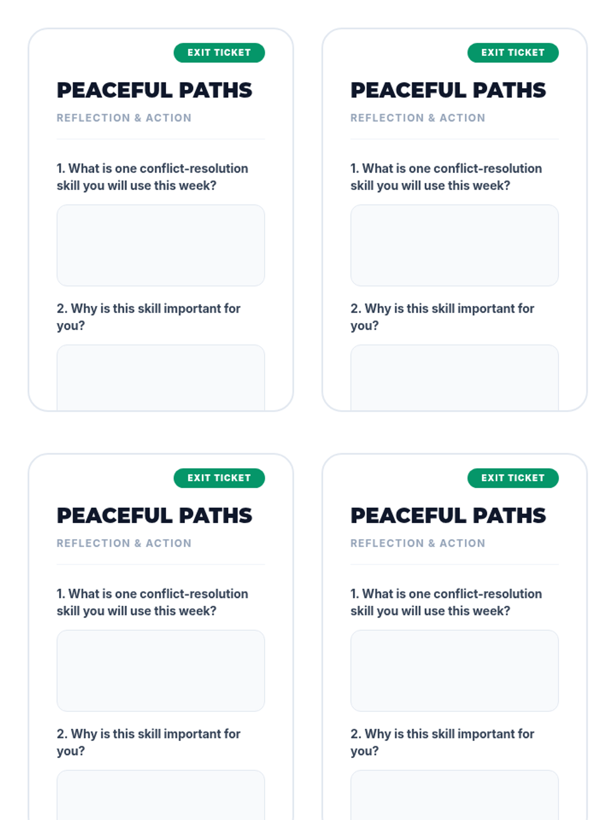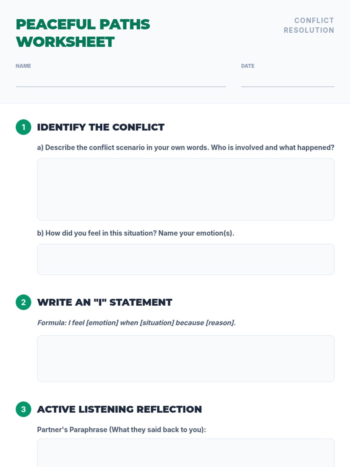 A 30-minute Tier 1 lesson for 7th graders focused on a 4-step conflict resolution process (Identify, I-Statements, Active Listening, Win-Win) to handle disagreements peacefully.