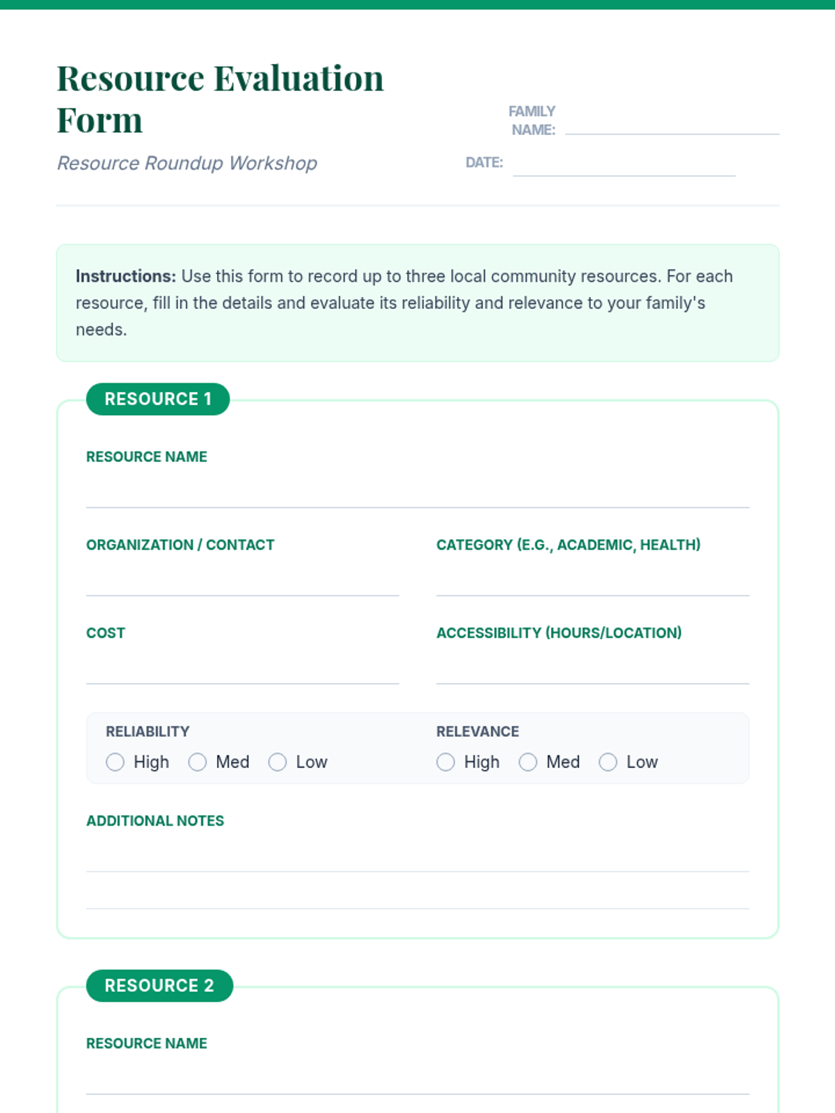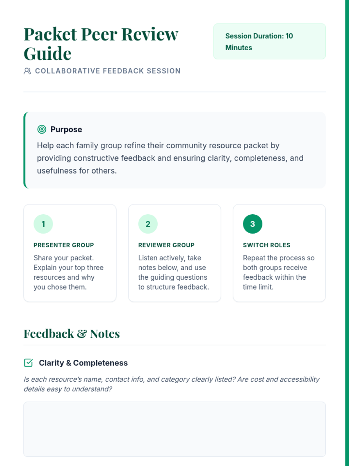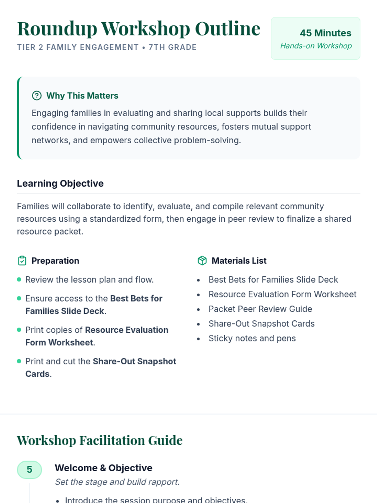 A collaborative 45-minute workshop for 7th-grade families to identify, evaluate, and share community resources, fostering mutual support and practical local knowledge.