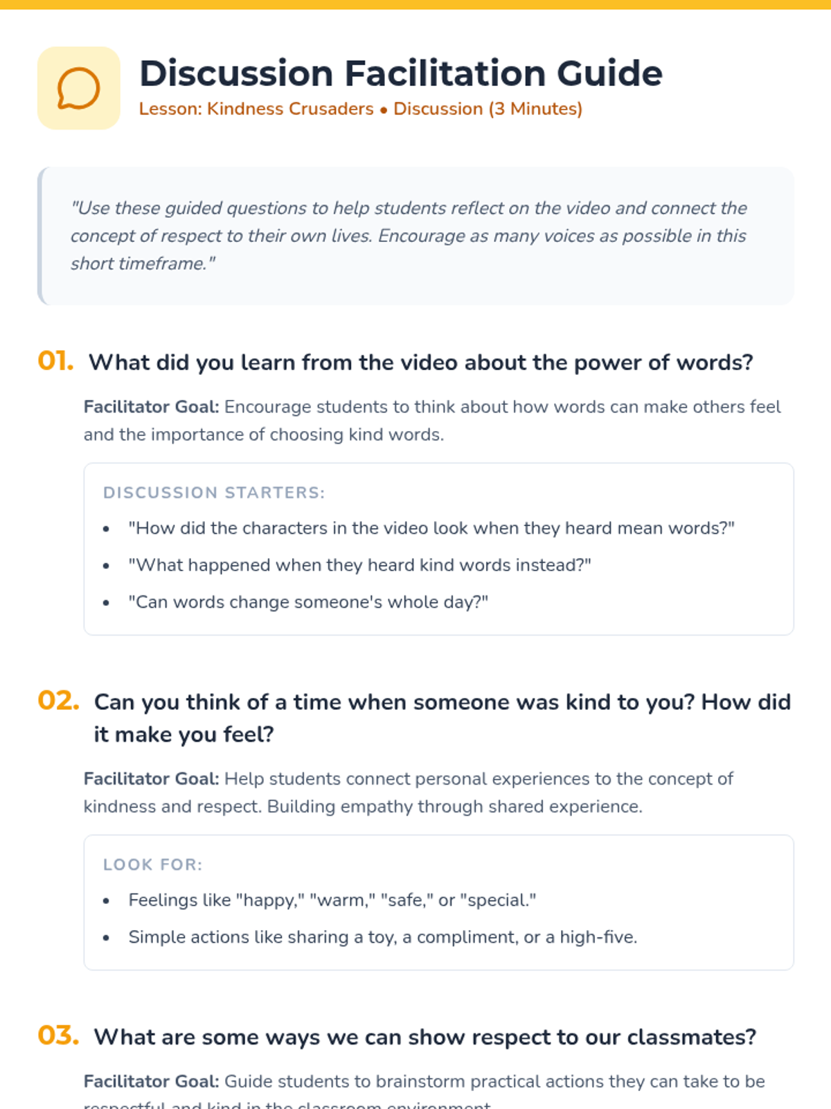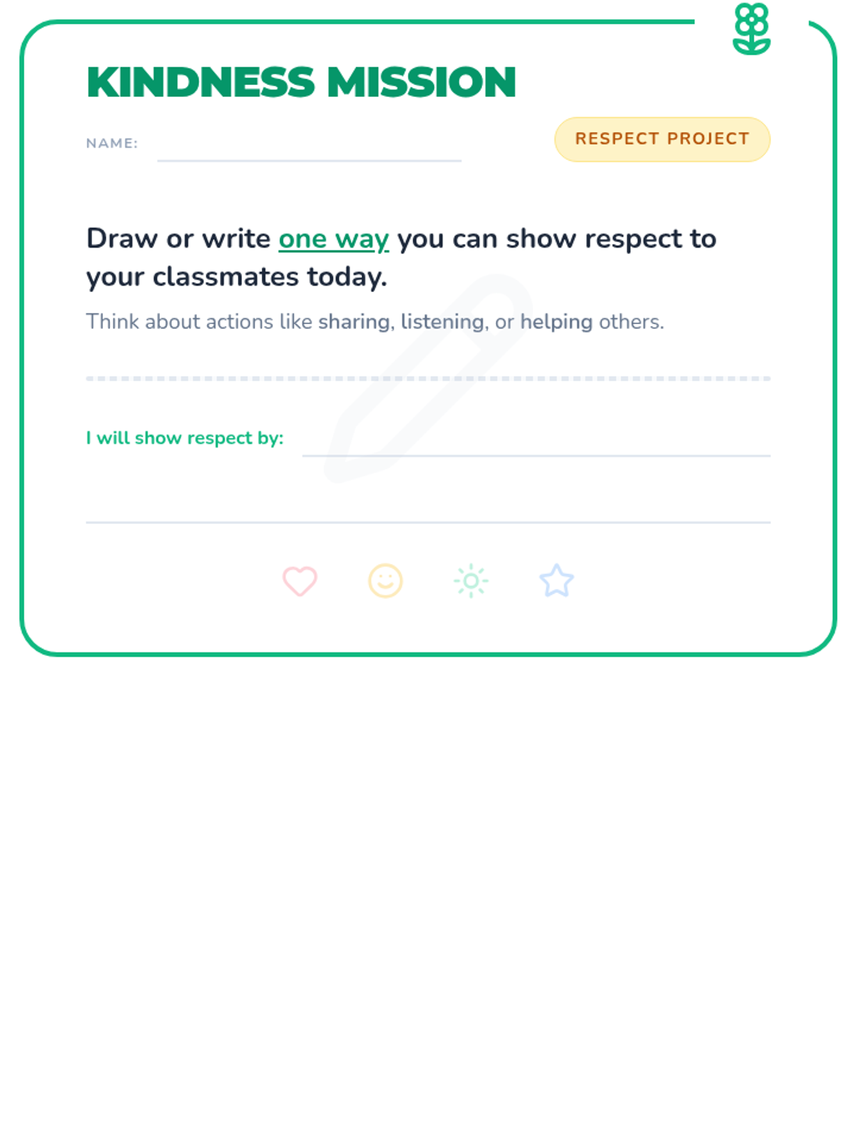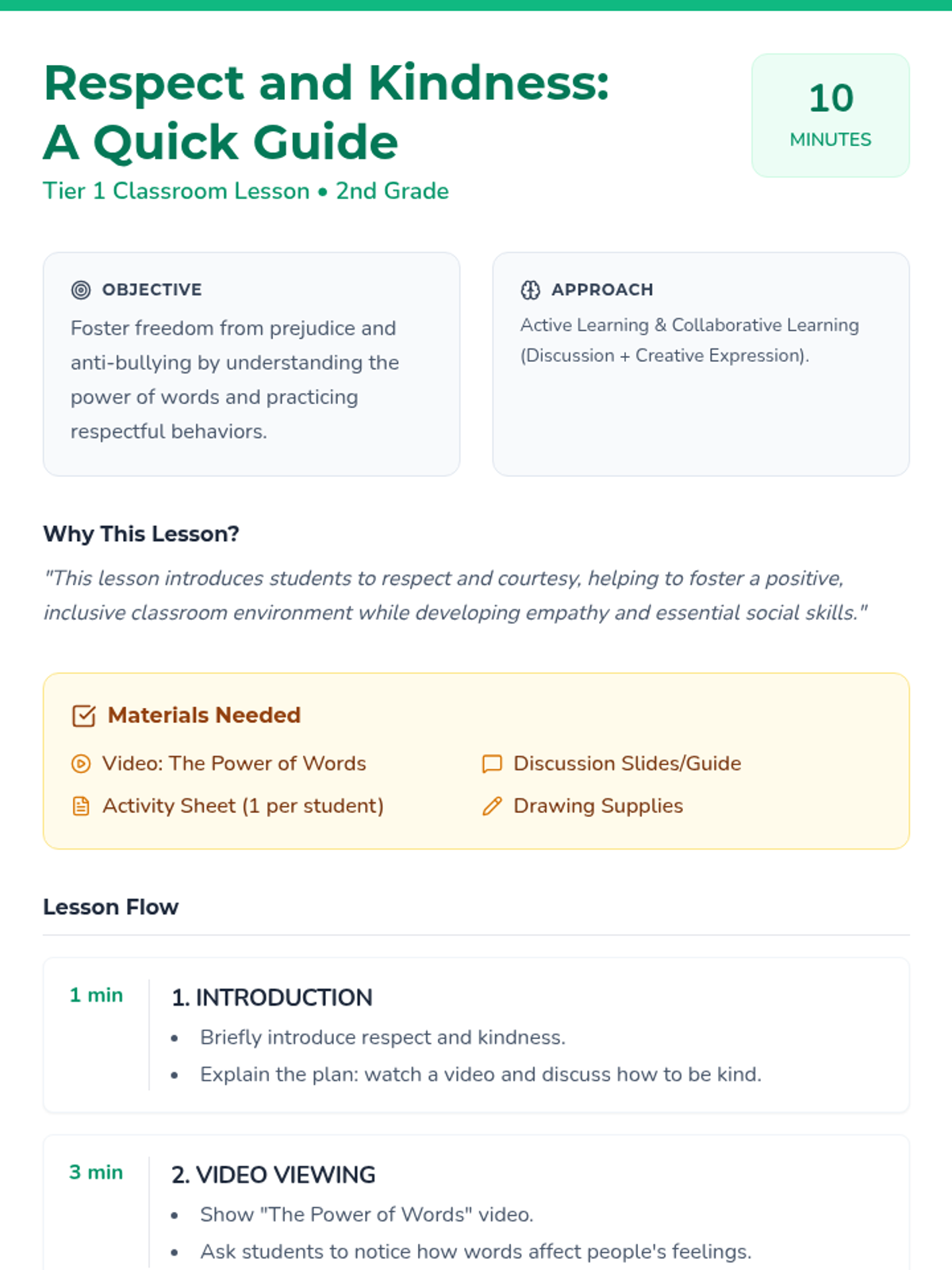 A short, impactful lesson for 2nd graders on the importance of respect, kindness, and anti-bullying, featuring a video-based discussion and a creative reflection activity.