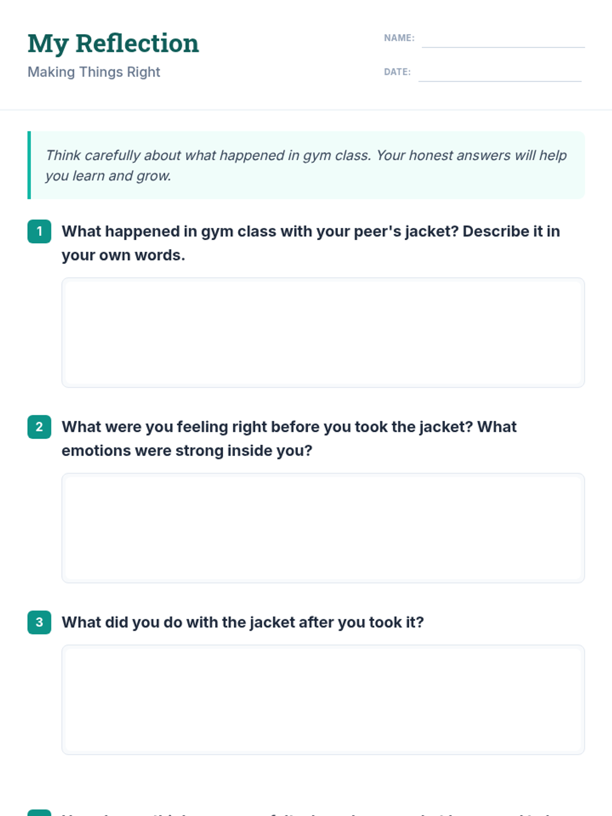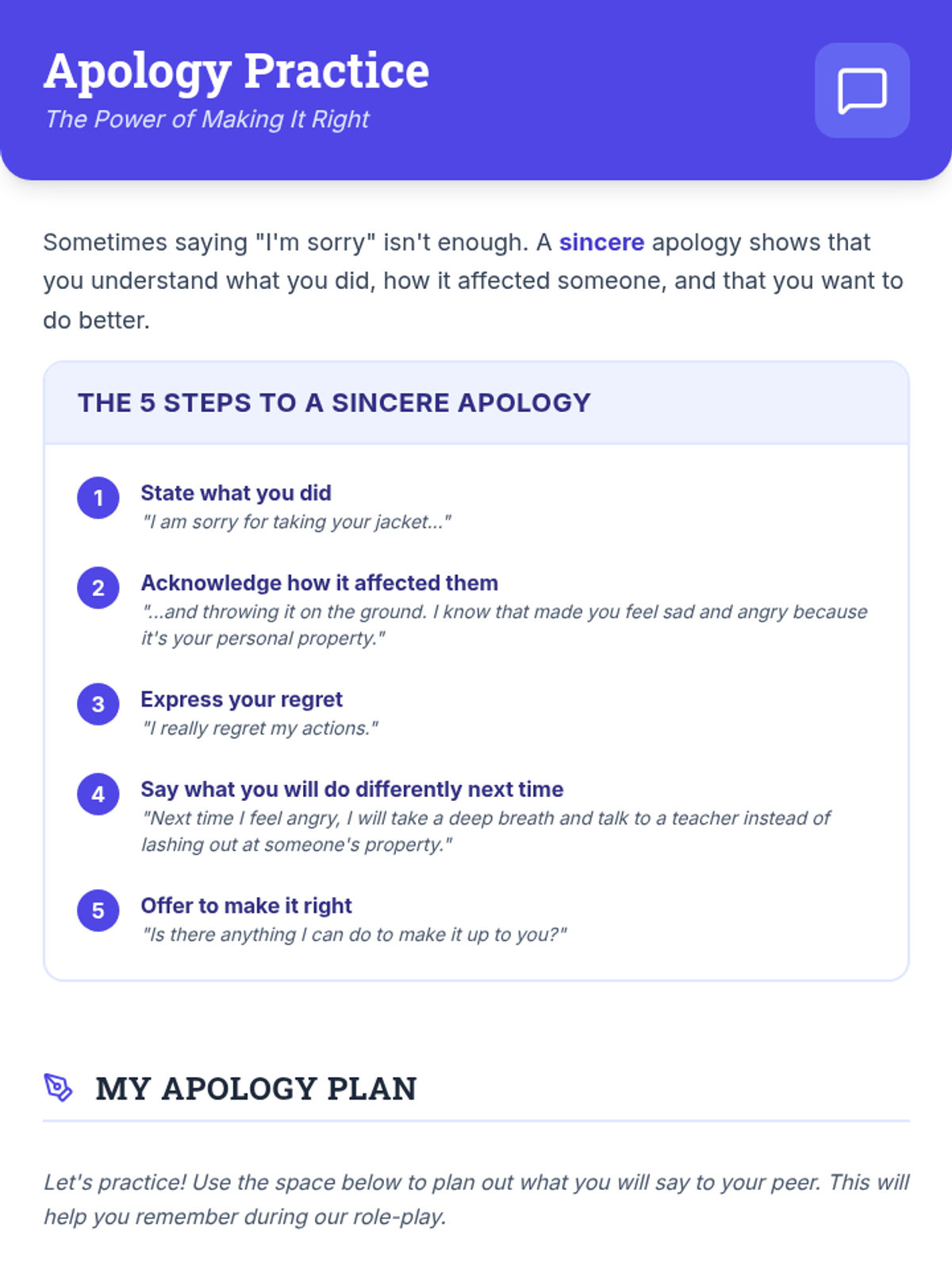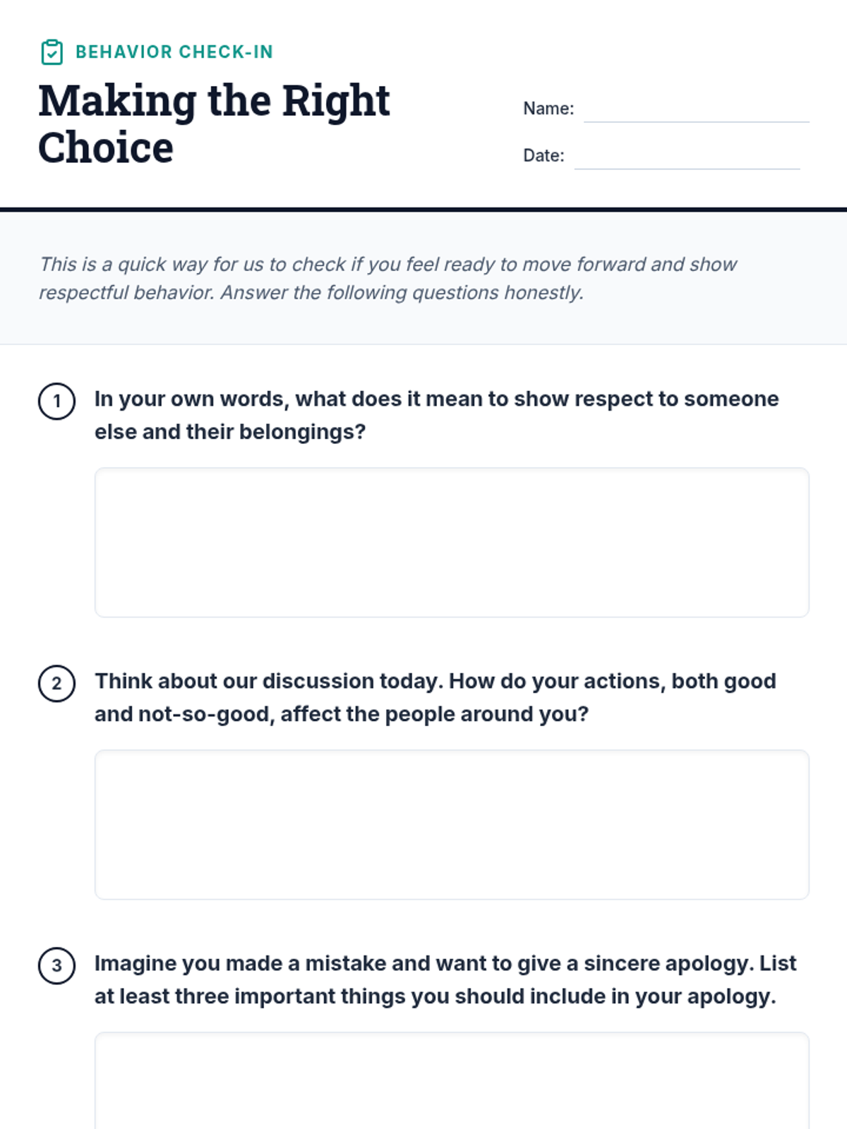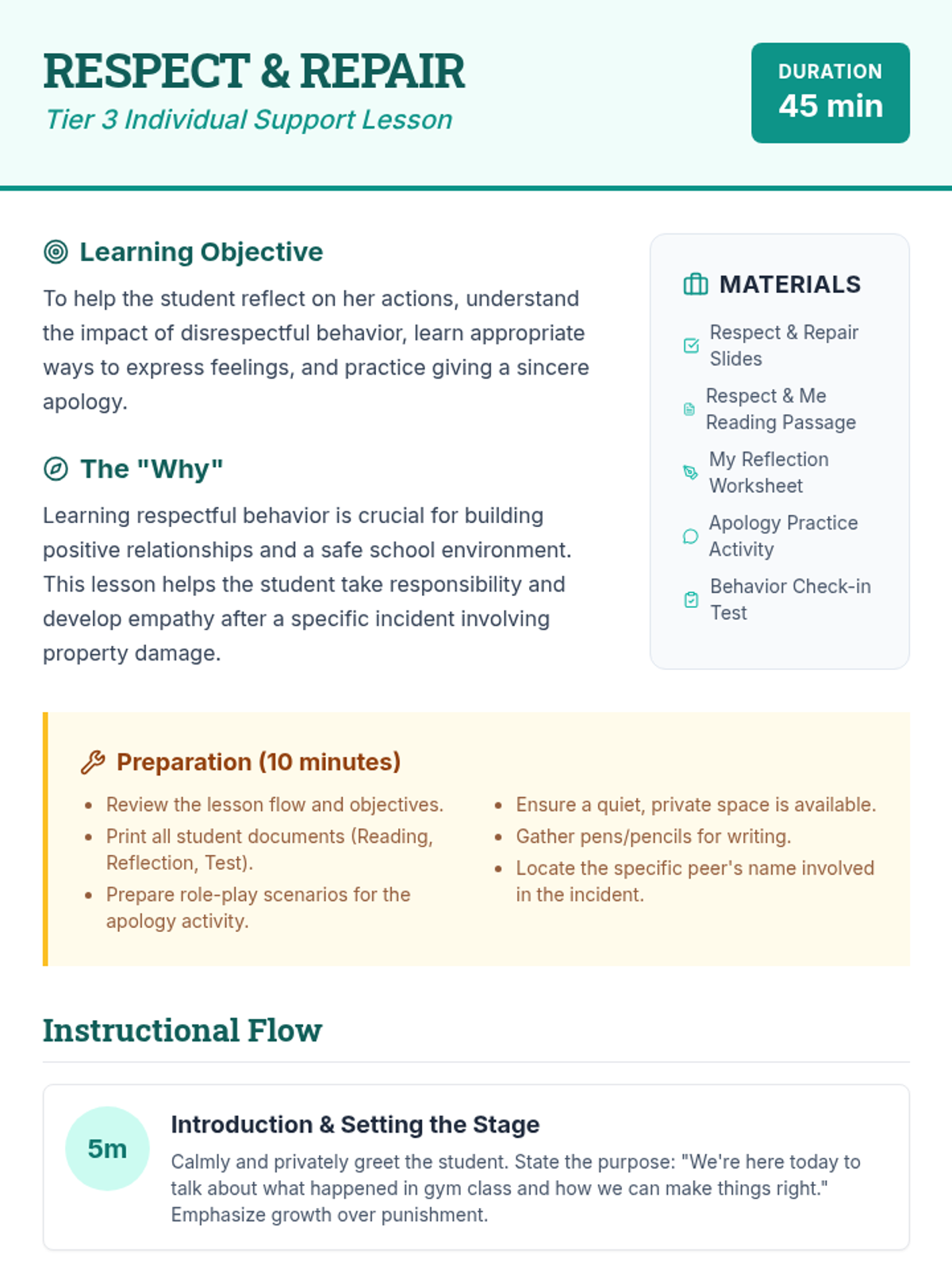 This individual counseling lesson helps students understand the impact of disrespectful behavior, specifically property damage, and guides them through self-reflection and the practice of sincere apologies to repair relationships.