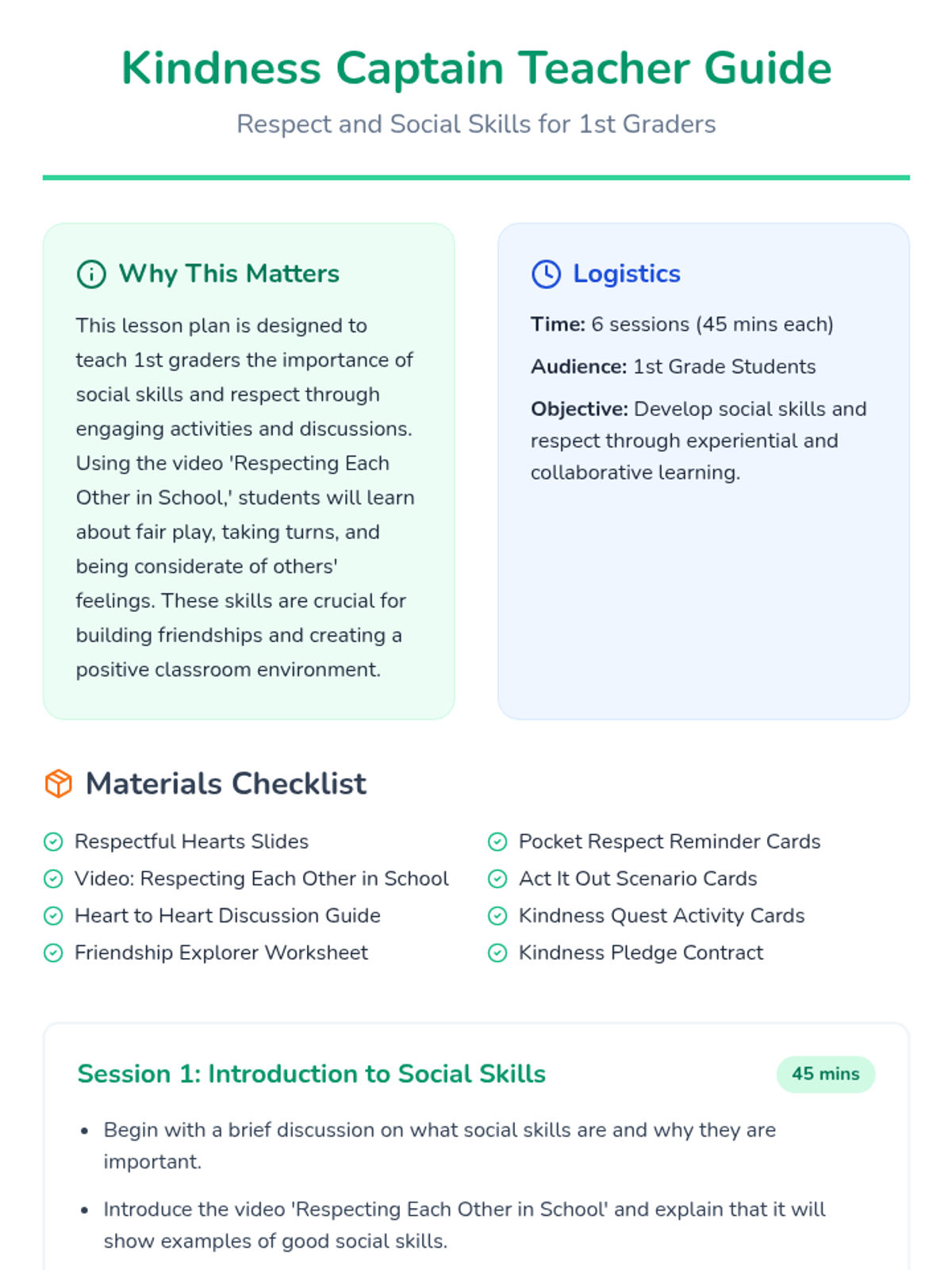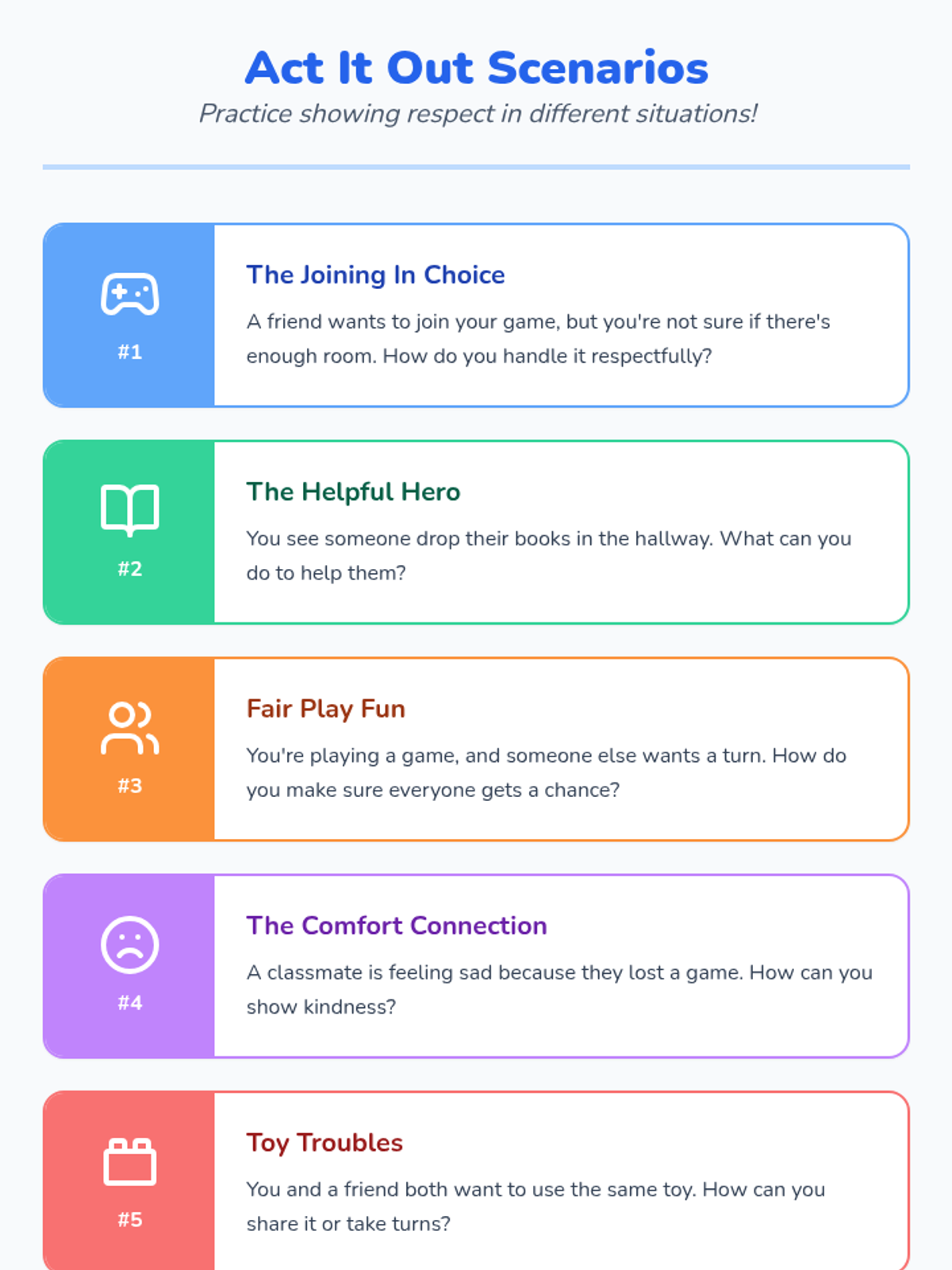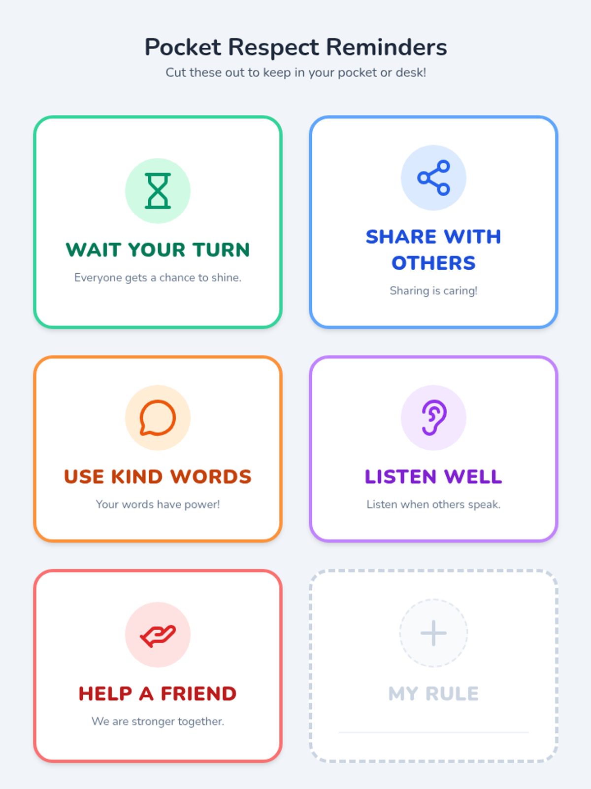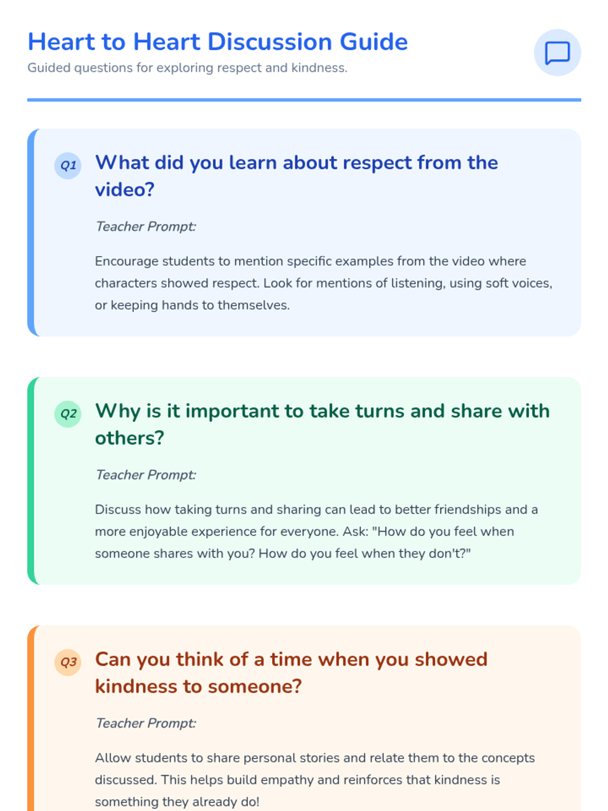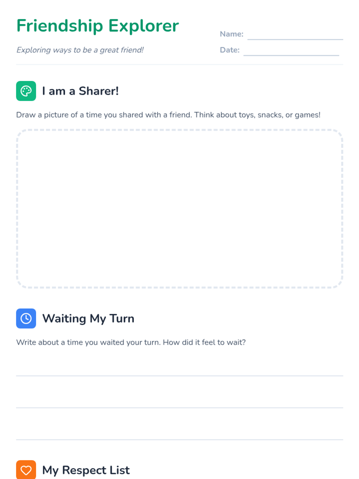 Students explore the foundational concepts of respect, turn-taking, and kindness to build a positive classroom environment and stronger friendships.