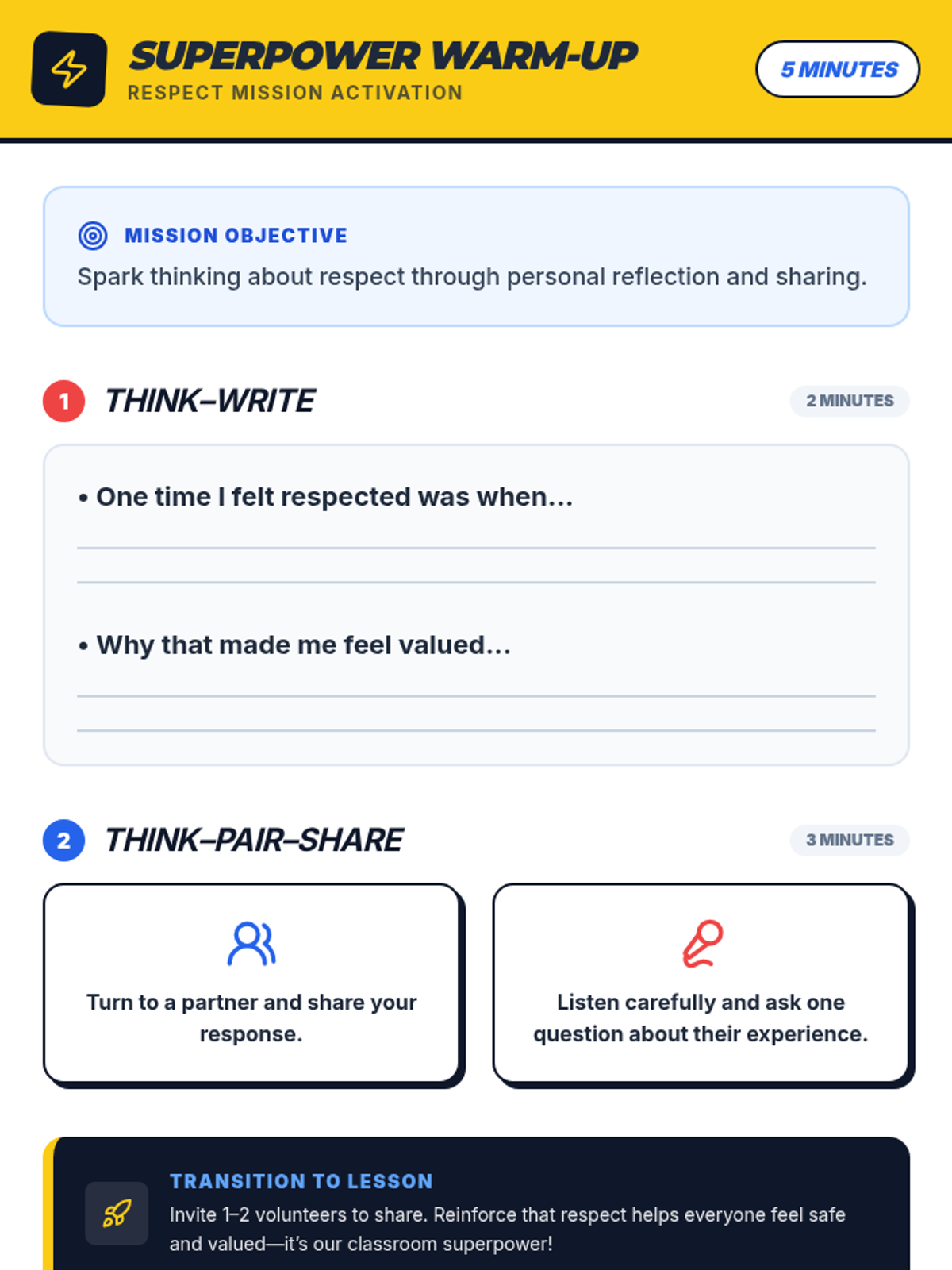In this engaging SEL lesson, 3rd graders explore what respect means, why it’s important, and how to practice respectful behaviors through discussion, role-play, and reflection.