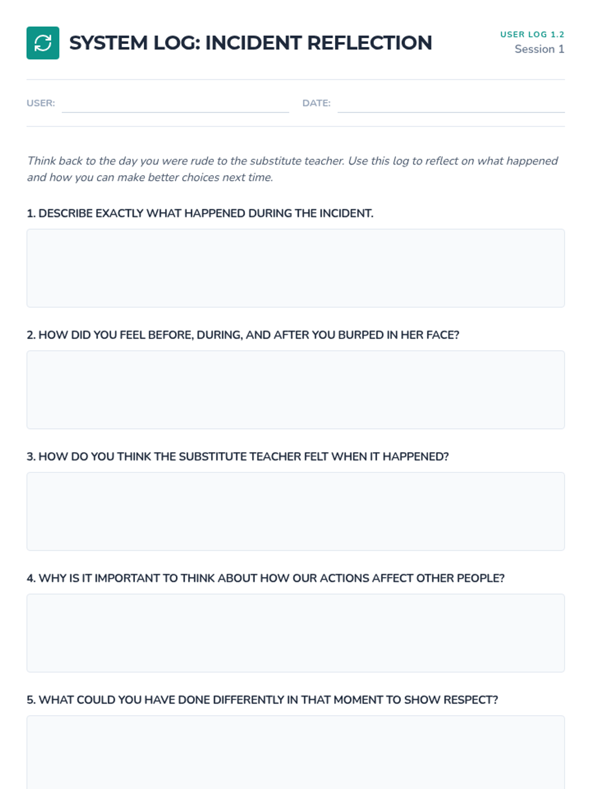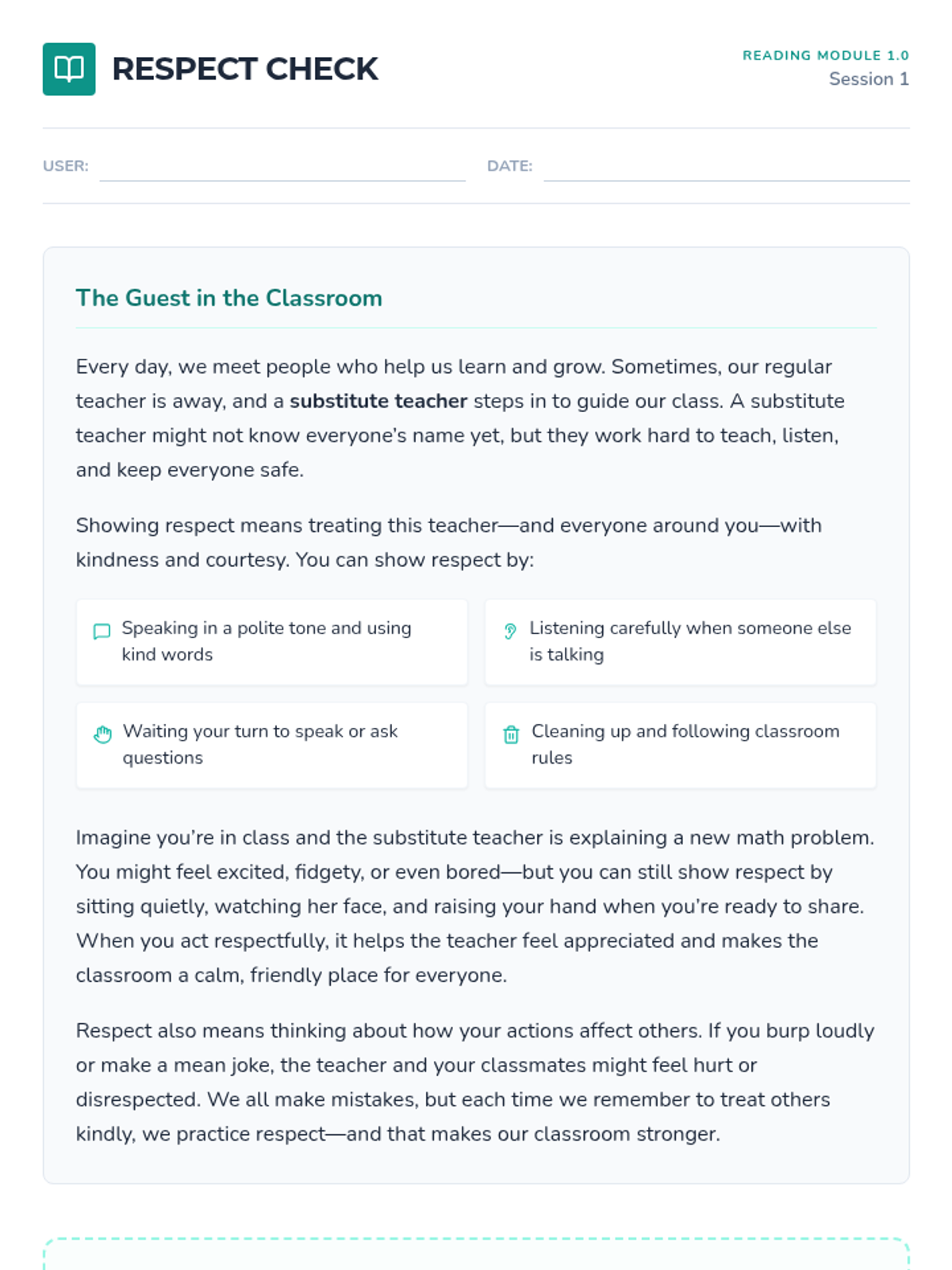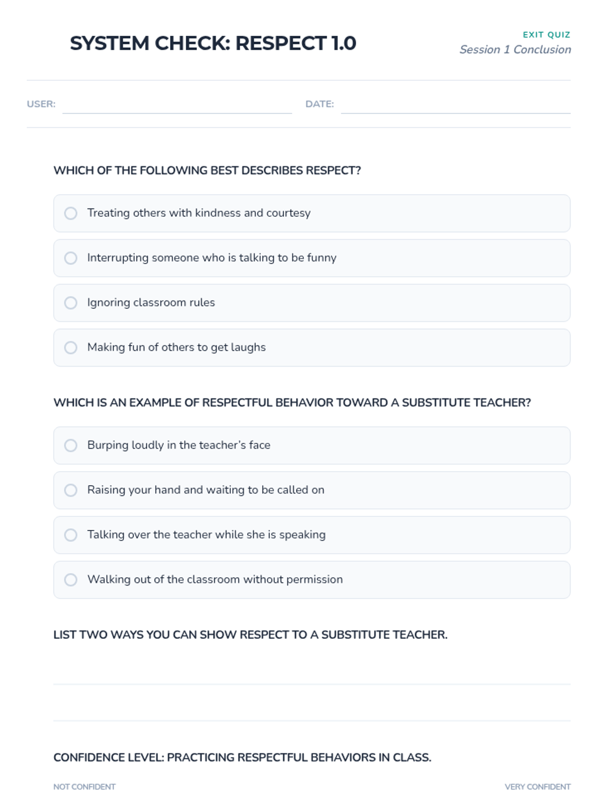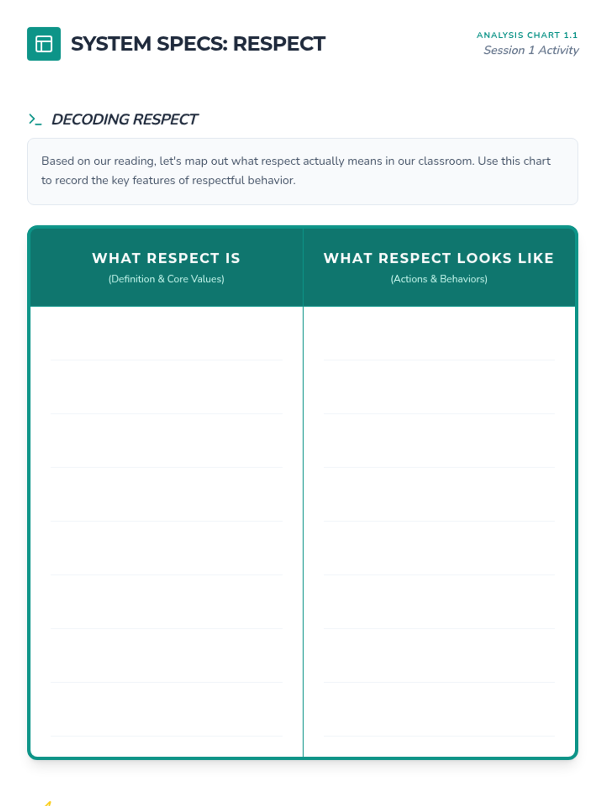 Focuses on defining respect and reflecting on recent behavior to build a foundation of accountability and self-awareness.