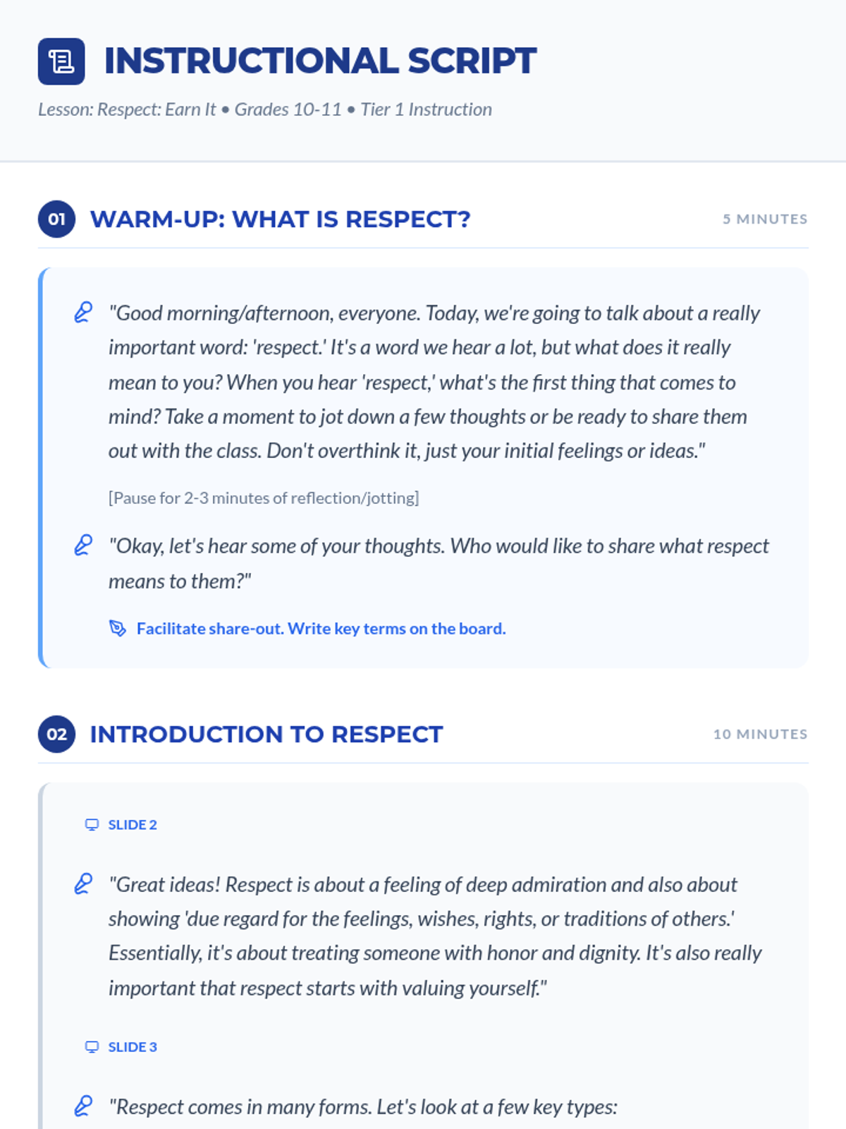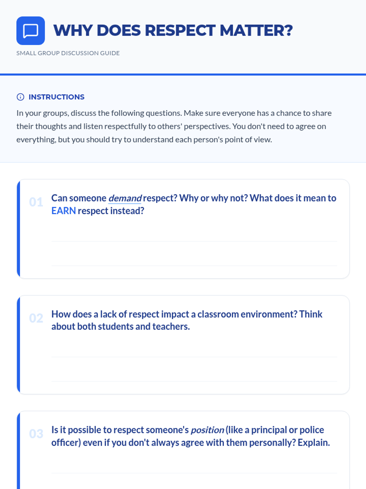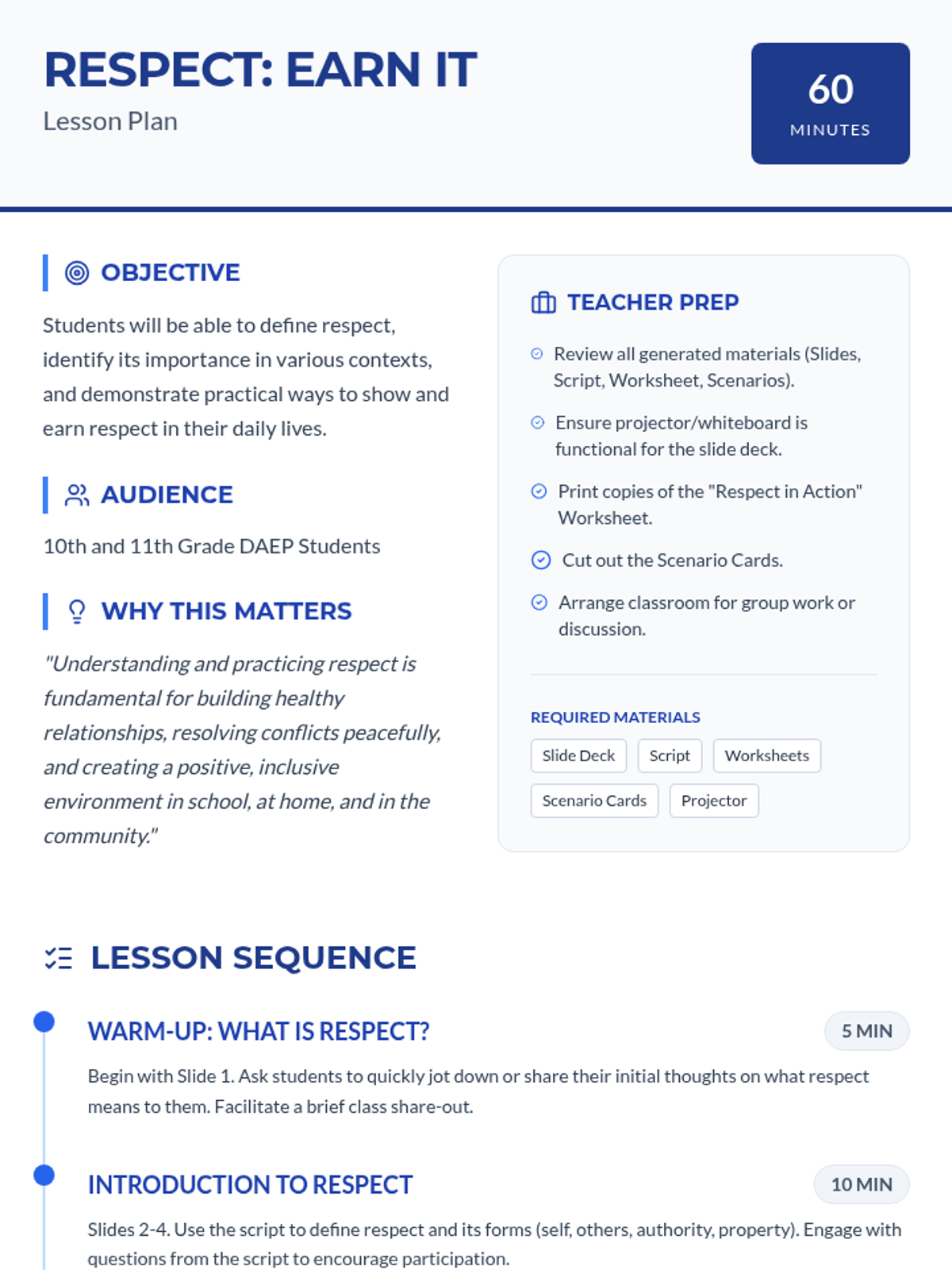 This 60-minute lesson for 10th and 11th-grade students in a DAEP setting explores the multifaceted nature of respect, its impact on relationships and environment, and actionable strategies for giving and earning it. Students engage through discussion, scenario-based problem solving, and personal reflection.