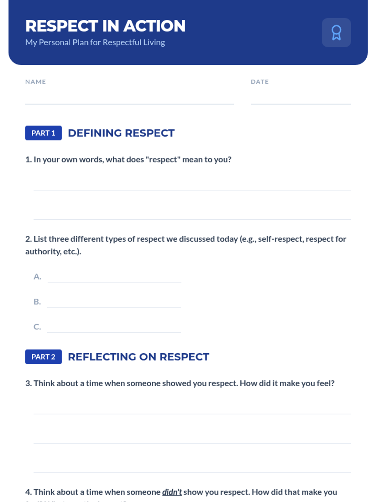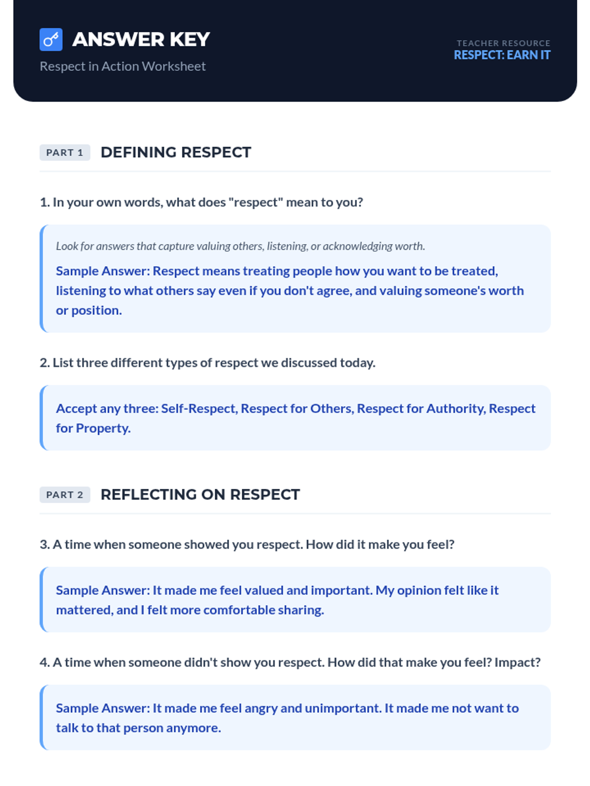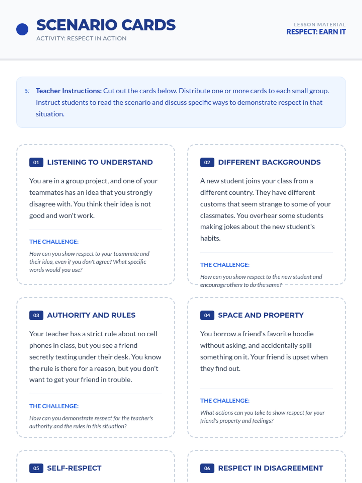 This 60-minute lesson for 10th and 11th-grade students in a DAEP setting explores the multifaceted nature of respect, its impact on relationships and environment, and actionable strategies for giving and earning it. Students engage through discussion, scenario-based problem solving, and personal reflection.
