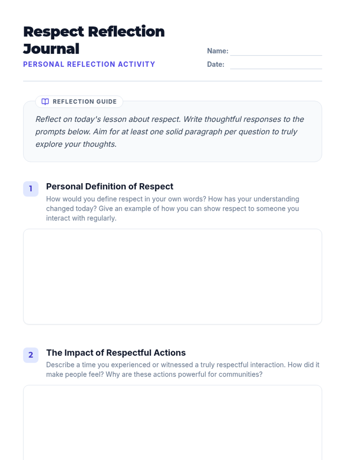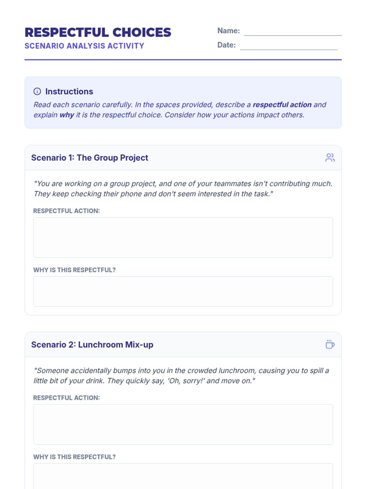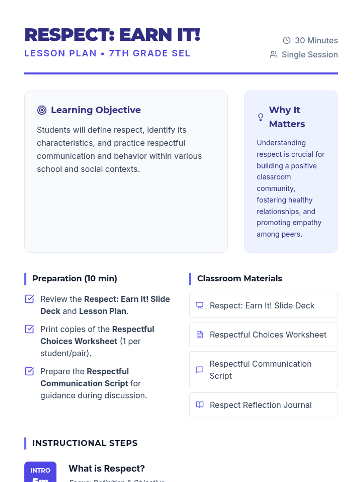 A 30-minute Social-Emotional Learning lesson for 7th-grade students that explores the nature of respect through discussion, scenarios, and reflective practice. Students will learn to define respect beyond just words, identify respectful actions in various contexts, and understand the impact of their choices on their community.
