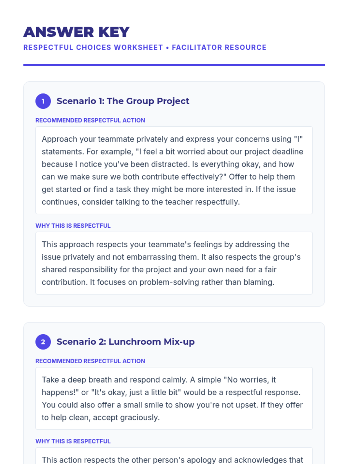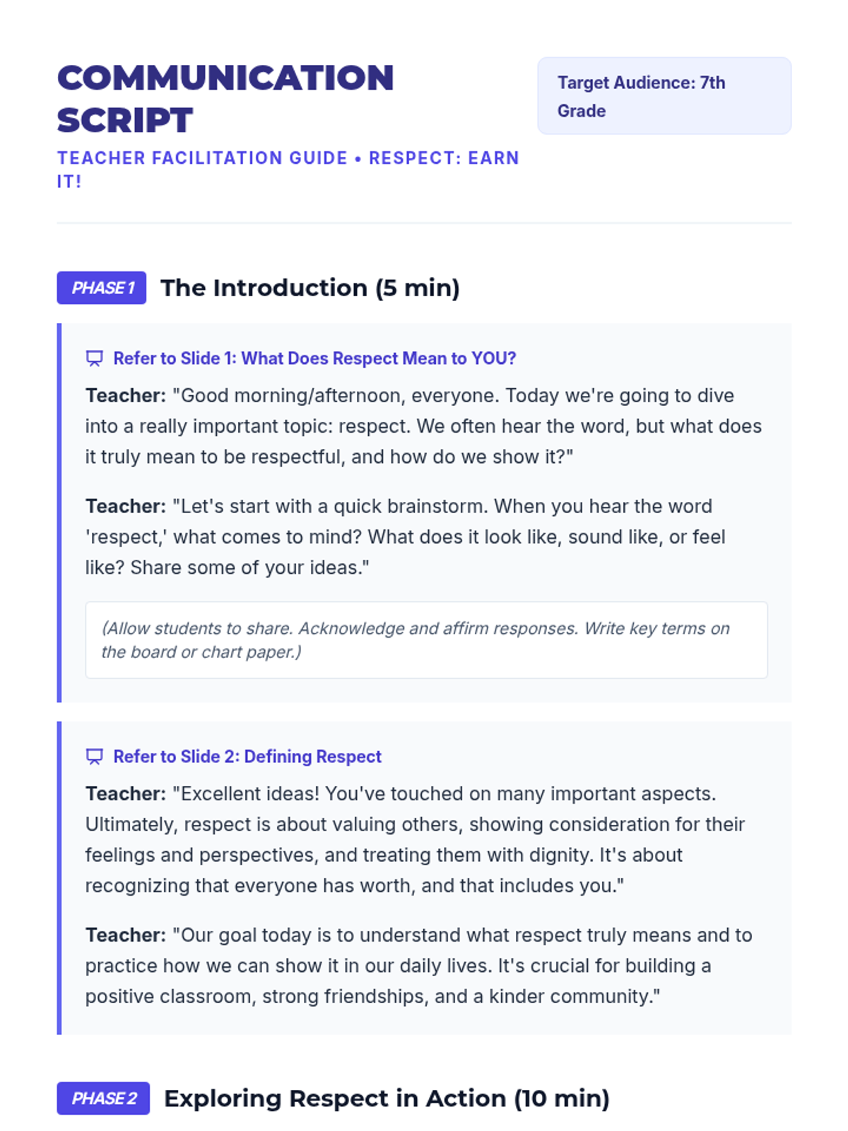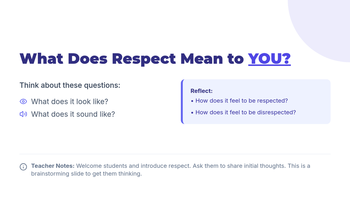 A 30-minute Social-Emotional Learning lesson for 7th-grade students that explores the nature of respect through discussion, scenarios, and reflective practice. Students will learn to define respect beyond just words, identify respectful actions in various contexts, and understand the impact of their choices on their community.