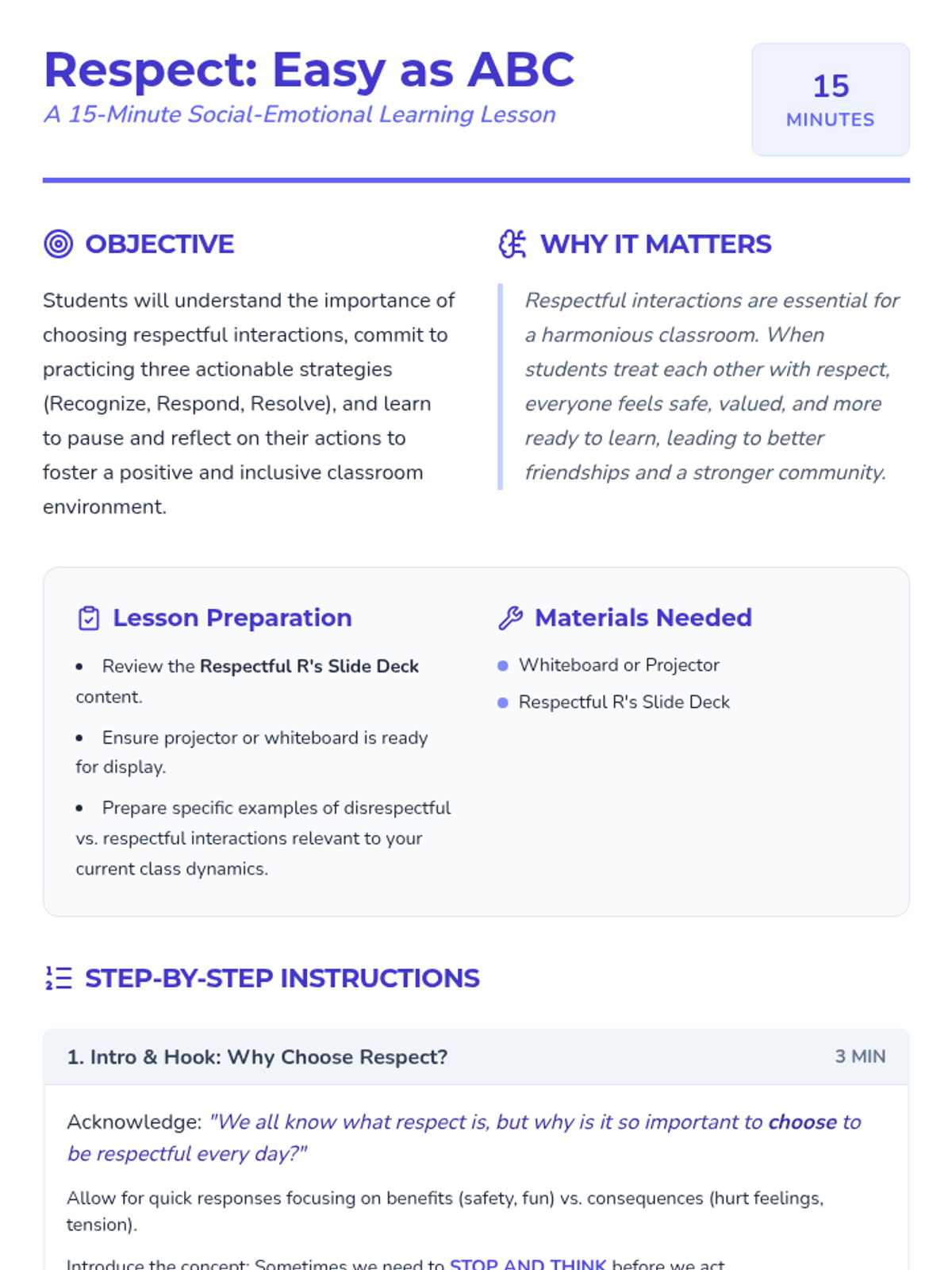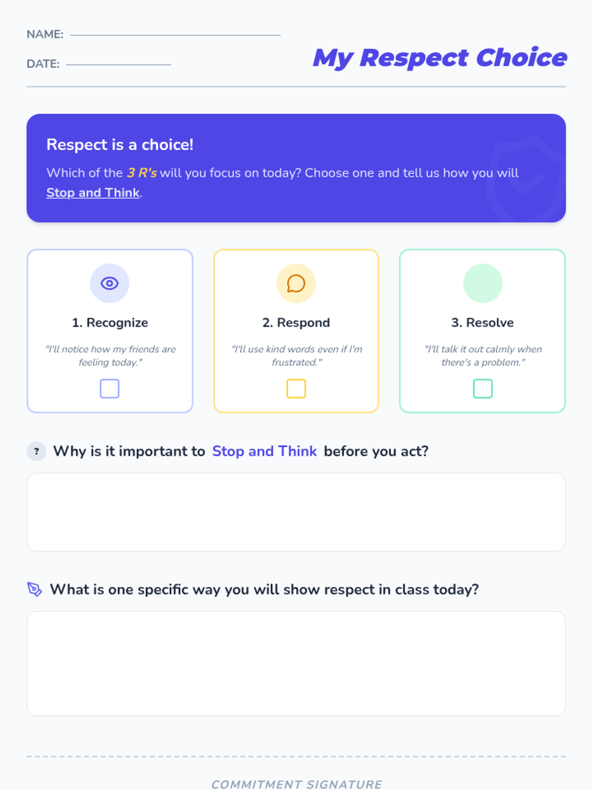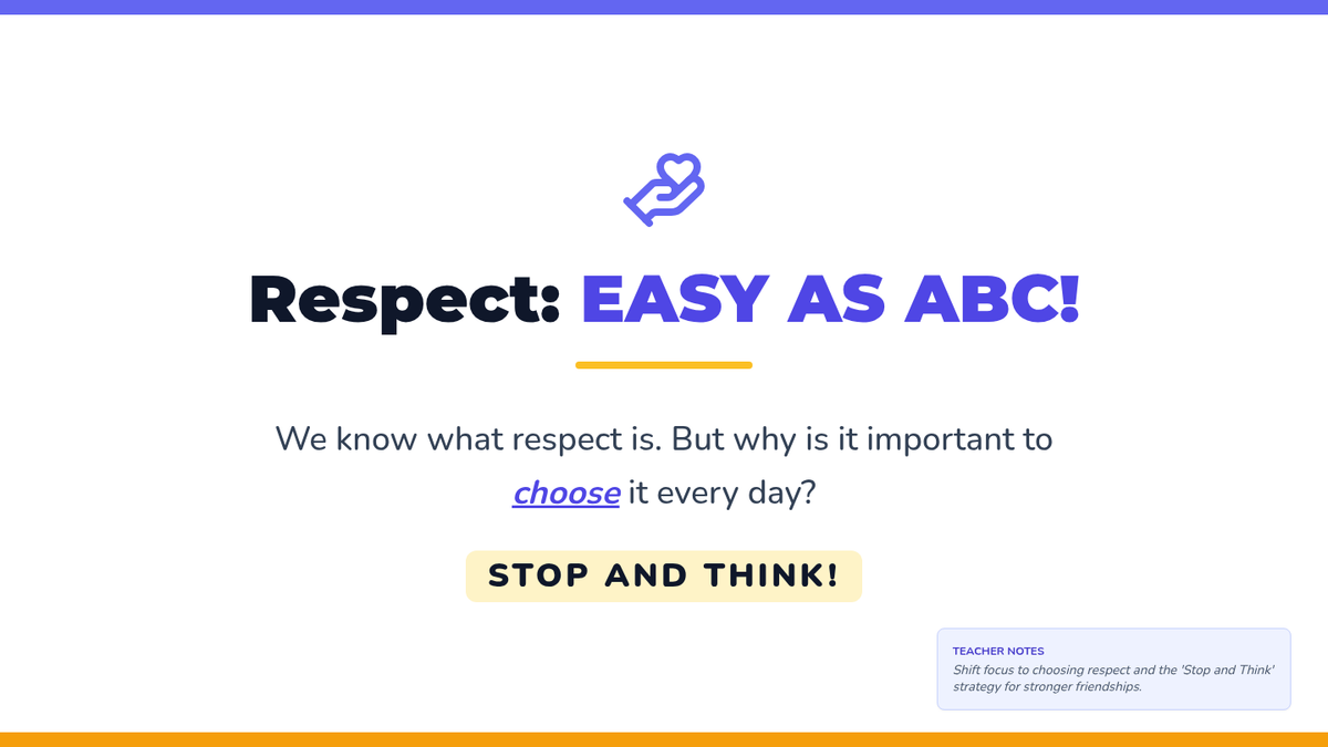 A 15-minute review for 4th graders on fostering respectful interactions through three actionable strategies: Recognize, Respond, and Resolve. Students will learn to pause and reflect before acting to create a more inclusive classroom.