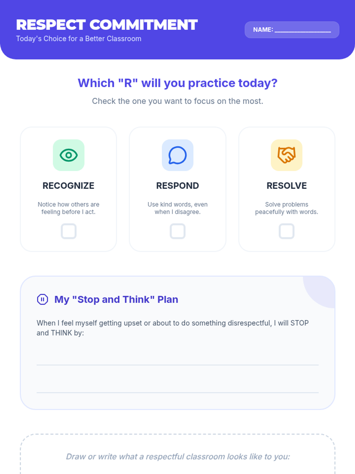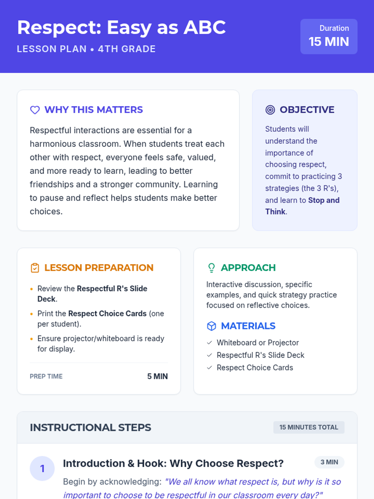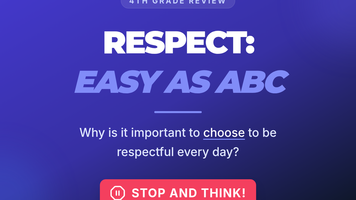 A quick 15-minute review session for 4th graders focused on three actionable strategies for fostering respectful peer interactions: Recognize, Respond, and Resolve.