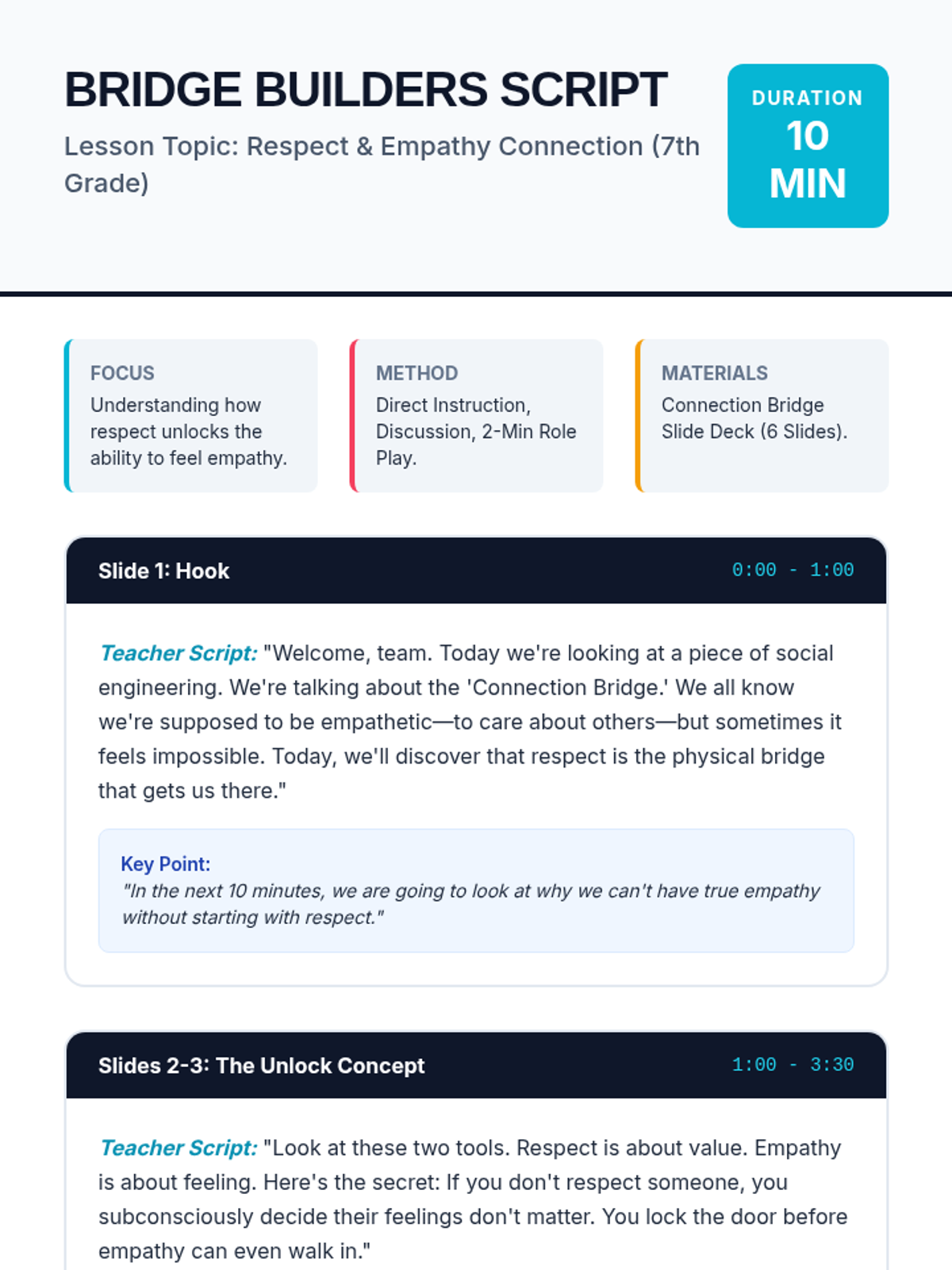 A 10-minute interactive lesson for 7th graders exploring how respect acts as the foundation for empathy, featuring a slide deck and teacher script.