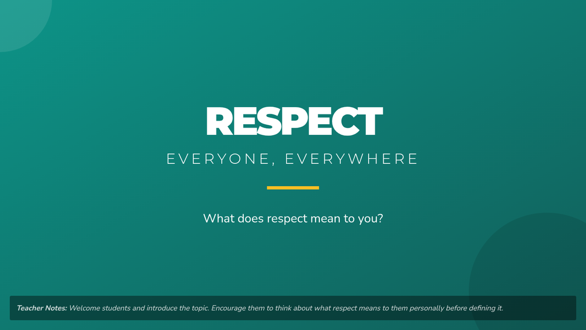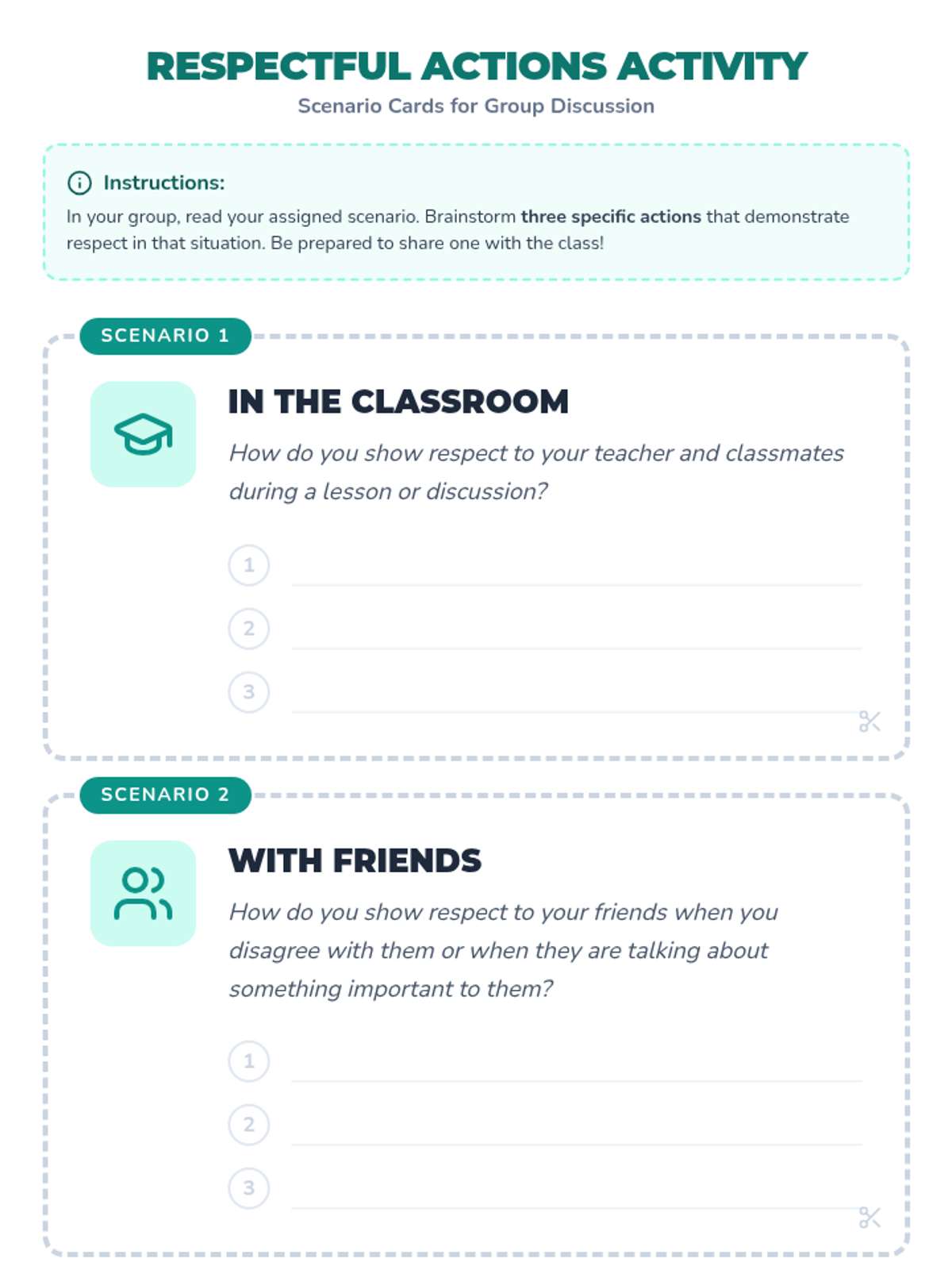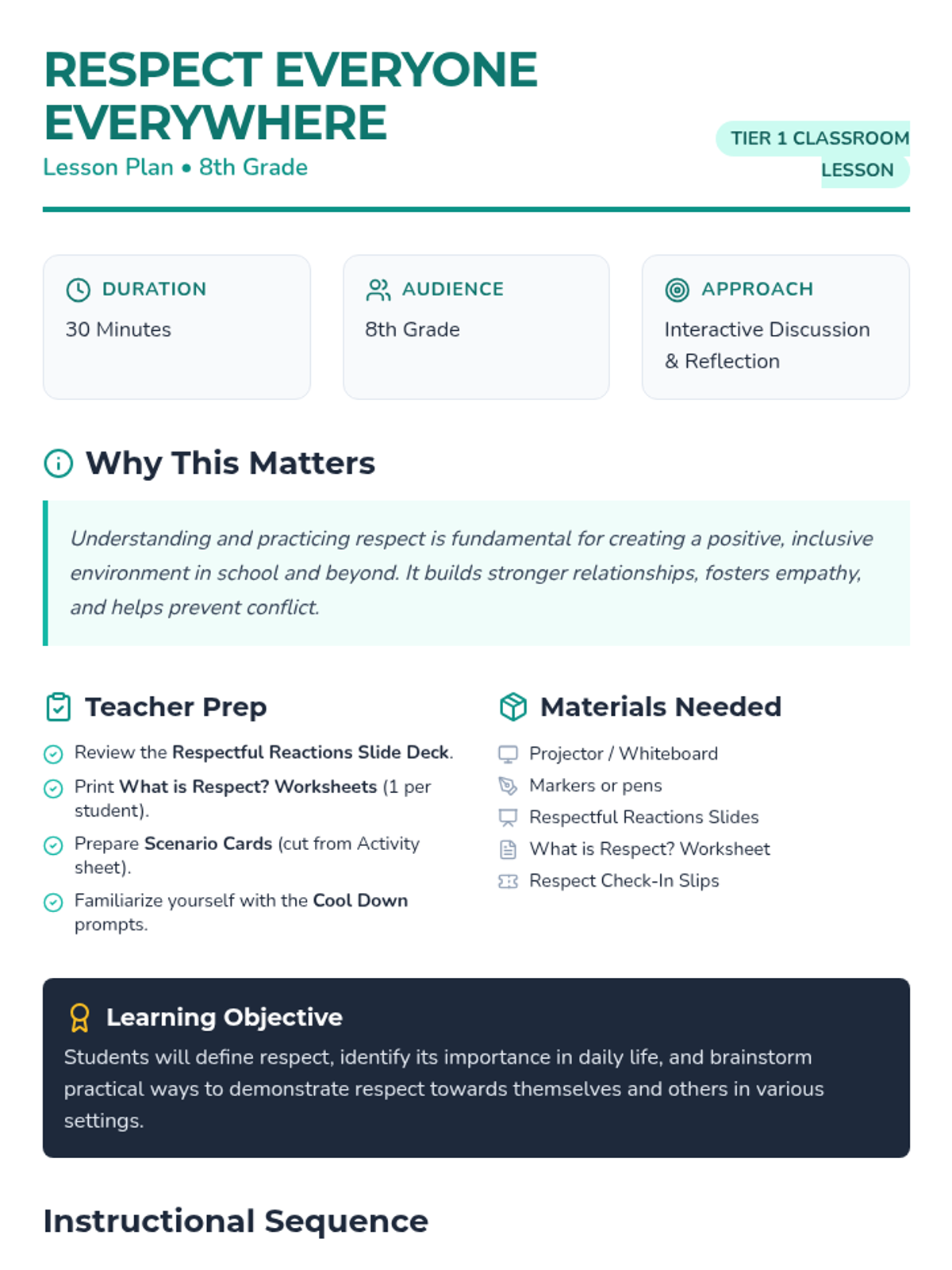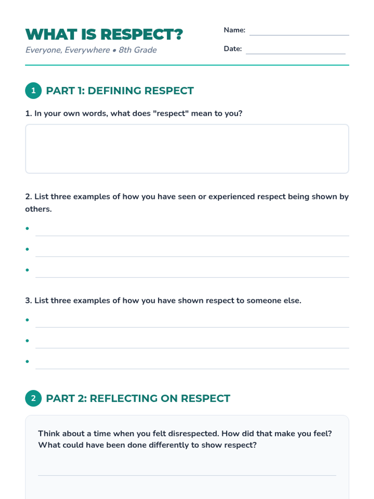 A 30-minute interactive lesson for 8th graders to define respect, understand its importance, and practice respectful actions in various social contexts.