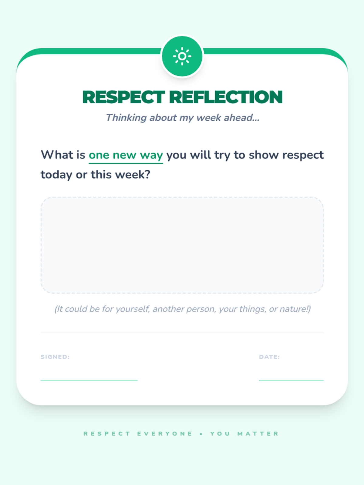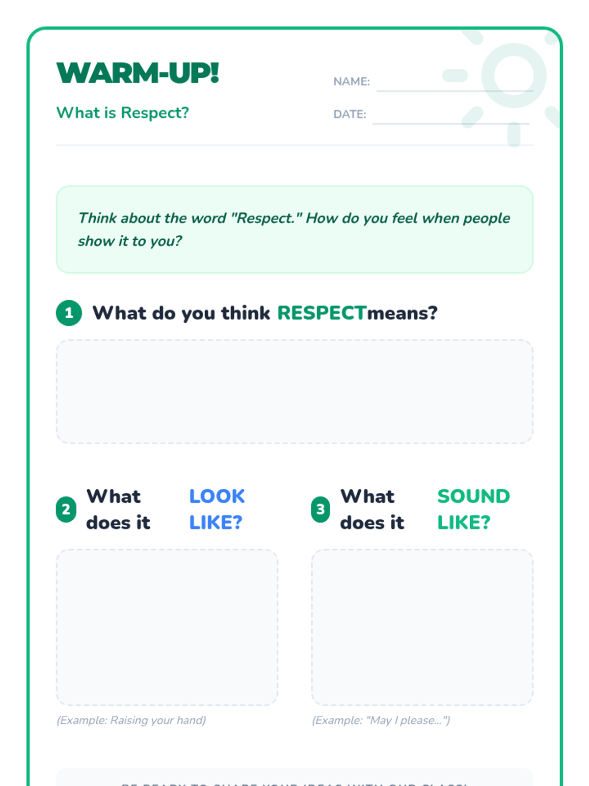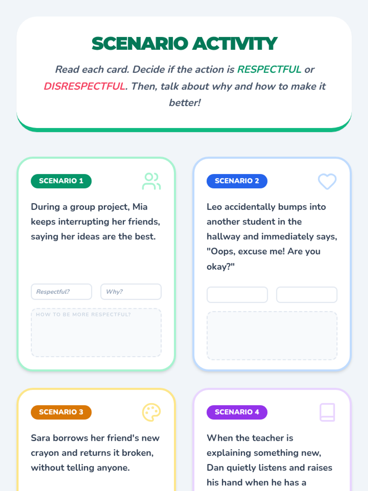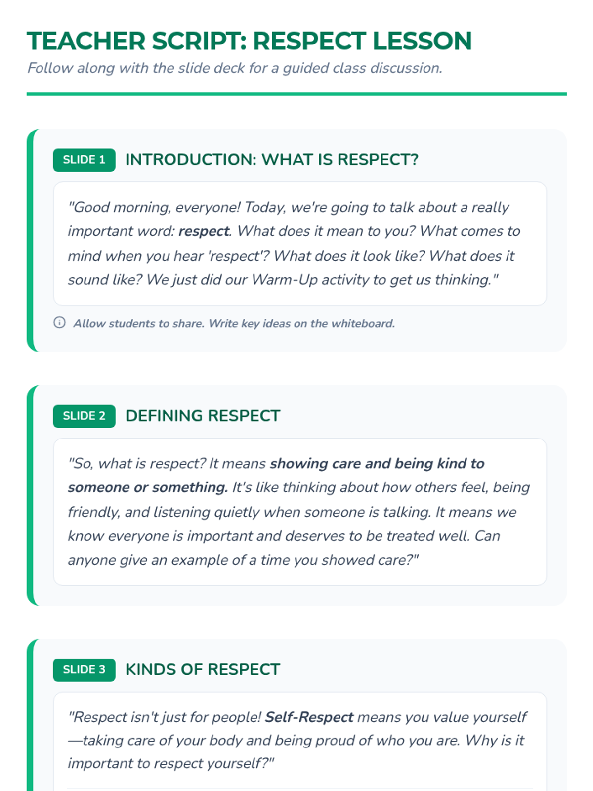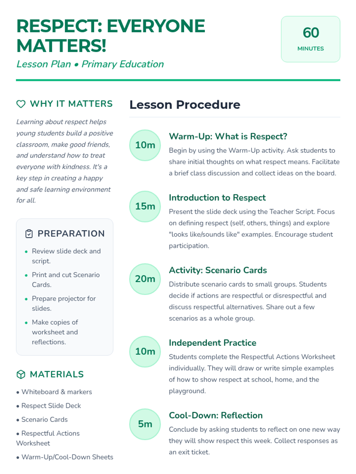 This lesson helps students understand what respect means, identify respectful behaviors, and practice showing respect in their daily lives to build a positive classroom environment.
