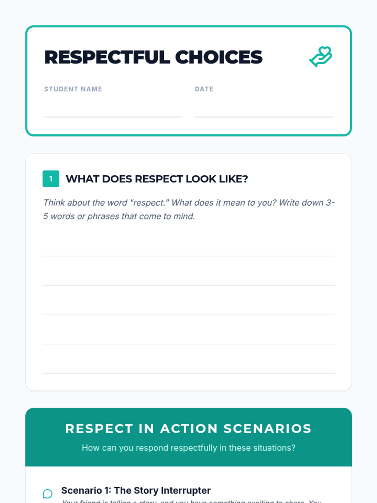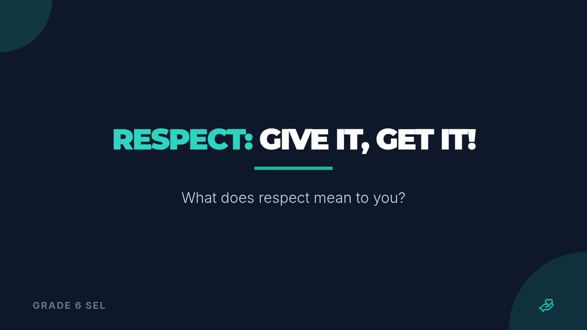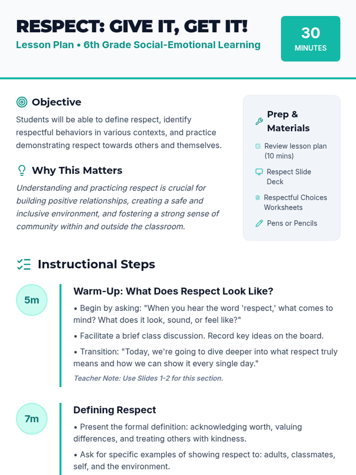 A 30-minute interactive lesson for 6th graders exploring the definition of respect, its importance in relationships, and practical ways to show it to others and themselves.