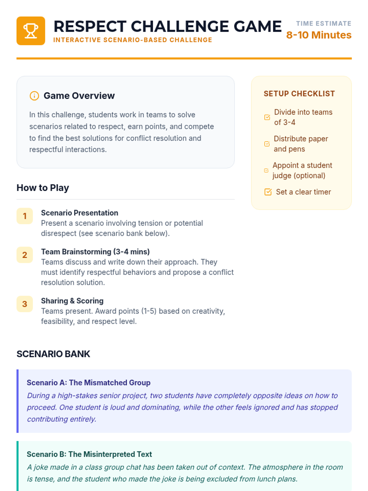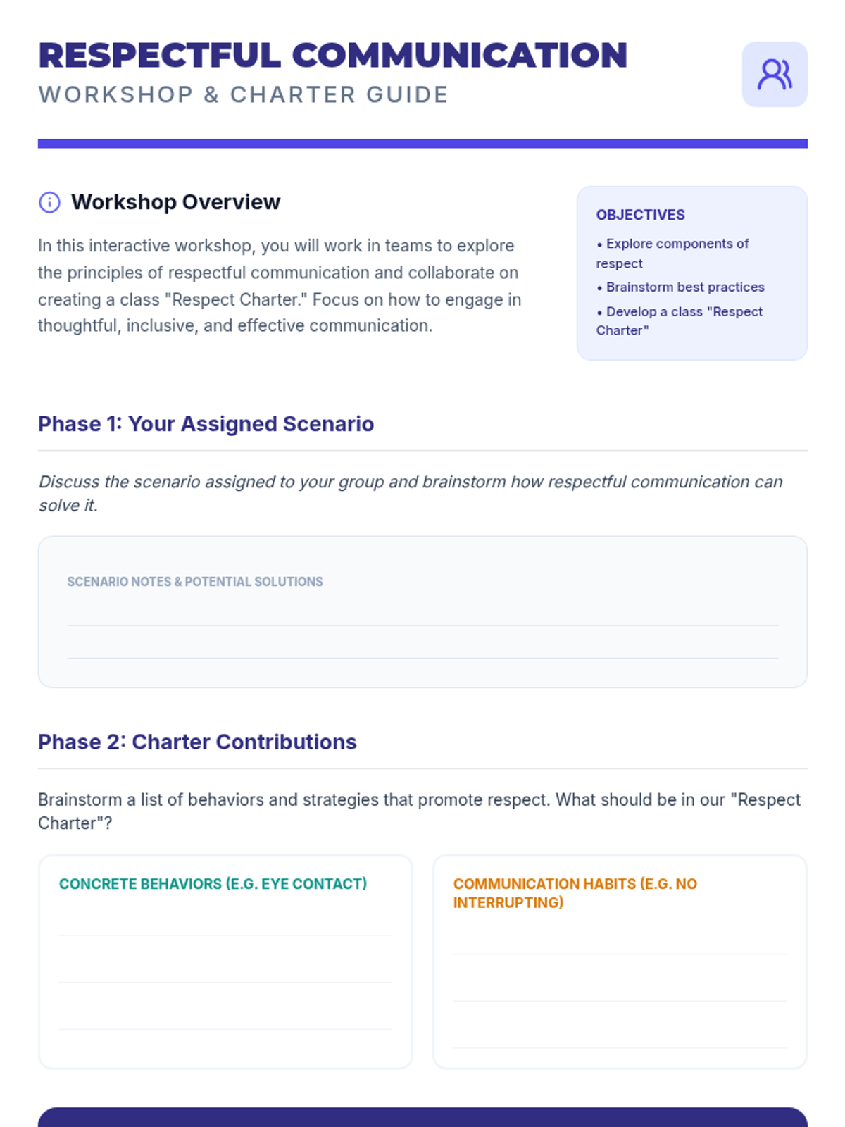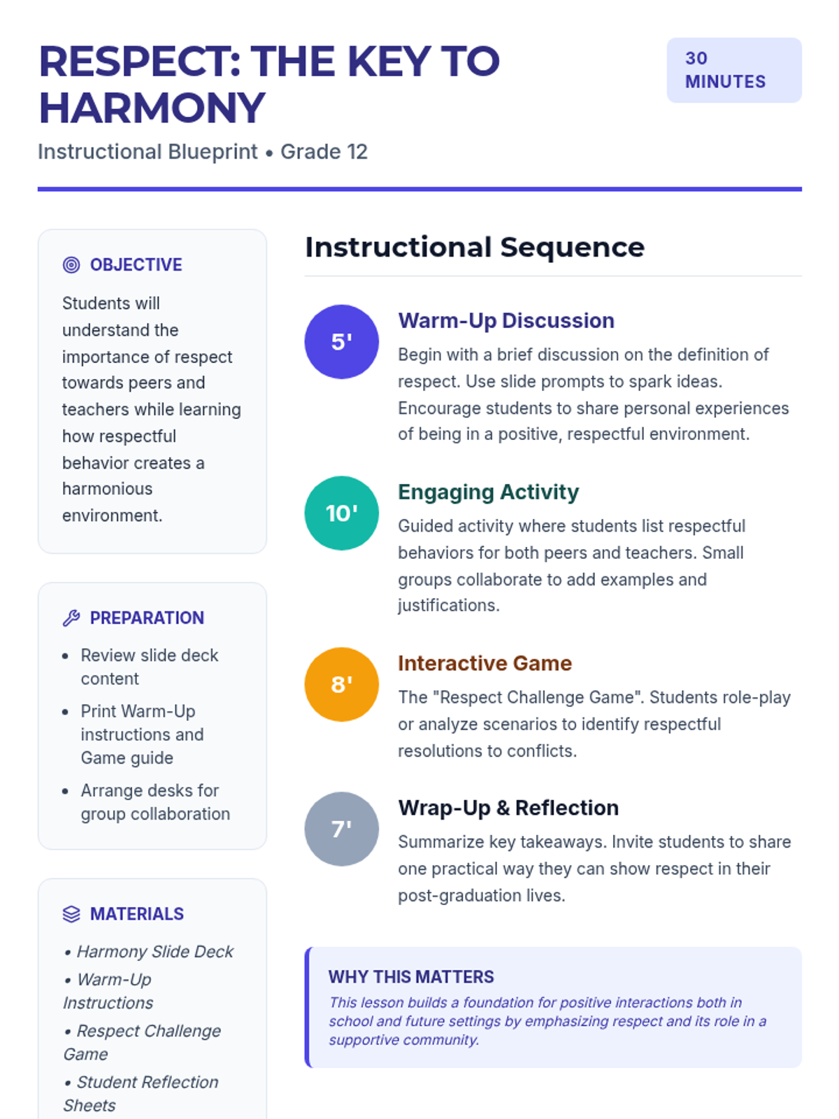 This 30-minute lesson for 12th graders focuses on the foundational role of respect in creating harmonious environments. Students will explore respectful communication, participate in a collaborative workshop, and engage in a scenario-based game to prepare for respectful interactions in college, career, and beyond.