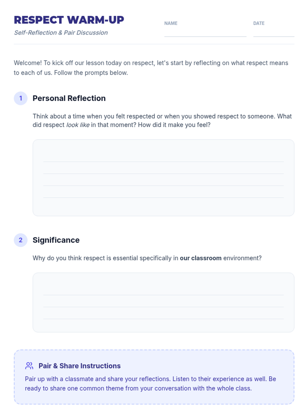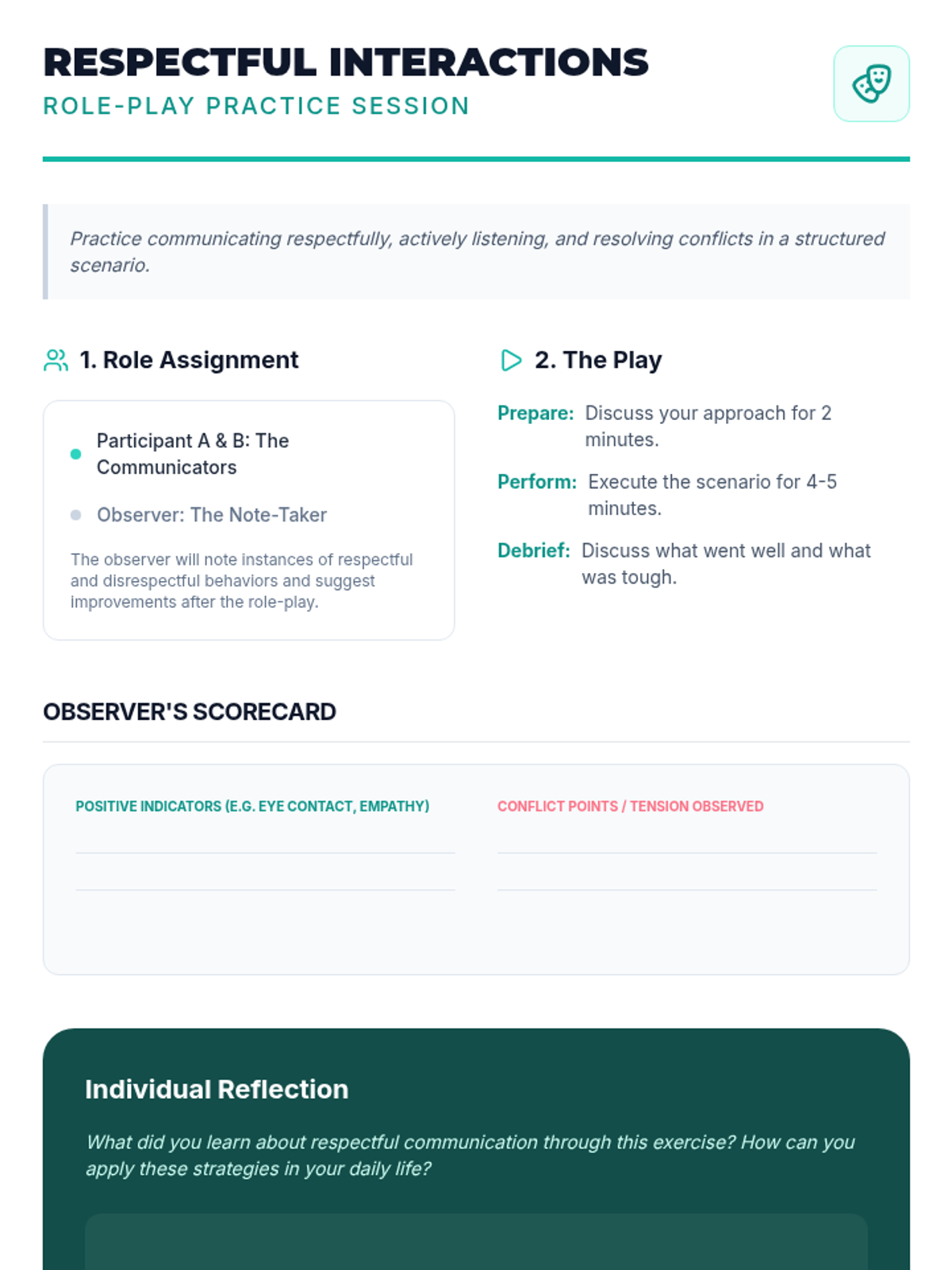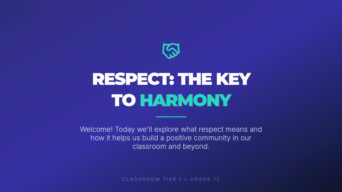 This 30-minute lesson for 12th graders focuses on the foundational role of respect in creating harmonious environments. Students will explore respectful communication, participate in a collaborative workshop, and engage in a scenario-based game to prepare for respectful interactions in college, career, and beyond.