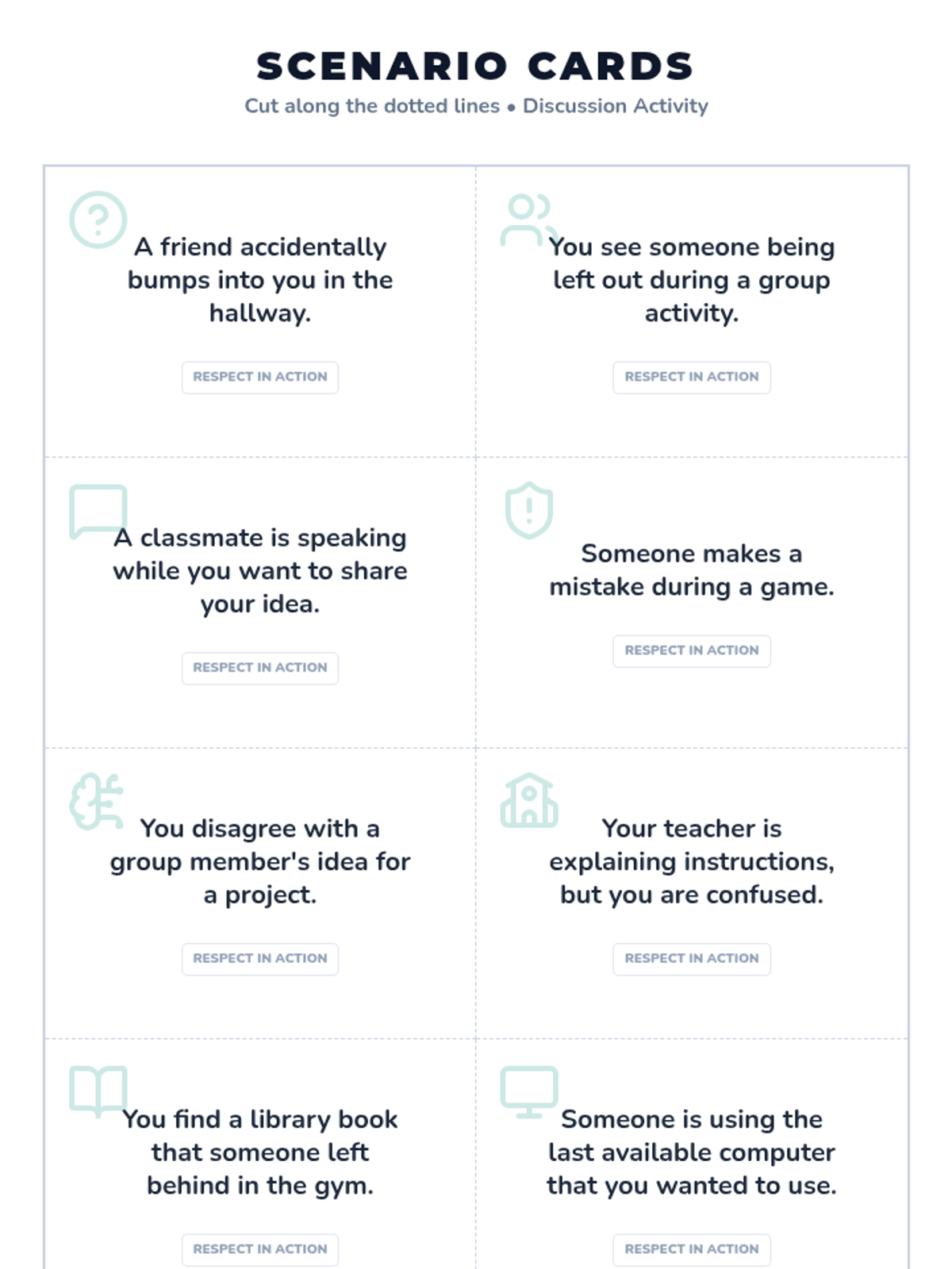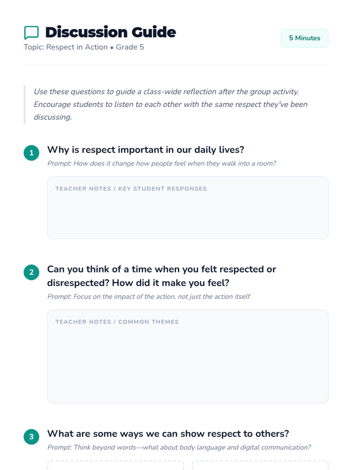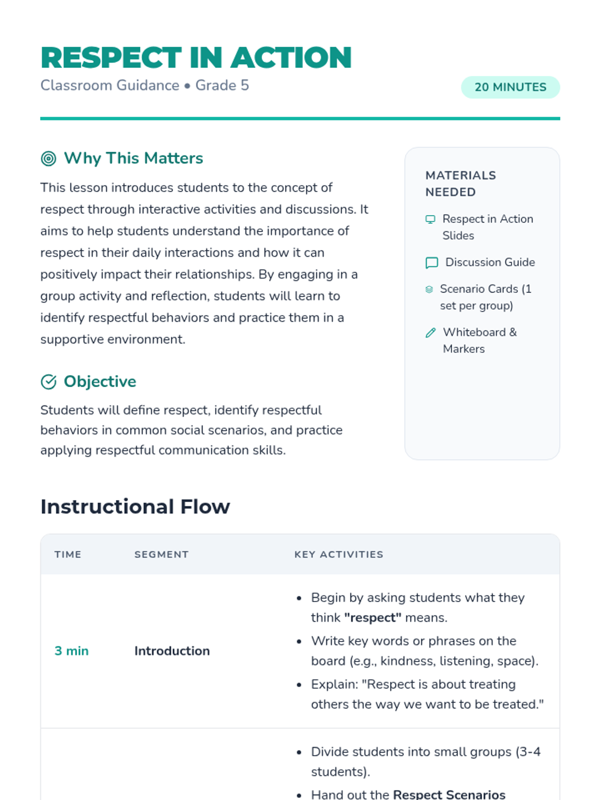 This interactive 20-minute lesson for 5th graders explores the concept of respect through scenario-based discussions and reflection. Students learn to identify respectful behaviors and understand how they foster positive relationships in their community.