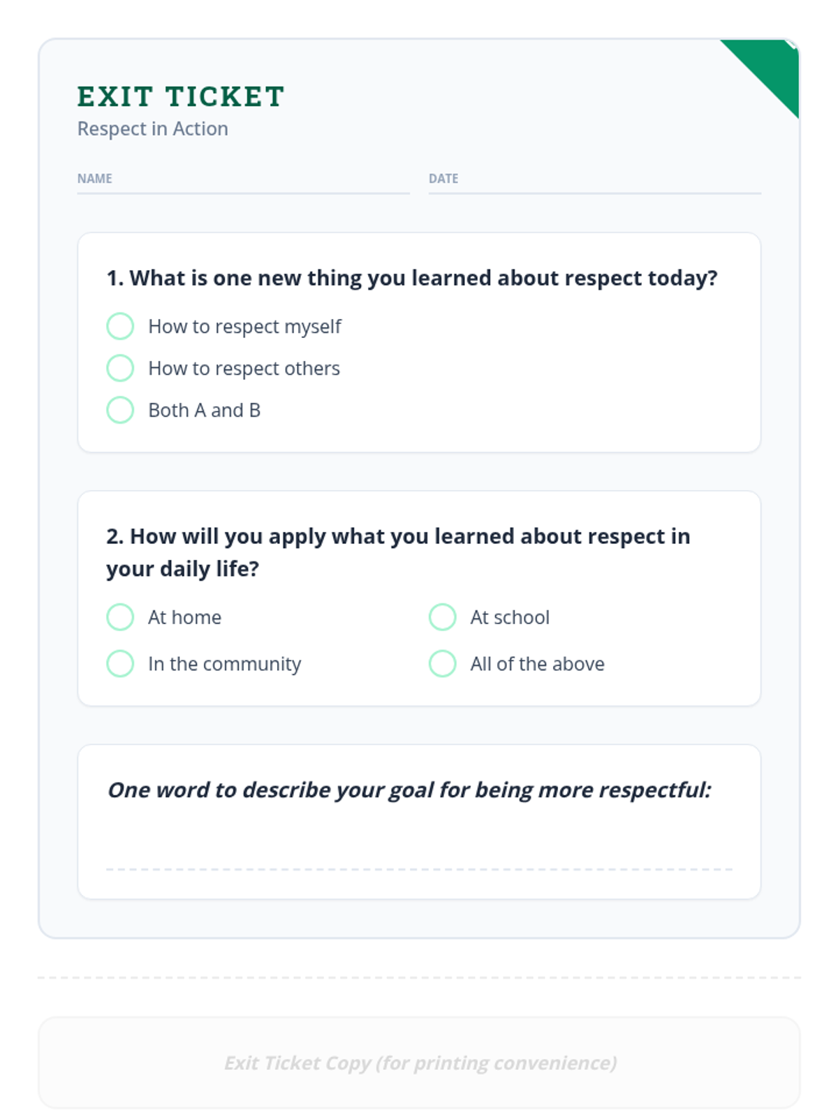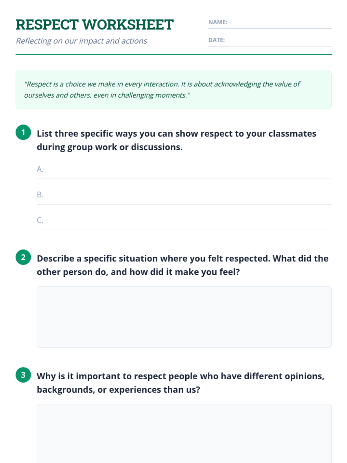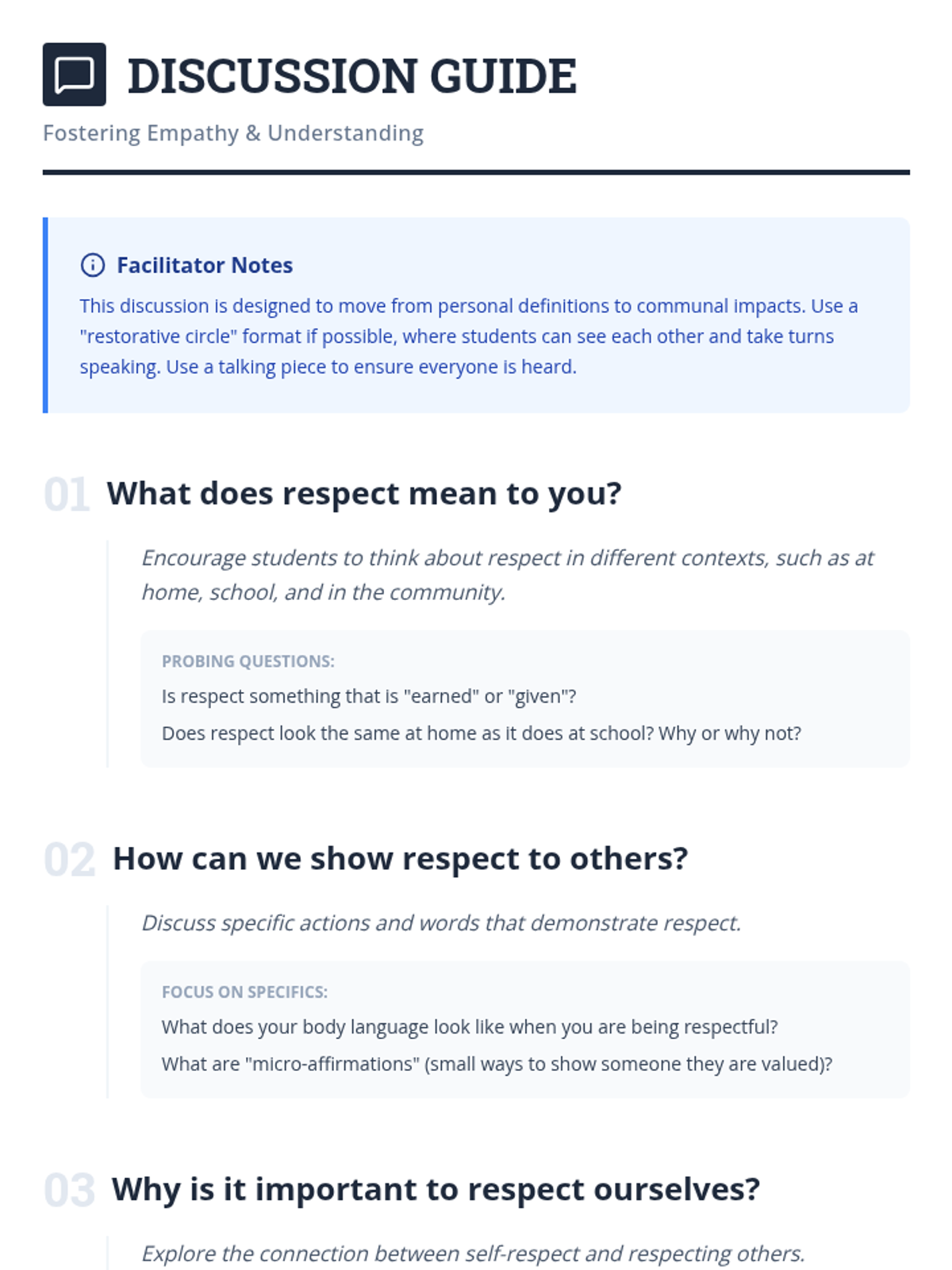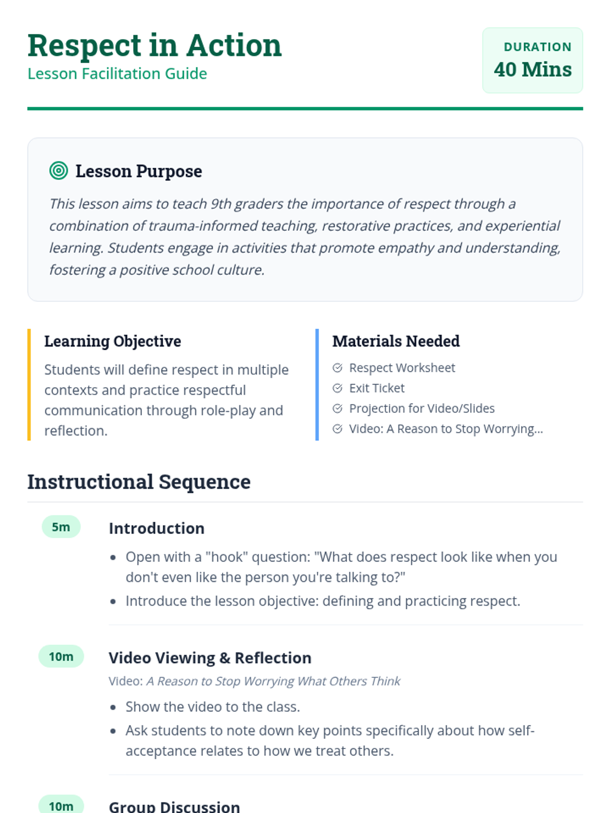 A 40-minute lesson for 9th graders exploring respect through trauma-informed and restorative lenses, featuring a video reflection, group discussion, and role-playing activities.